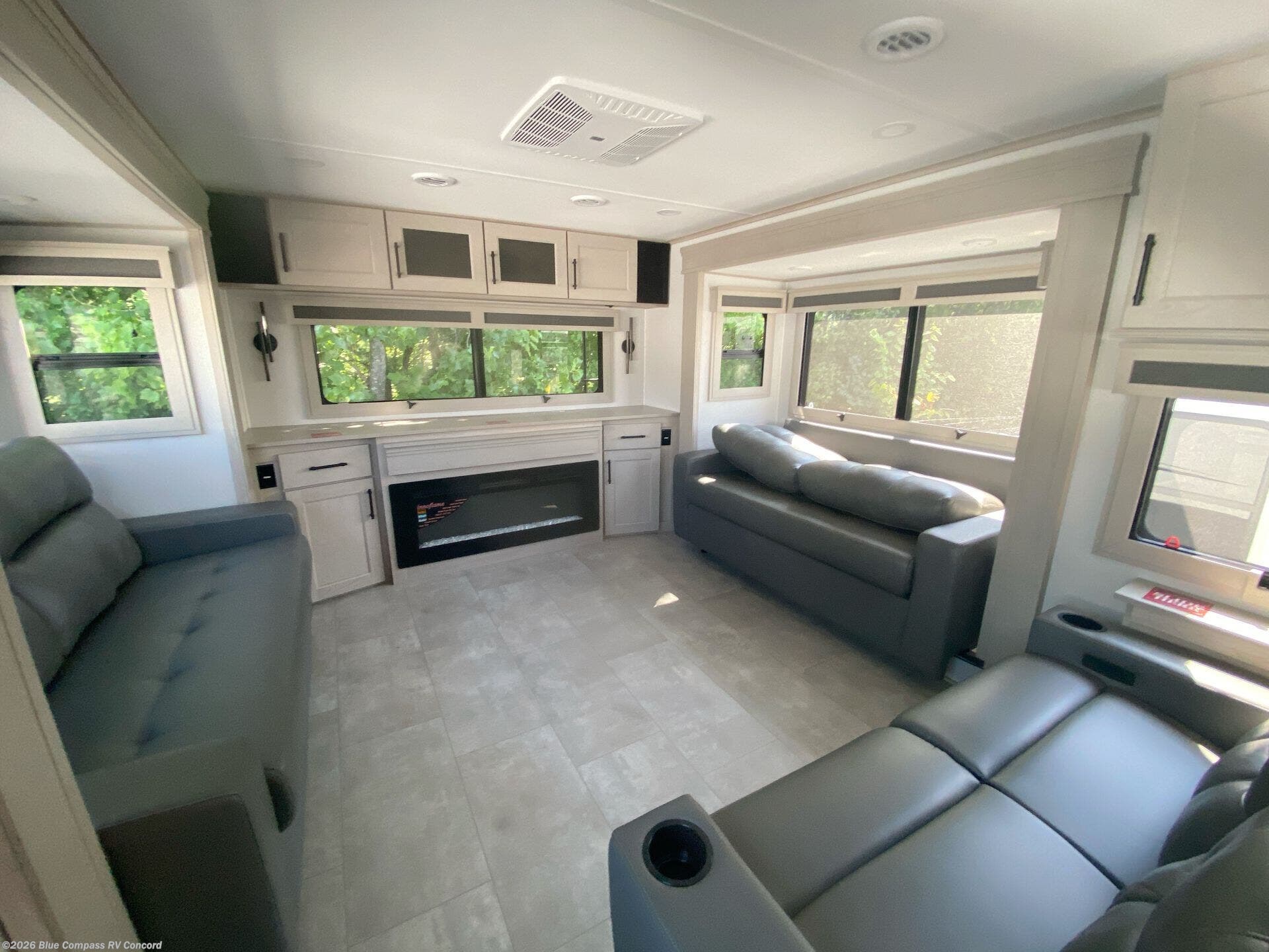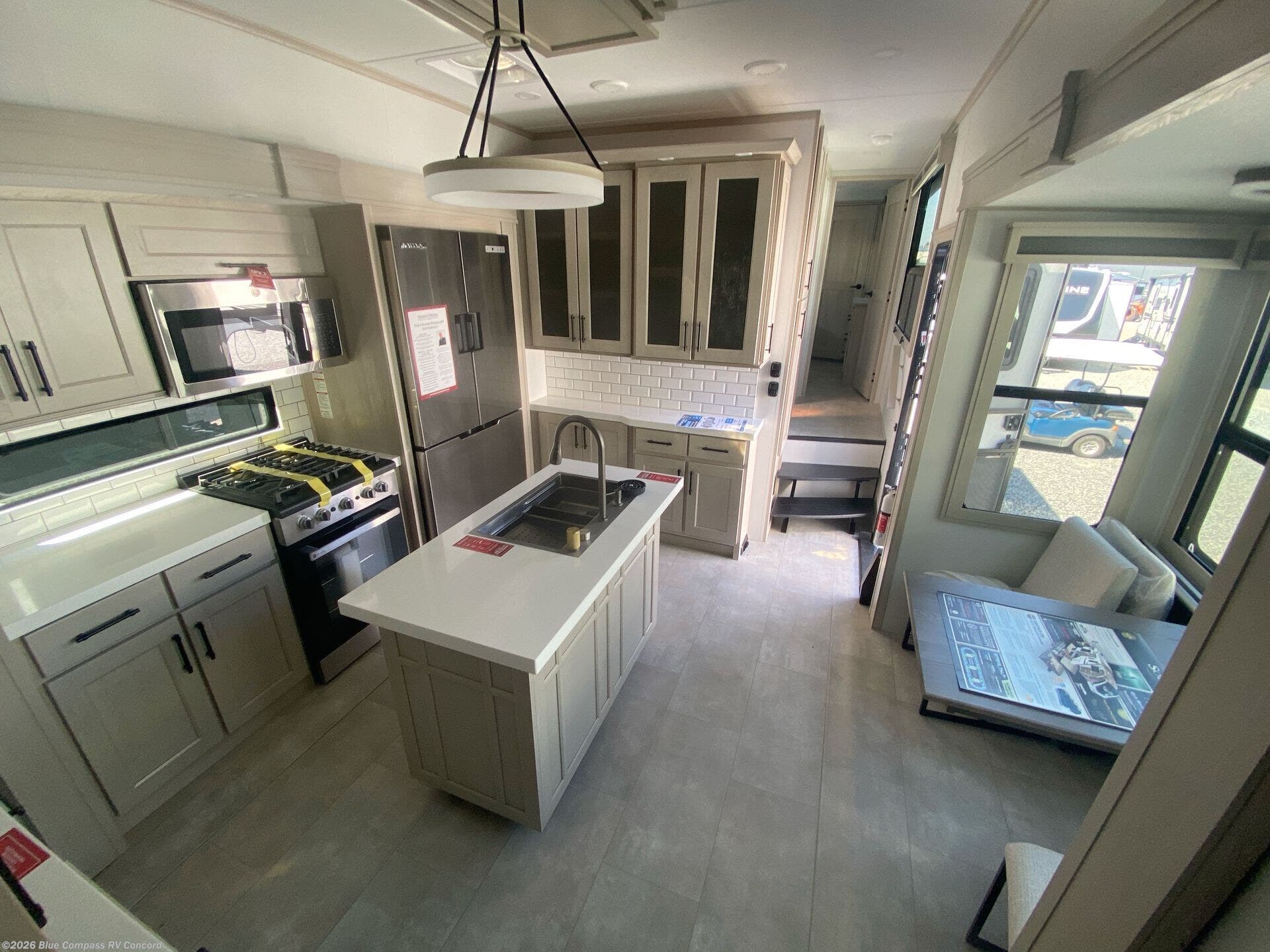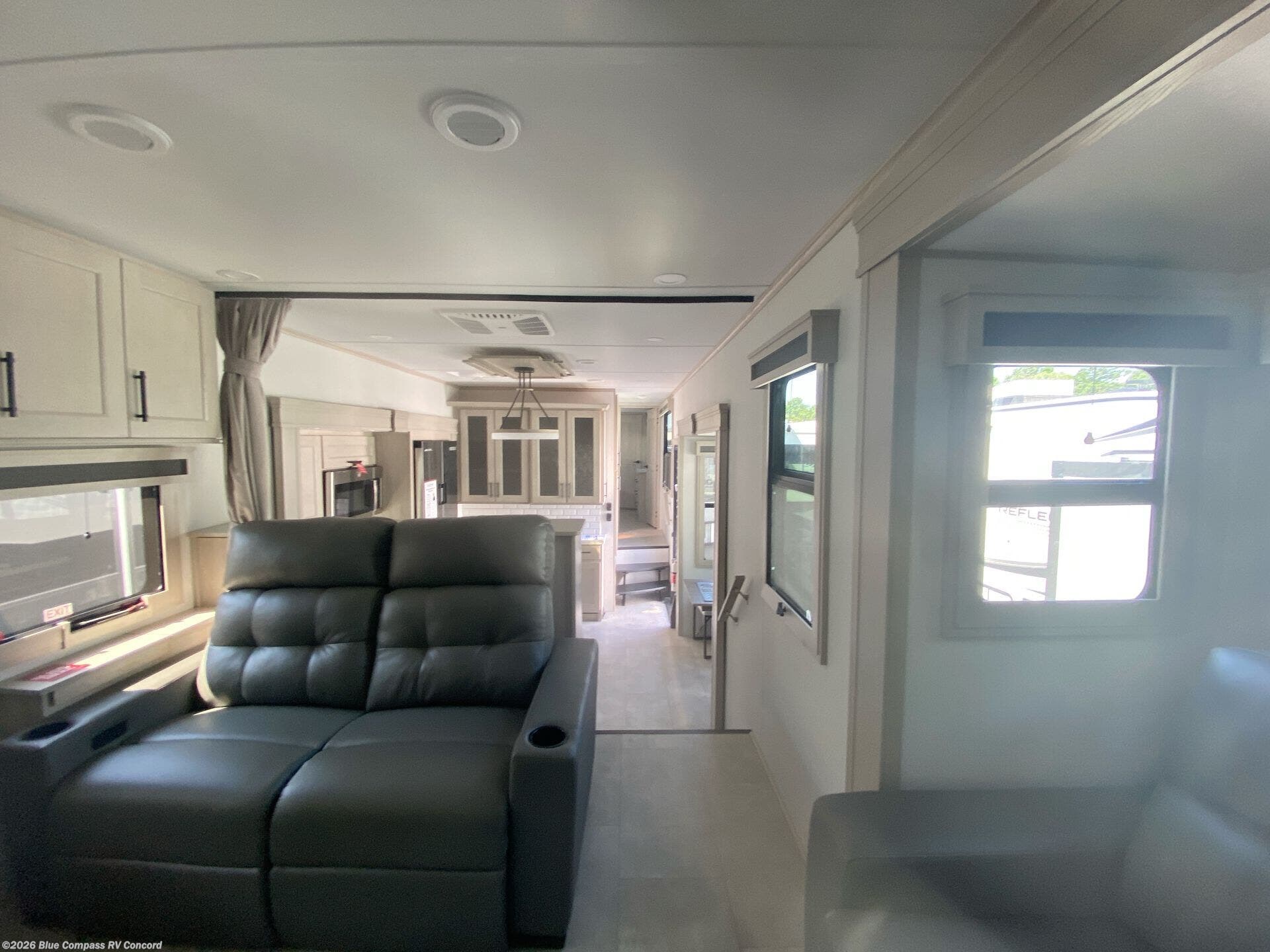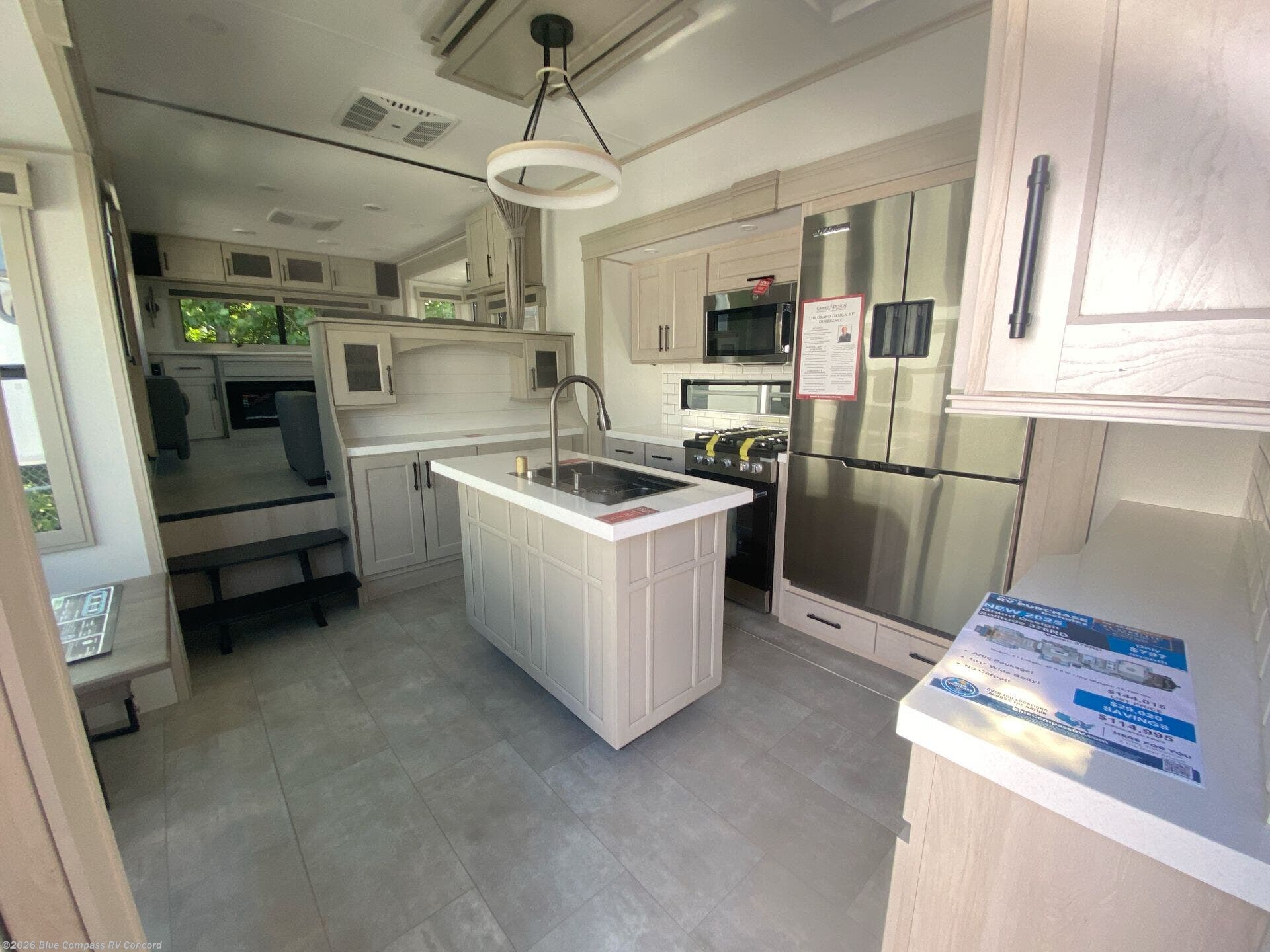Each minute spent in this spacious fifth wheel will feel just like home! The rear living area includes a rear entertainment center with an LED Smart TV and a fireplace, overhead cabinets, theater seating, plus two tri-fold sofas for your guests to sleep on. You will have the front private bedroom all to yourselves with a queen bed slide out that can be switched out for an optional king bed, and the front closet provides all the space you need to store your belongings. This model includes a spacious full bath plus dual bath sinks for ultimate convenience. The chef of your group will love the middle kitchen with its convenient island including double sinks, a residential cooktop and built-in oven, 20 cu. ft. refrigerator, and free-standing dinette. Head outdoors to find a 16' power awning with LED lights and middle pass through along with rear storage including a sliding tray, and you might want to add the optional pull-out kitchen.