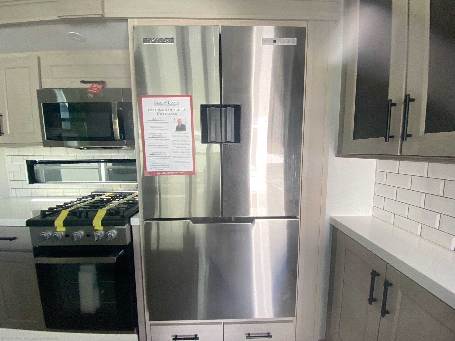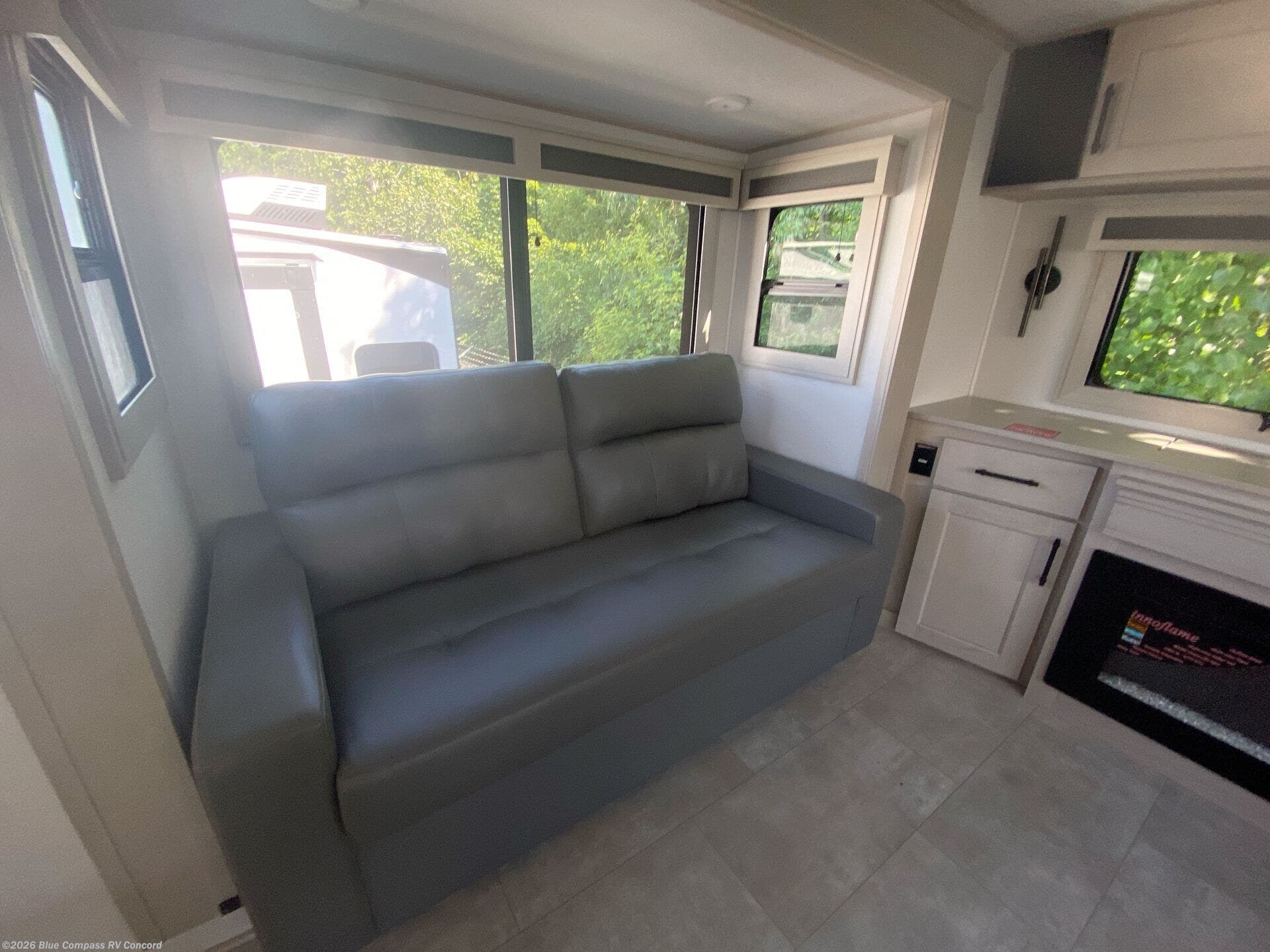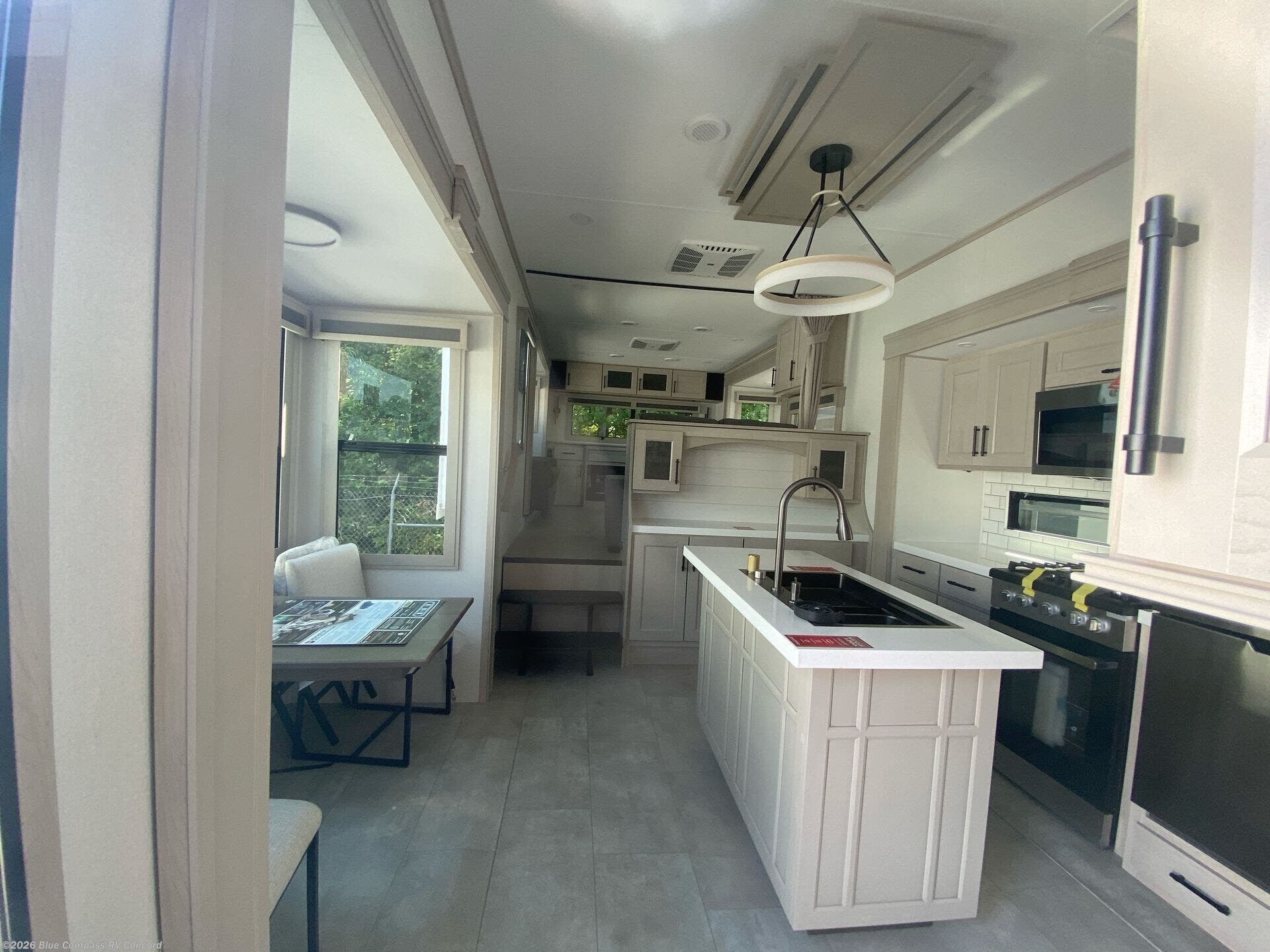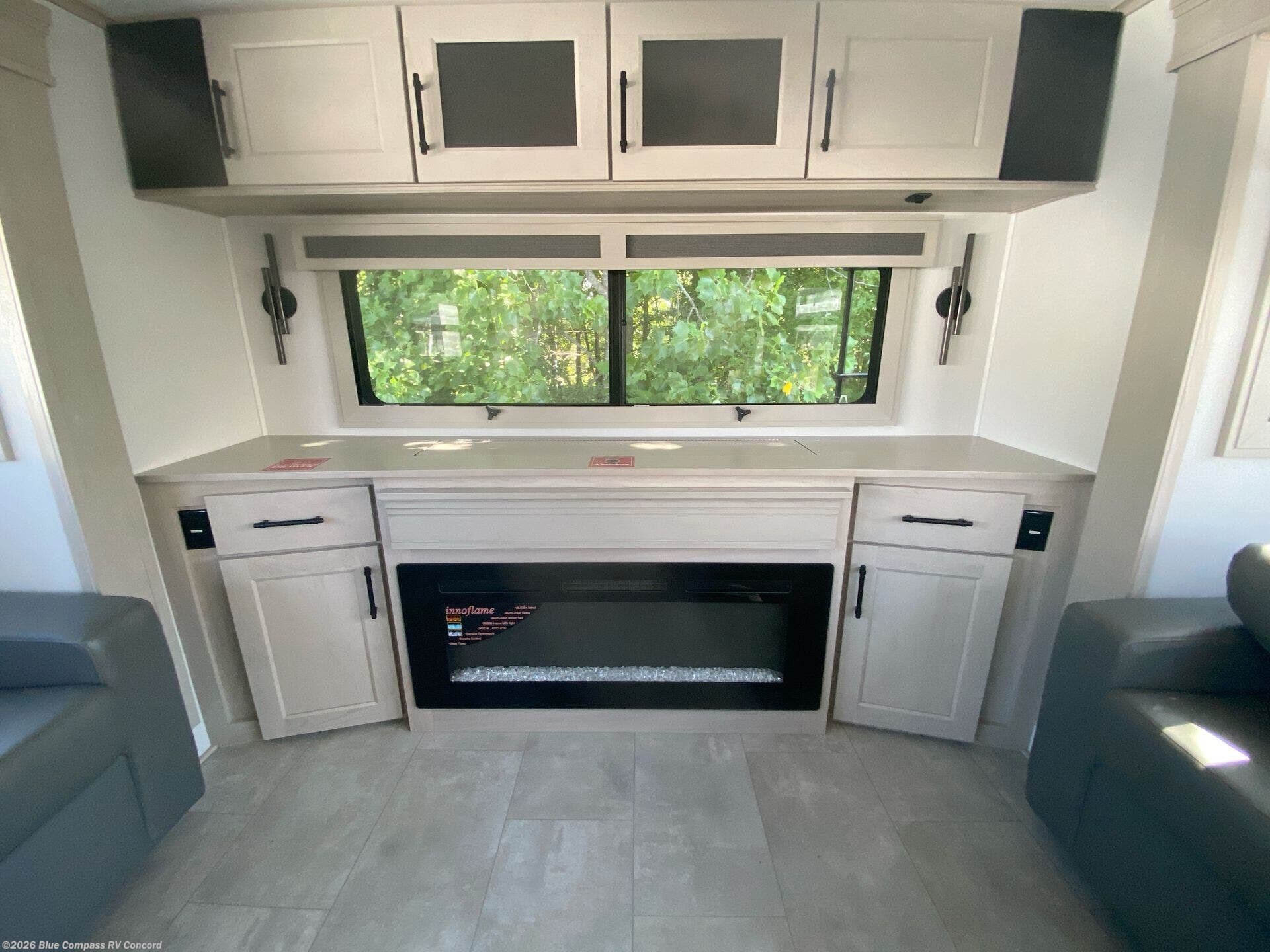 Each minute spent in this spacious fifth wheel will feel just like home! The rear living area includes a rear entertainment center with an LED Smart TV and a fireplace, overhead cabinets, theater seating, plus two tri-fold sofas for your guests to sleep on. You will have the front private bedroom all to yourselves with a queen bed slide out that can be switched out for an optional king bed, and the front closet provides all the space you need to store your belongings. This model includes a spacious full bath plus dual bath sinks for ultimate convenience. The chef of your group will love the middle kitchen with its convenient island including double sinks, a residential cooktop and built-in oven, 20 cu. ft. refrigerator, and free-standing dinette. Head outdoors to find a 16' power awning with LED lights and middle pass through along with rear storage including a sliding tray, and you might want to add the optional pull-out kitchen.