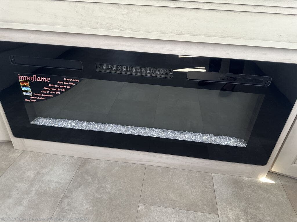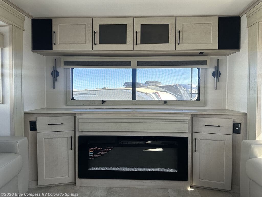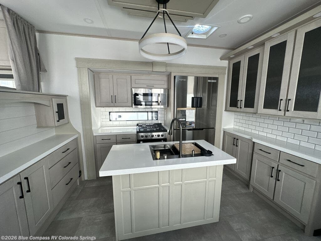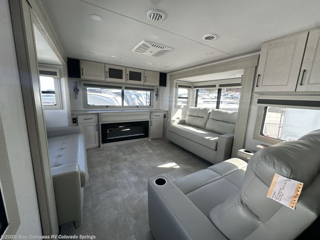 Each minute spent in this spacious fifth wheel will feel just like home! The rear living area includes a rear entertainment center with an LED Smart TV and a fireplace, overhead cabinets, theater seating, plus two tri-fold sofas for your guests to sleep on. You will have the front private bedroom all to yourselves with a queen bed slide out that can be switched out for an optional king bed, and the front closet provides all the space you need to store your belongings. This model includes a spacious full bath plus dual bath sinks for ultimate convenience. The chef of your group will love the middle kitchen with its convenient island including double sinks, a residential cooktop and built-in oven, 20 cu. ft. refrigerator, and free-standing dinette. Head outdoors to find a 16' power awning with LED lights and middle pass through along with rear storage including a sliding tray, and you might want to add the optional pull-out kitchen.