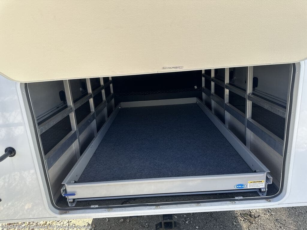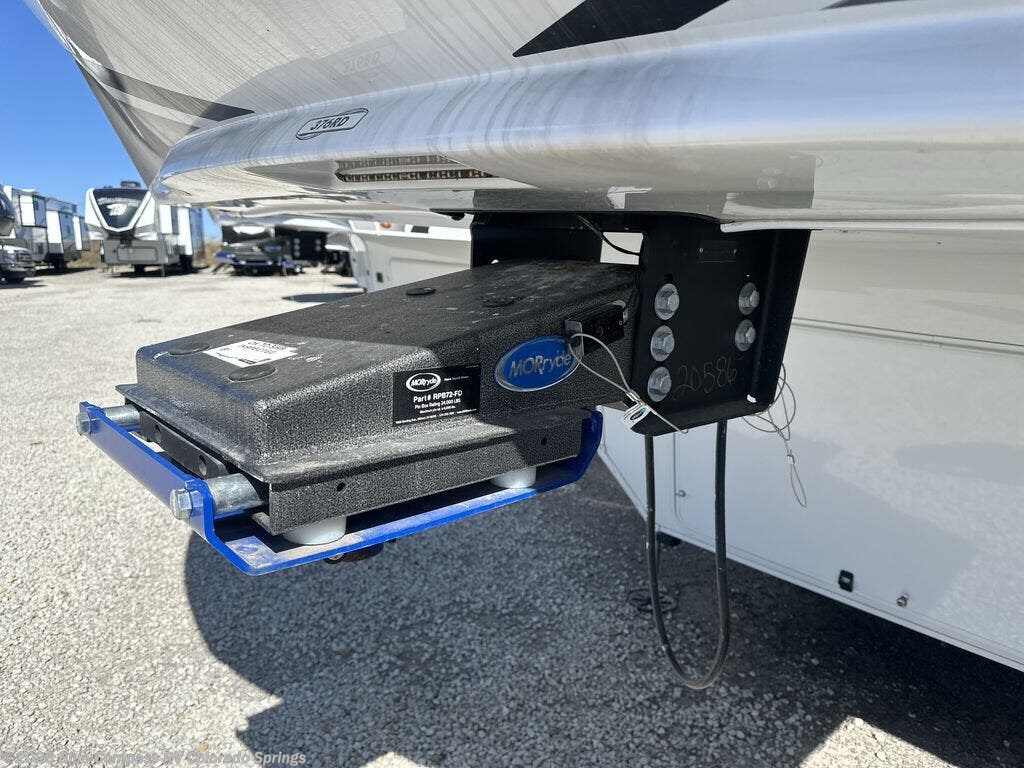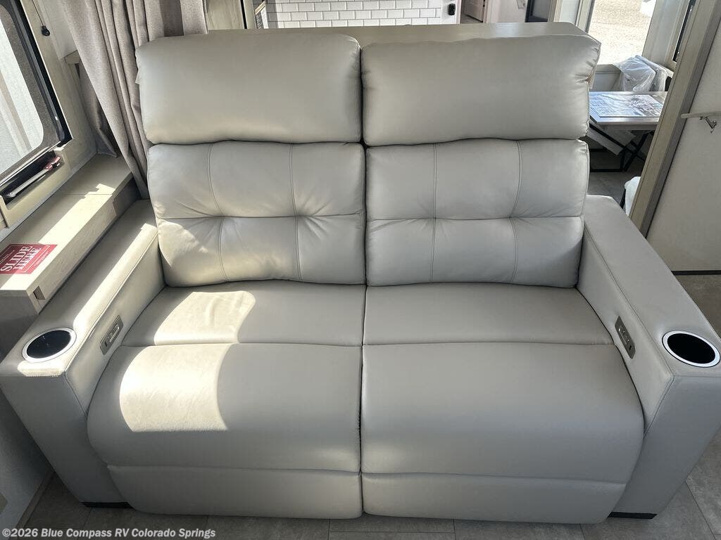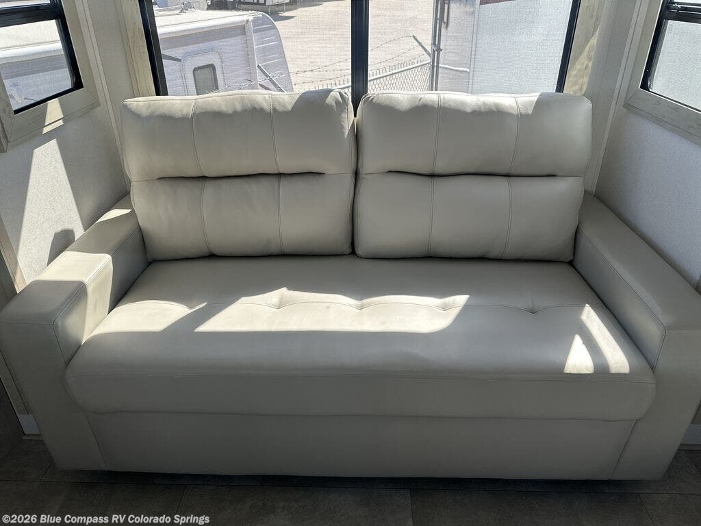 Each minute spent in this spacious fifth wheel will feel just like home! The rear living area includes a rear entertainment center with an LED Smart TV and a fireplace, overhead cabinets, theater seating, plus two tri-fold sofas for your guests to sleep on. You will have the front private bedroom all to yourselves with a queen bed slide out that can be switched out for an optional king bed, and the front closet provides all the space you need to store your belongings. This model includes a spacious full bath plus dual bath sinks for ultimate convenience. The chef of your group will love the middle kitchen with its convenient island including double sinks, a residential cooktop and built-in oven, 20 cu. ft. refrigerator, and free-standing dinette. Head outdoors to find a 16' power awning with LED lights and middle pass through along with rear storage including a sliding tray, and you might want to add the optional pull-out kitchen.