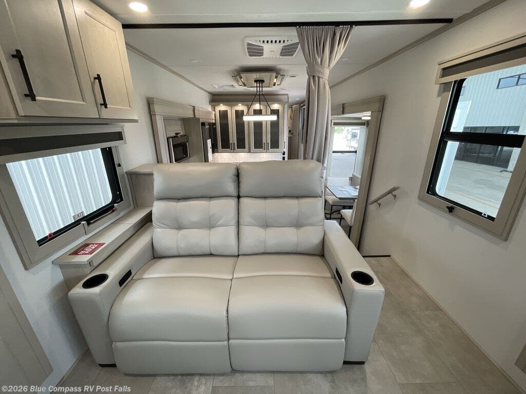 Each minute spent in this spacious fifth wheel will feel just like home! The rear living area includes a rear entertainment center with an LED Smart TV and a fireplace, overhead cabinets, theater seating, plus two tri-fold sofas for your guests to sleep on. You will have the front private bedroom all to yourselves with a queen bed slide out that can be switched out for an optional king bed, and the front closet provides all the space you need to store your belongings. This model includes a spacious full bath plus dual bath sinks for ultimate convenience. The chef of your group will love the middle kitchen with its convenient island including double sinks, a residential cooktop and built-in oven, 20 cu. ft. refrigerator, and free-standing dinette. Head outdoors to find a 16' power awning with LED lights and middle pass through along with rear storage including a sliding tray, and you might want to add the optional pull-out kitchen.