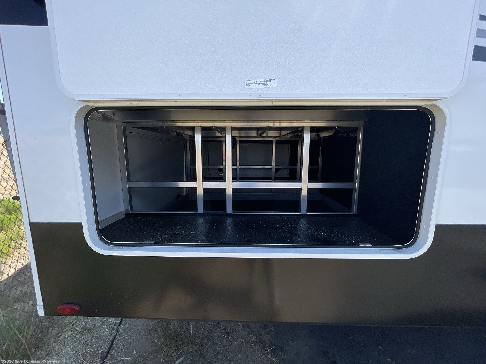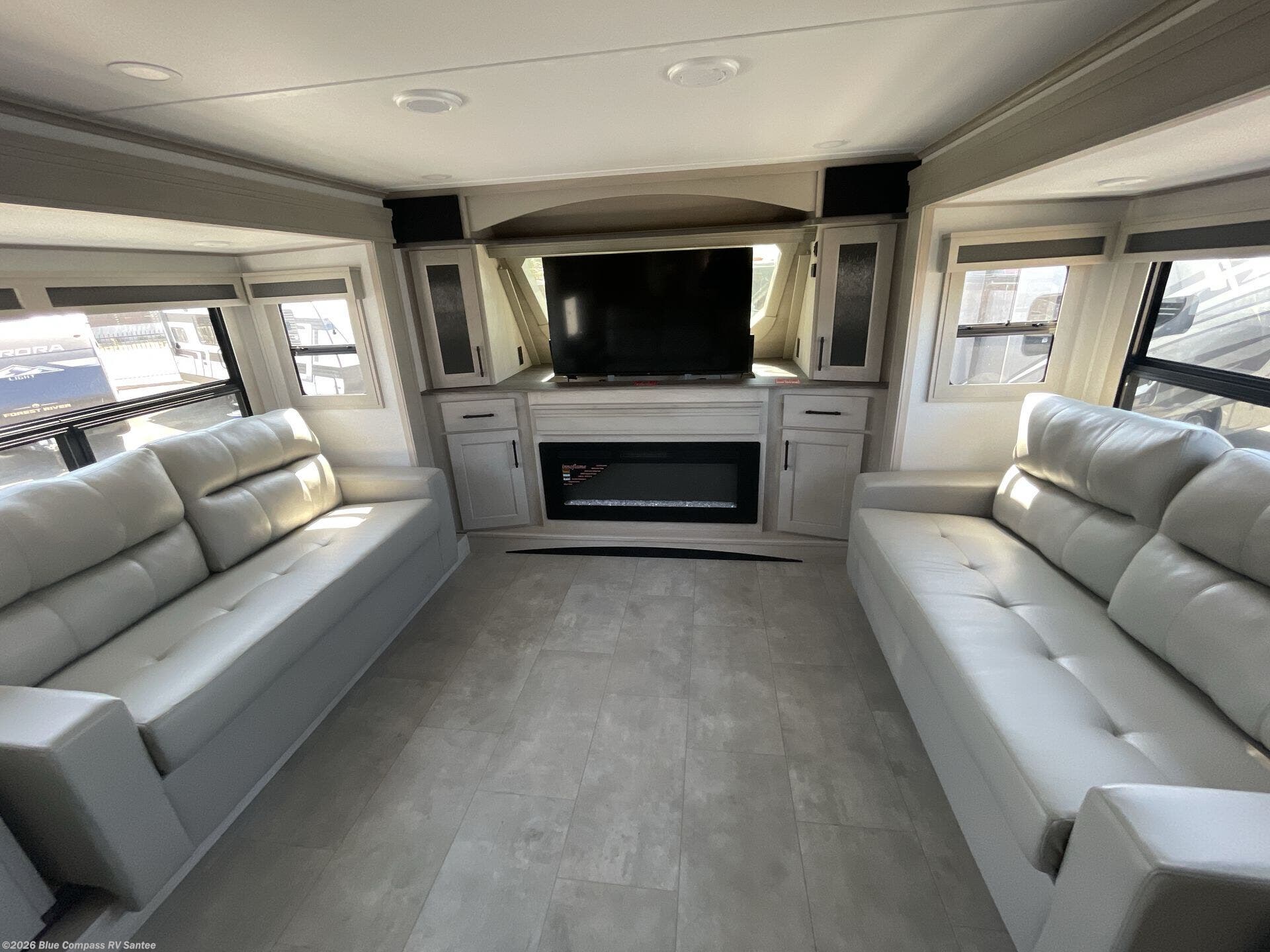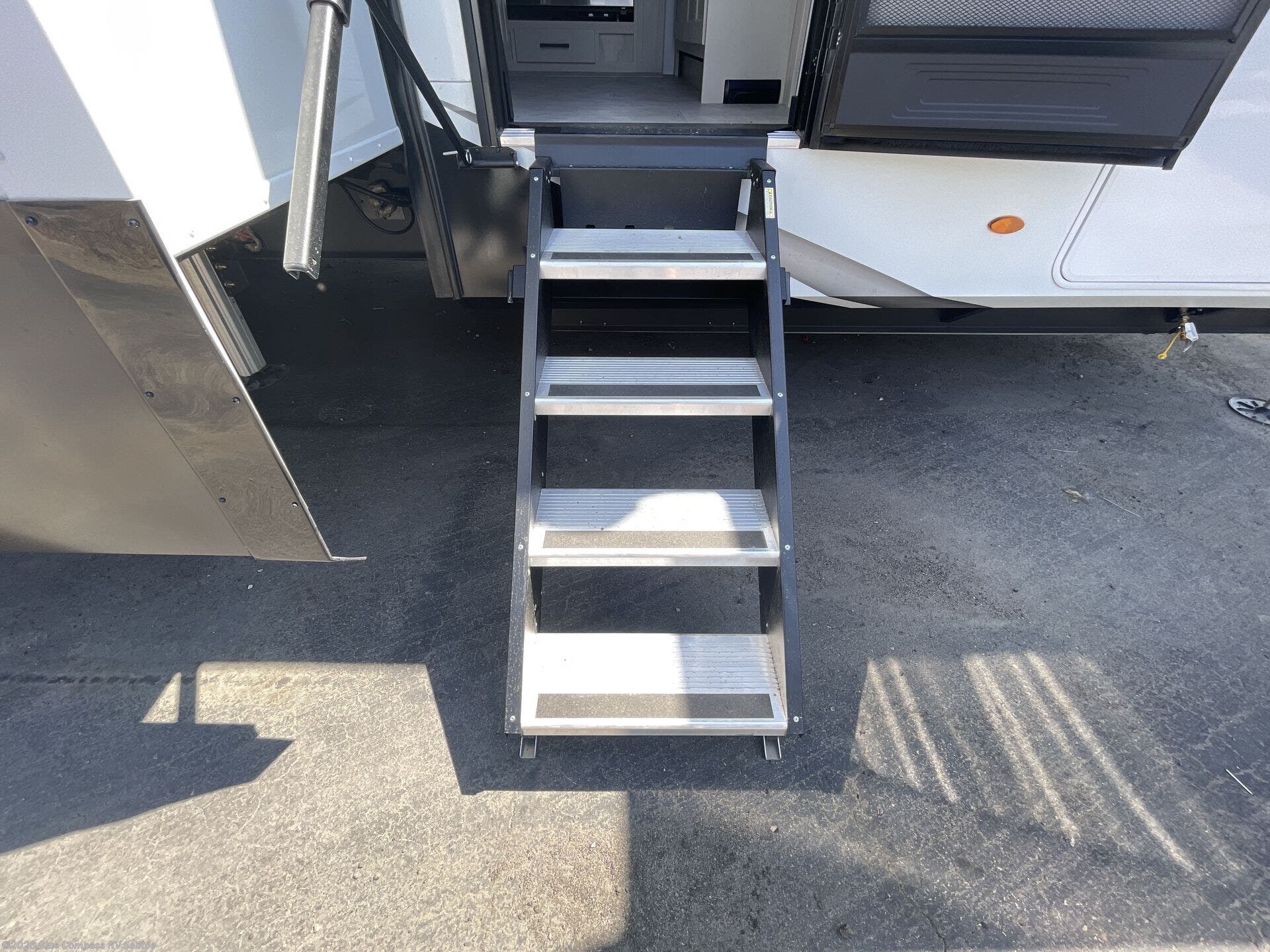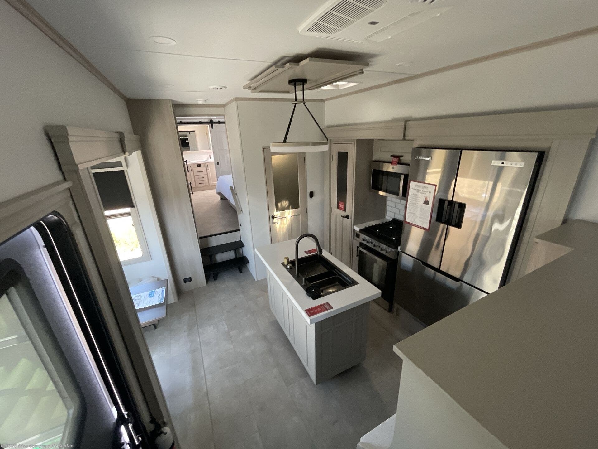 Five slide outs, a full bathroom with dual sinks, a half bath off of the kitchen, and a separate front living room and entertainment area are a few reasons you will enjoy your time spent in this fifth wheel! The separate kitchen is a dream with stainless steel appliances including a built-in oven, a pantry and hutch with counter space, a kitchen island plus a free-standing dinette slide with windows for great views. The entertainment center offers an LED Smart TV with a fireplace below and storage, and the dual opposing tri-fold sofas provide added sleeping space at night. The master bedroom includes a queen bed plus space savings sliding doors that lead you to the rear full bathroom with dual sinks, linen storage, and washer/dryer prep. The exterior has several storage choices as well including a pass-through compartment for fishing poles and such, plus the unique sliding tray in the rear allows you to bring along larger items such as camping tables, portable grills, golf clubs, totes and more.