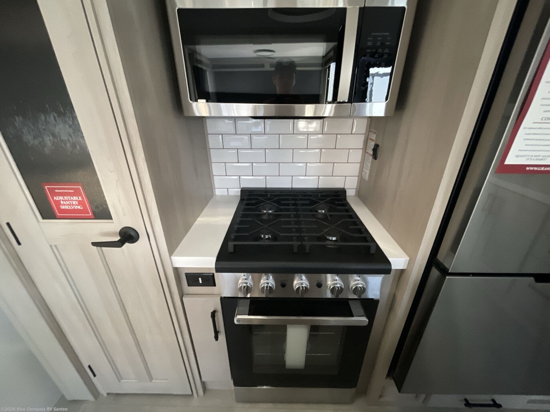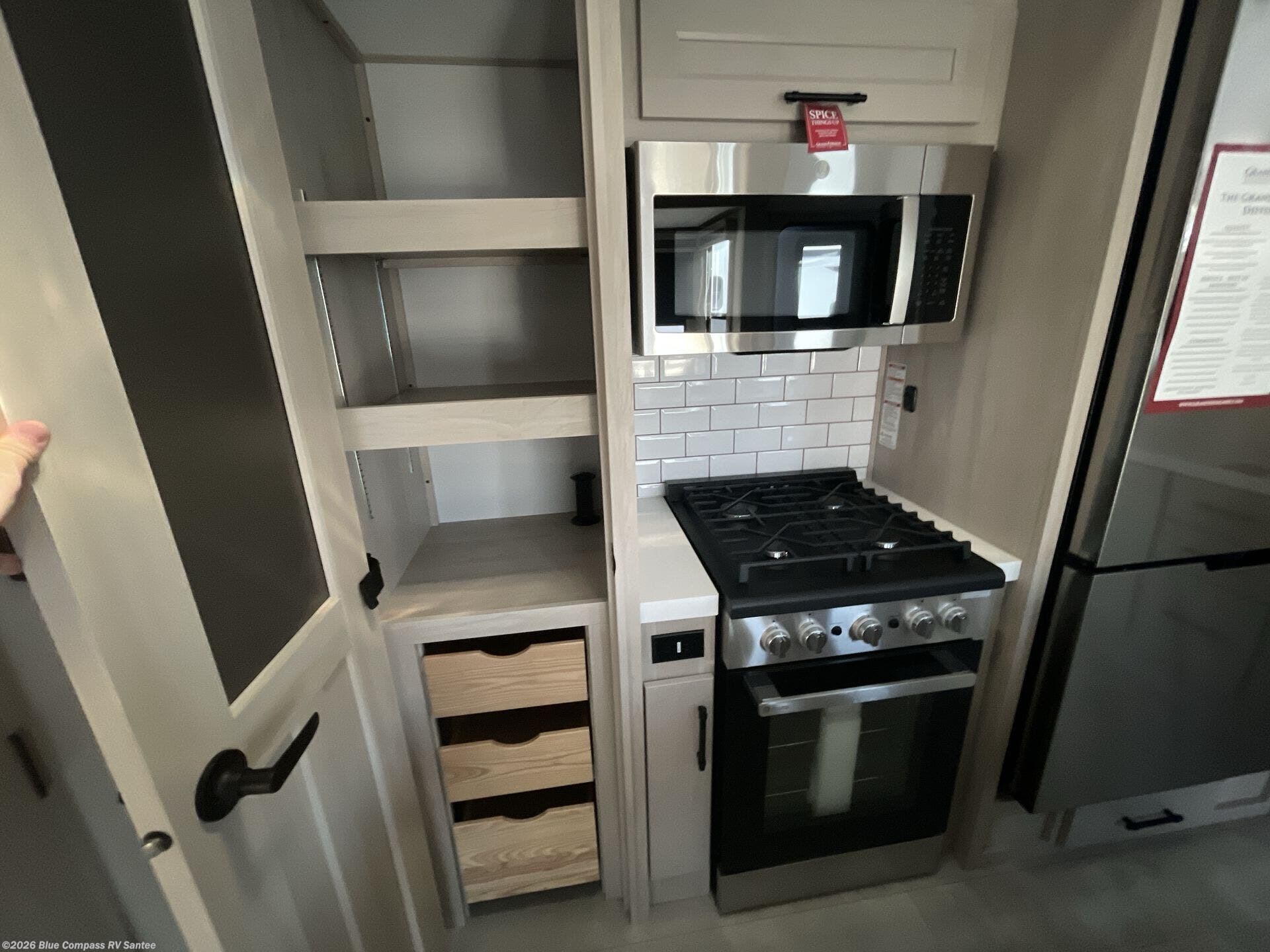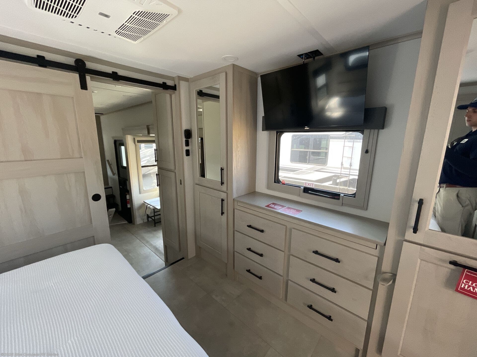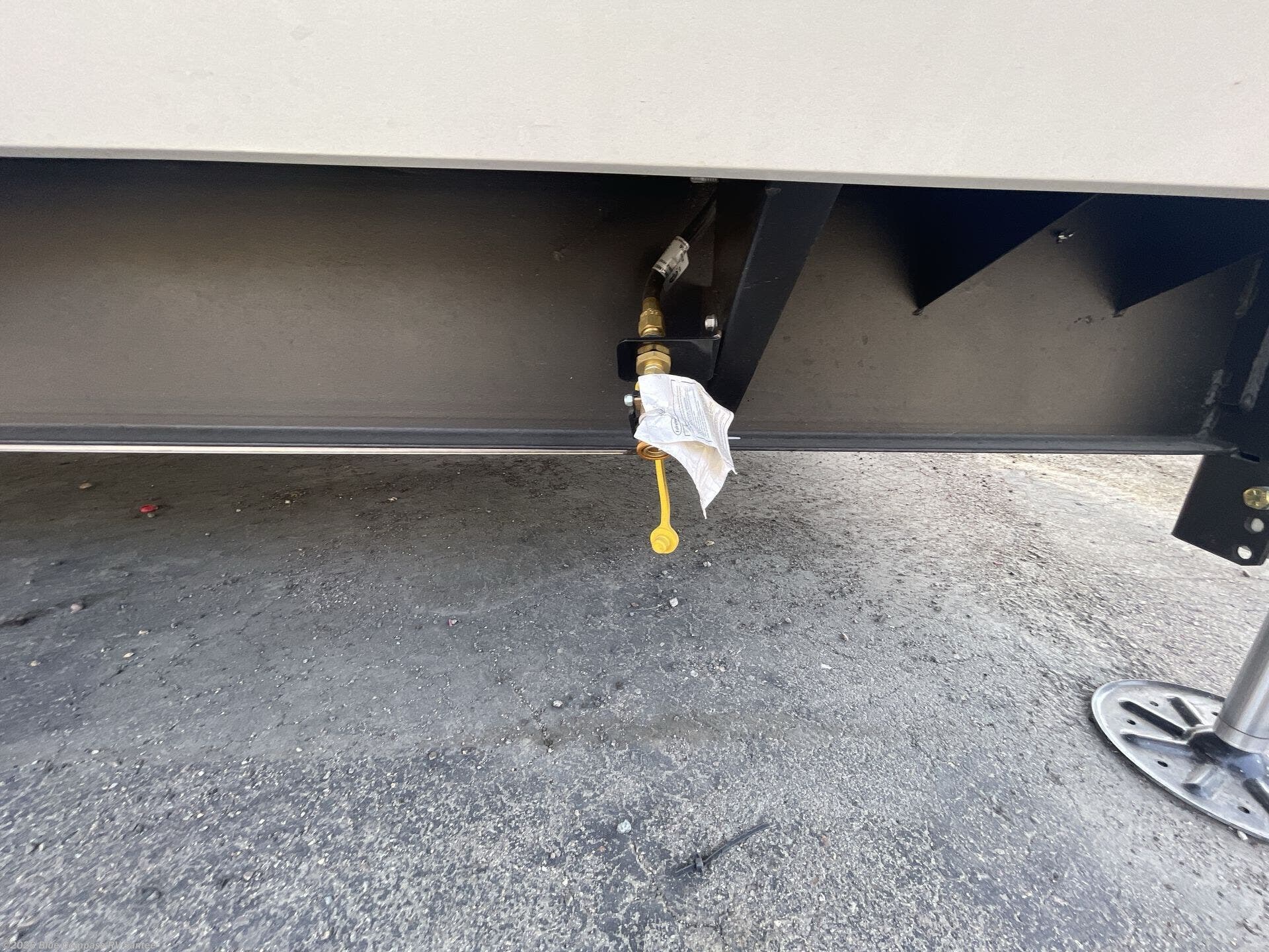 Five slide outs, a full bathroom with dual sinks, a half bath off of the kitchen, and a separate front living room and entertainment area are a few reasons you will enjoy your time spent in this fifth wheel! The separate kitchen is a dream with stainless steel appliances including a built-in oven, a pantry and hutch with counter space, a kitchen island plus a free-standing dinette slide with windows for great views. The entertainment center offers an LED Smart TV with a fireplace below and storage, and the dual opposing tri-fold sofas provide added sleeping space at night. The master bedroom includes a queen bed plus space savings sliding doors that lead you to the rear full bathroom with dual sinks, linen storage, and washer/dryer prep. The exterior has several storage choices as well including a pass-through compartment for fishing poles and such, plus the unique sliding tray in the rear allows you to bring along larger items such as camping tables, portable grills, golf clubs, totes and more.