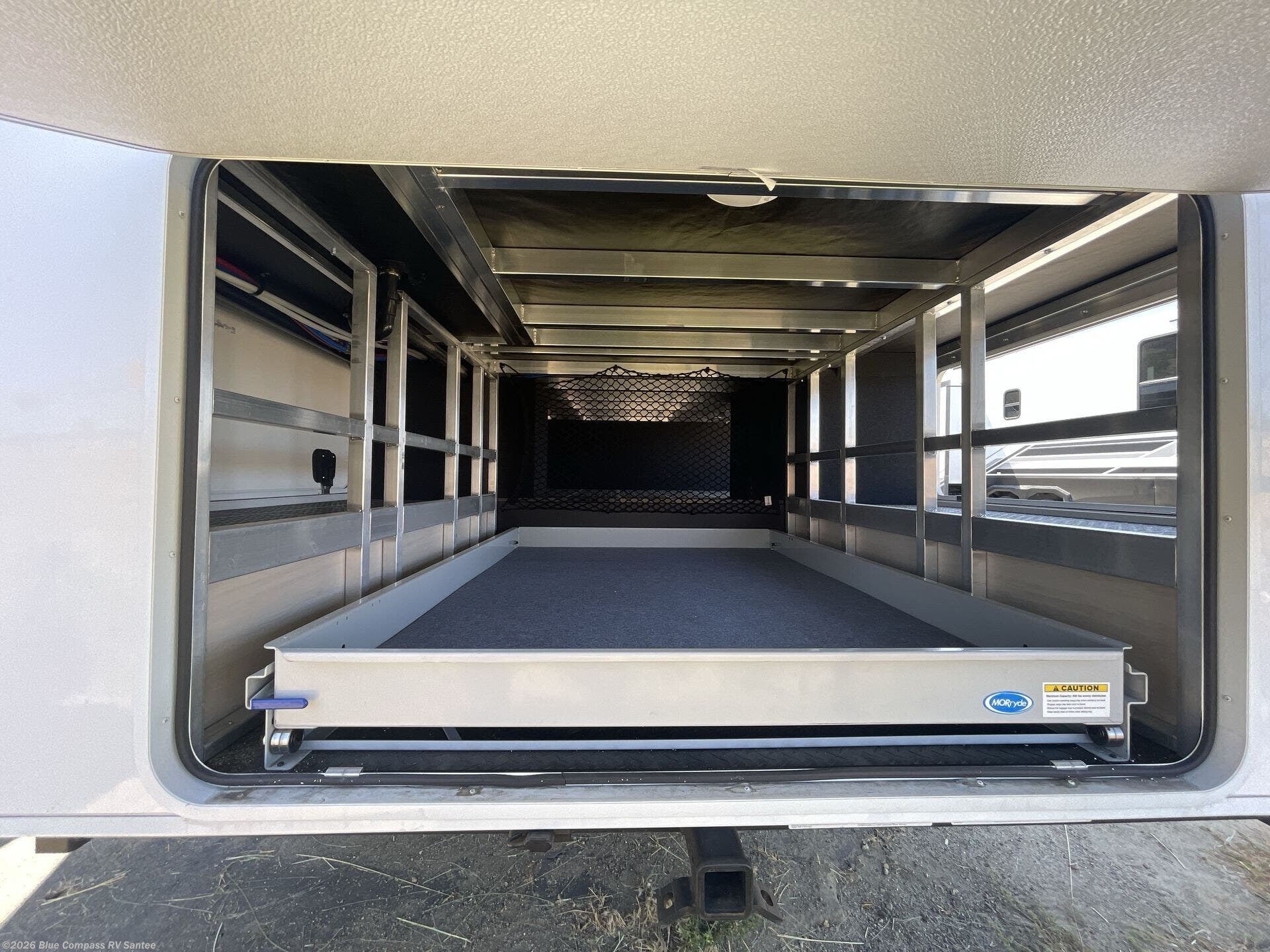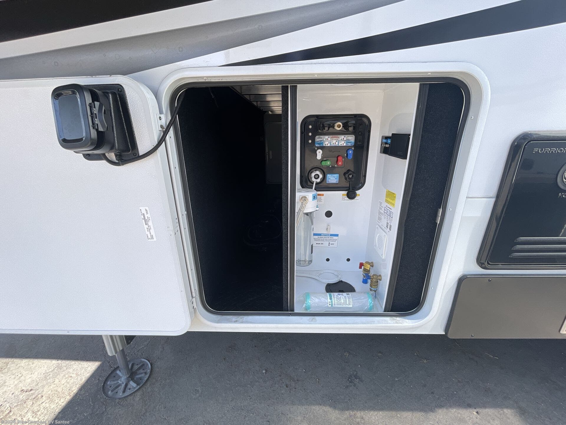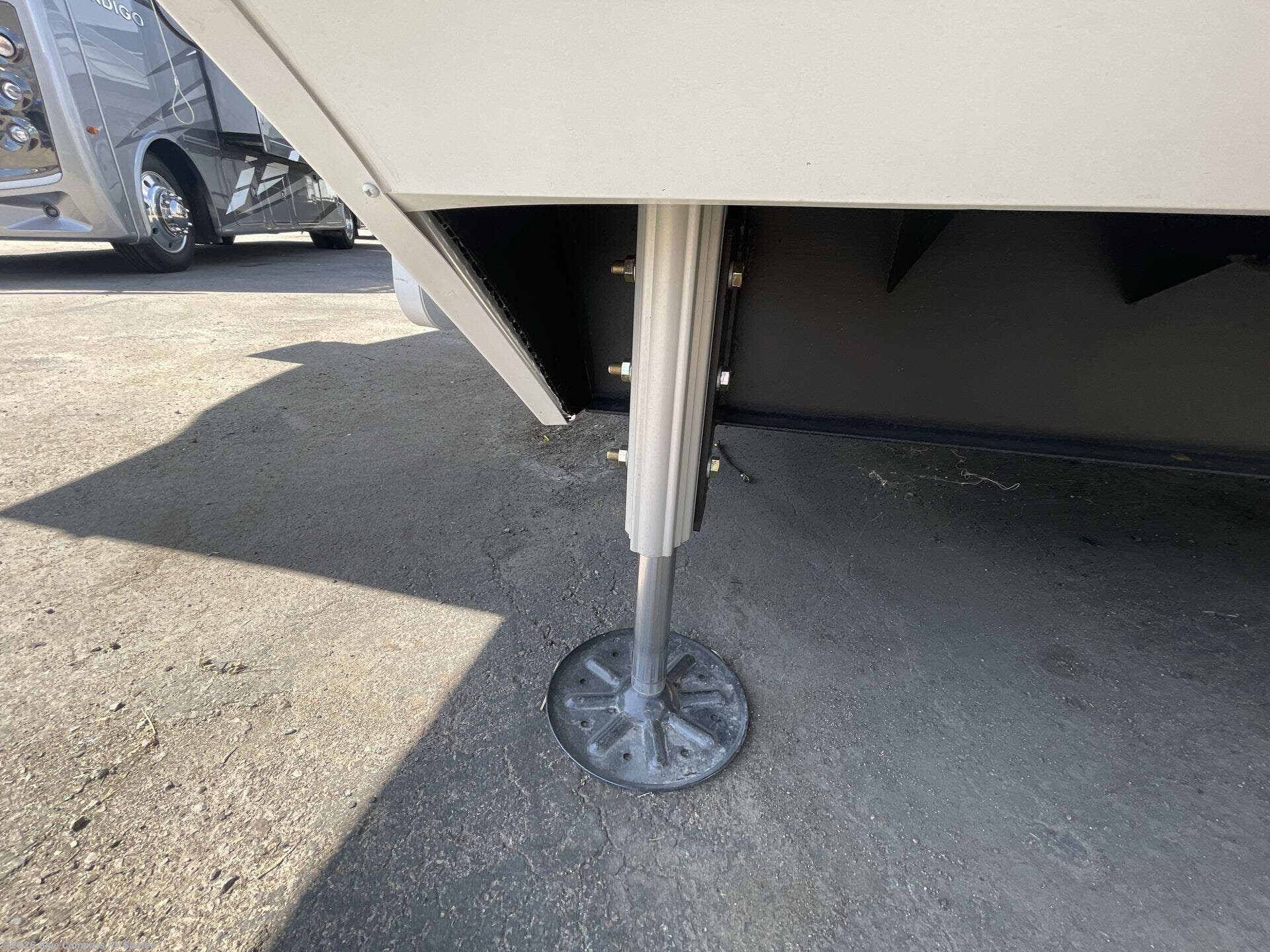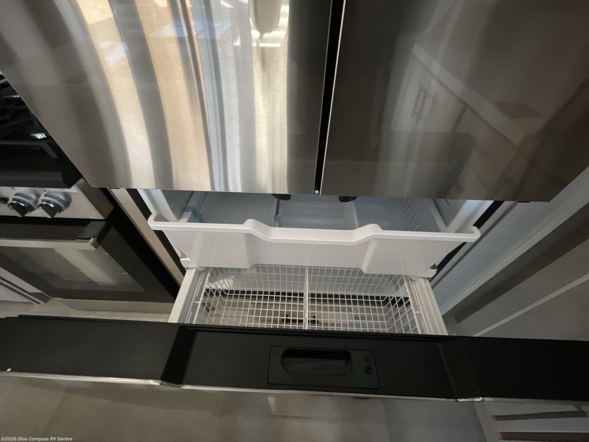 Five slide outs, a full bathroom with dual sinks, a half bath off of the kitchen, and a separate front living room and entertainment area are a few reasons you will enjoy your time spent in this fifth wheel! The separate kitchen is a dream with stainless steel appliances including a built-in oven, a pantry and hutch with counter space, a kitchen island plus a free-standing dinette slide with windows for great views. The entertainment center offers an LED Smart TV with a fireplace below and storage, and the dual opposing tri-fold sofas provide added sleeping space at night. The master bedroom includes a queen bed plus space savings sliding doors that lead you to the rear full bathroom with dual sinks, linen storage, and washer/dryer prep. The exterior has several storage choices as well including a pass-through compartment for fishing poles and such, plus the unique sliding tray in the rear allows you to bring along larger items such as camping tables, portable grills, golf clubs, totes and more.