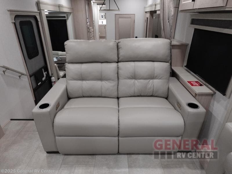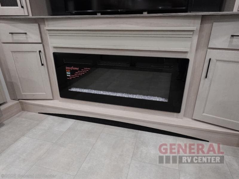 Five slide outs, a full bathroom with dual sinks, a half bath off of the kitchen, and a separate front living room and entertainment area are a few reasons you will enjoy your time spent in this fifth wheel! The separate kitchen is a dream with stainless steel appliances including a built-in oven, a pantry and hutch with counter space, a kitchen island plus a free-standing dinette slide with windows for great views. The entertainment center offers an LED Smart TV with a fireplace below and storage, and the dual opposing tri-fold sofas provide added sleeping space at night. The master bedroom includes a king bed plus space savings sliding doors that lead you to the rear full bathroom with dual sinks, linen storage, and washer/dryer prep. The exterior has several storage choices as well including a pass-through compartment for fishing poles and such, plus the unique sliding tray in the rear allows you to bring along larger items such as camping tables, portable grills, golf clubs, totes and more.