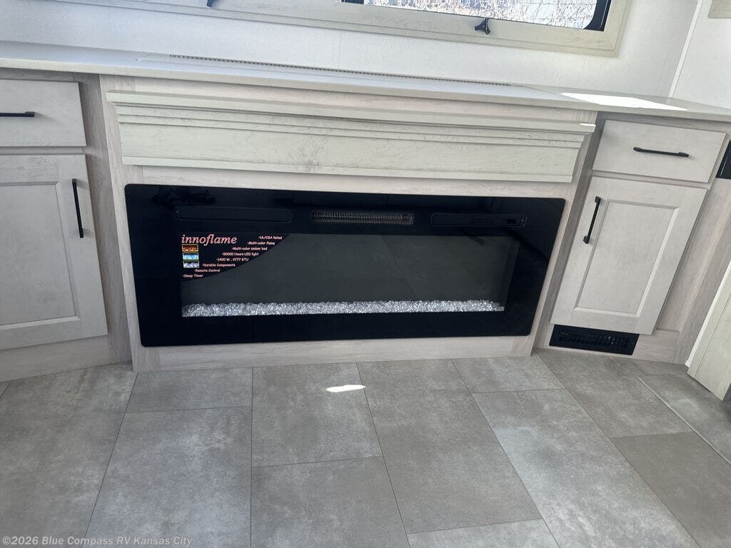 The whole gang will love camping in this spacious fifth wheel for five to six! You'll have your own bedroom up front with a queen bed slide out, a large front closet with a hamper and washer and dryer prep, plus a private entry door into the dual entry bath. Your guest can take the middle bedroom that includes a tri-fold sofa with a bunk above, a dresser/desk, plus a 50" TV for entertainment. A full kitchen includes an L-shaped counter, a 20 cu. ft. refrigerator, pull-out trash cans plus many more convenient features. And don't overlook the rear living area with its L-shaped sofa, theater seating, and free-standing dinette. There is also an entertainment center with a telescoping TV and a fireplace plus an electronics drawer to charge your phone or laptop.