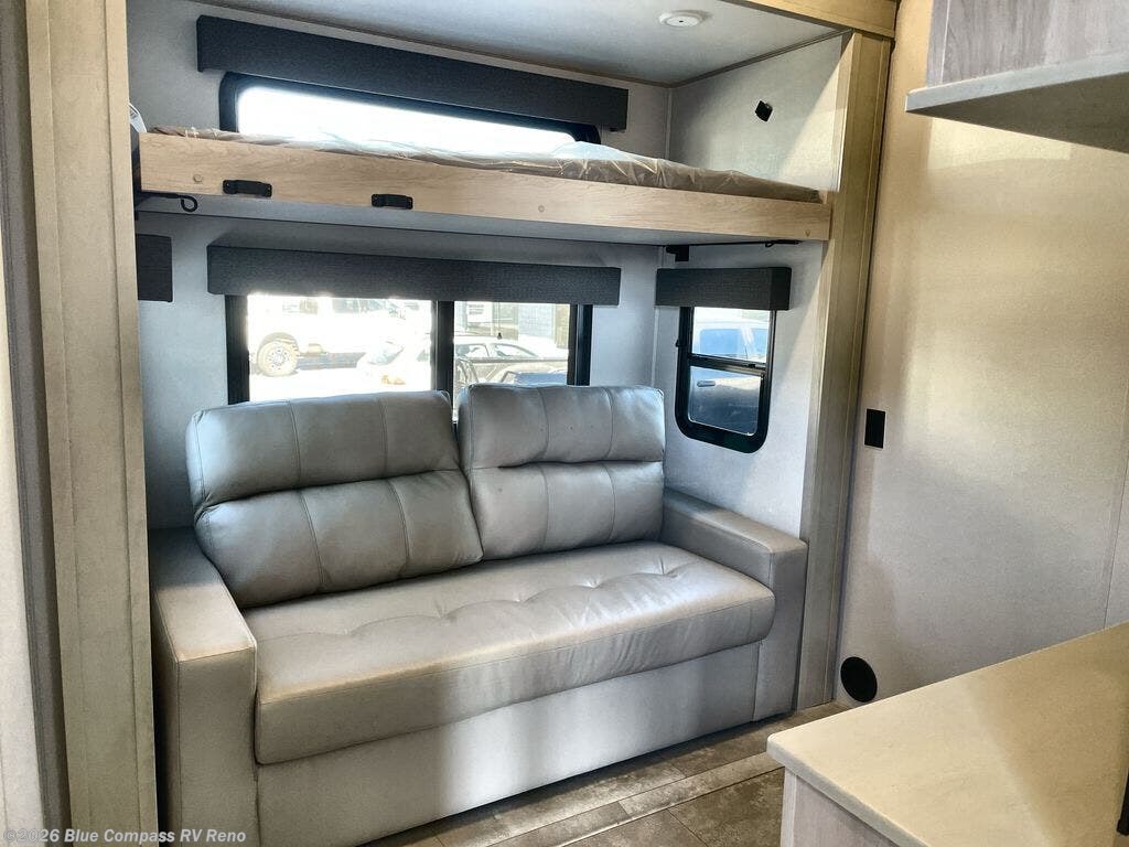The whole gang will love camping in this spacious fifth wheel for five to six! You'll have your own bedroom up front with a queen bed slide out, a large front closet with a hamper and washer and dryer prep, plus a private entry door into the dual entry bath. Your guest can take the middle bedroom that includes a tri-fold sofa with a bunk above, a dresser/desk, plus a 50" TV for entertainment. A full kitchen includes an L-shaped counter, a 20 cu. ft. refrigerator, pull-out trash cans plus many more convenient features. And don't overlook the rear living area with its L-shaped sofa, theater seating, and free-standing dinette. There is also an entertainment center with a telescoping TV and a fireplace plus an electronics drawer to charge your phone or laptop.