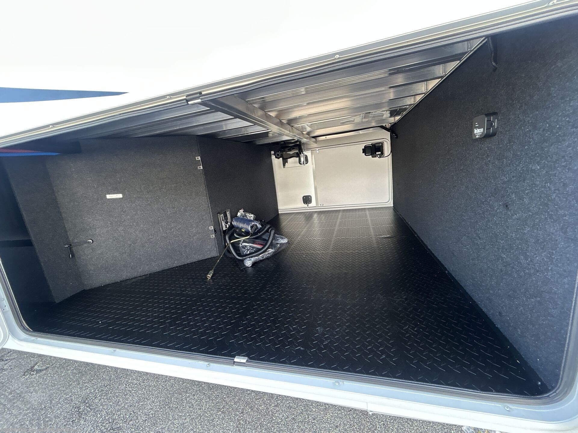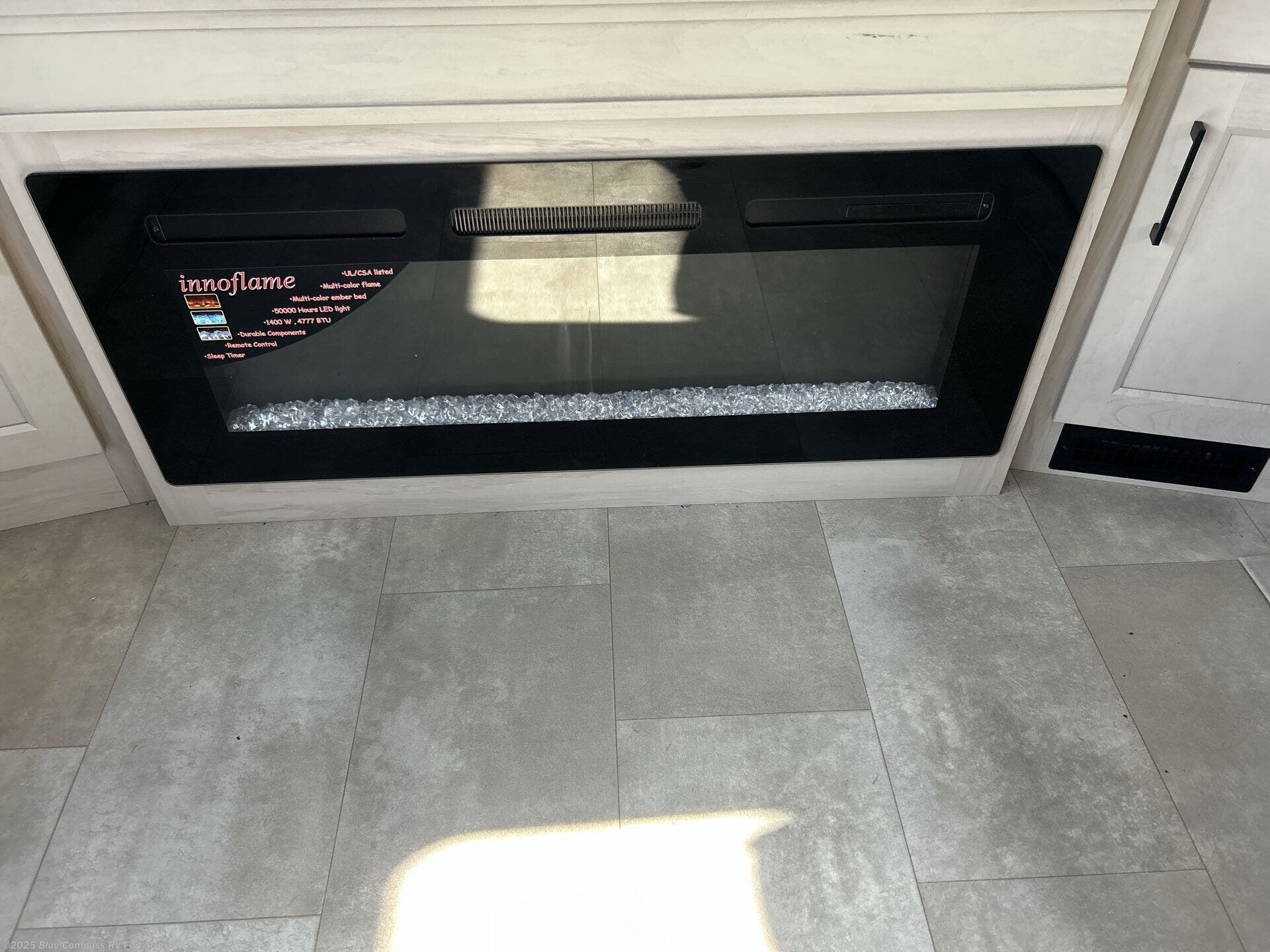 The whole gang will love camping in this spacious fifth wheel for five to six! You'll have your own bedroom up front with a queen bed slide out, a large front closet with a hamper and washer and dryer prep, plus a private entry door into the dual entry bath. Your guest can take the middle bedroom that includes a tri-fold sofa with a bunk above, a dresser/desk, plus a 50" TV for entertainment. A full kitchen includes an L-shaped counter, a 20 cu. ft. refrigerator, pull-out trash cans plus many more convenient features. And don't overlook the rear living area with its L-shaped sofa, theater seating, and free-standing dinette. There is also an entertainment center with a telescoping TV and a fireplace plus an electronics drawer to charge your phone or laptop.