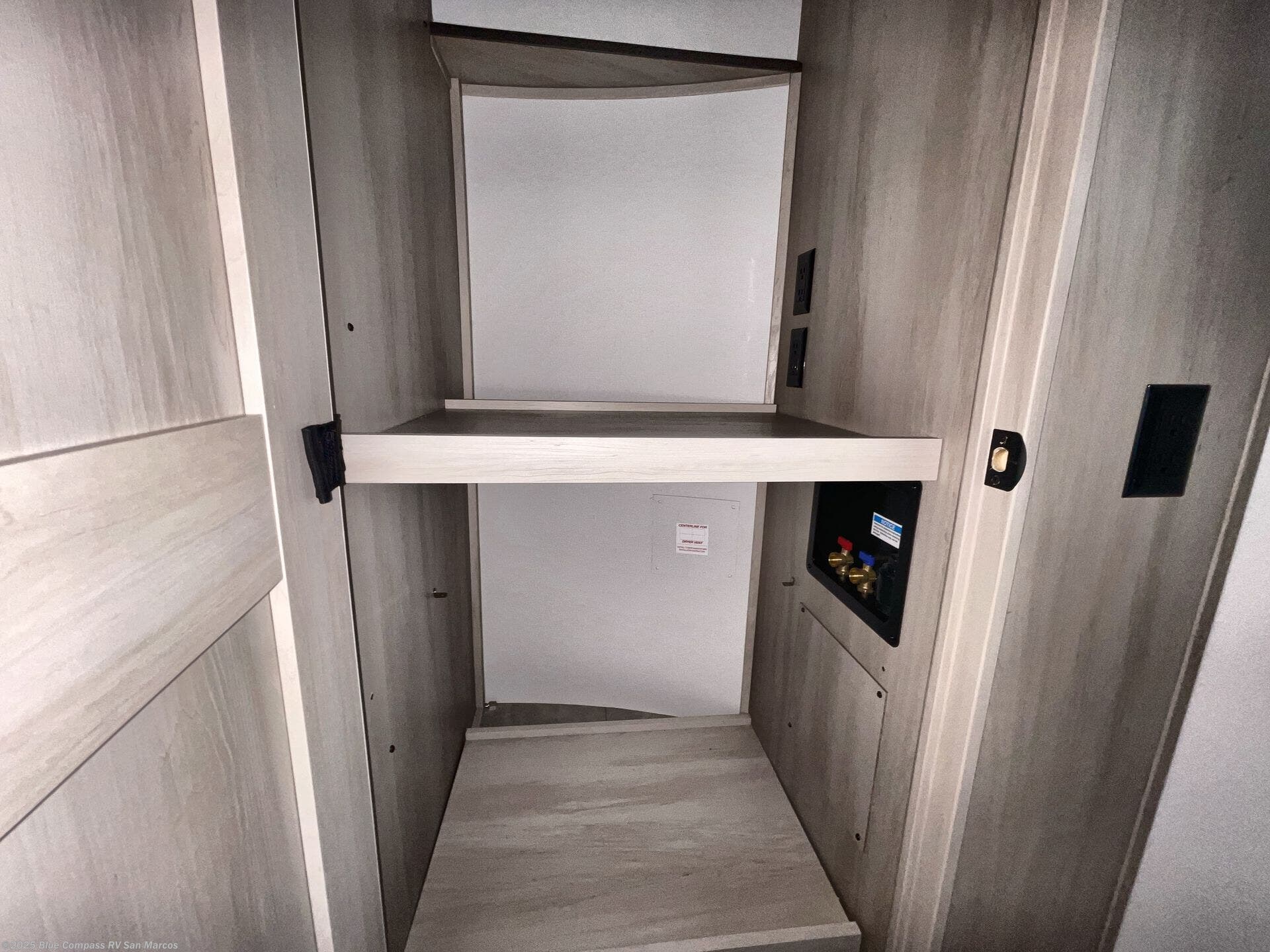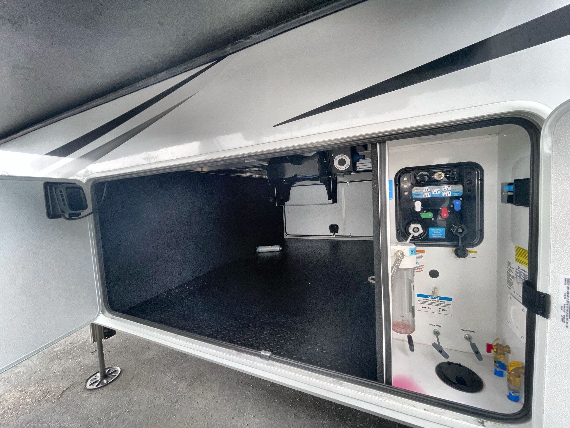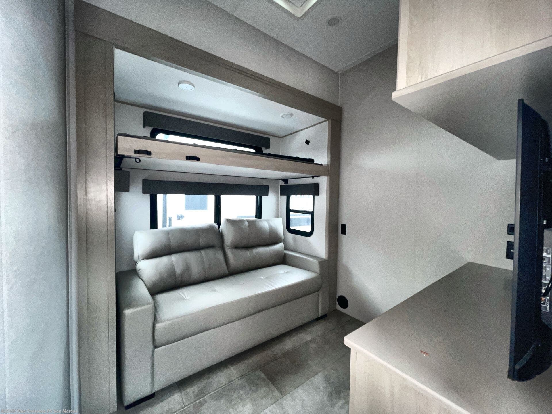 The whole gang will love camping in this spacious fifth wheel for five to six! You'll have your own bedroom up front with a queen bed slide out, a large front closet with a hamper and washer and dryer prep, plus a private entry door into the dual entry bath. Your guest can take the middle bedroom that includes a tri-fold sofa with a bunk above, a dresser/desk, plus a 50" TV for entertainment. A full kitchen includes an L-shaped counter, a 20 cu. ft. refrigerator, pull-out trash cans plus many more convenient features. And don't overlook the rear living area with its L-shaped sofa, theater seating, and free-standing dinette. There is also an entertainment center with a telescoping TV and a fireplace plus an electronics drawer to charge your phone or laptop.