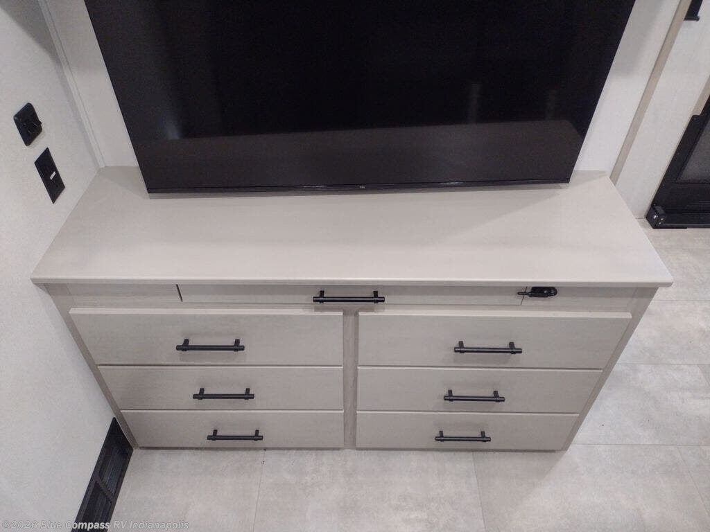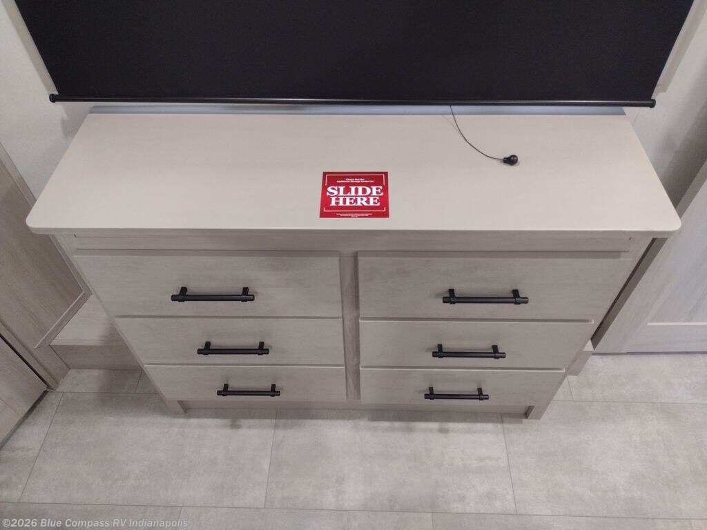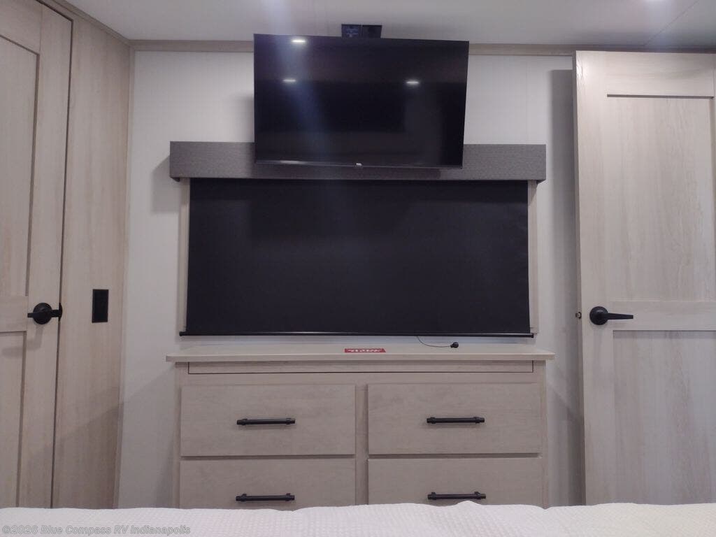 The whole gang will love camping in this spacious fifth wheel for five to six! You'll have your own bedroom up front with a queen bed slide out, a large front closet with a hamper and washer and dryer prep, plus a private entry door into the dual entry bath. Your guest can take the middle bedroom that includes a tri-fold sofa with a bunk above, a dresser/desk, plus a 50" TV for entertainment. A full kitchen includes an L-shaped counter, a 20 cu. ft. refrigerator, pull-out trash cans plus many more convenient features. And don't overlook the rear living area with its L-shaped sofa, theater seating, and free-standing dinette. There is also an entertainment center with a telescoping TV and a fireplace plus an electronics drawer to charge your phone or laptop.
