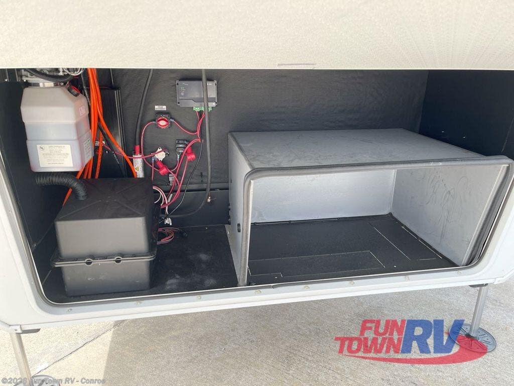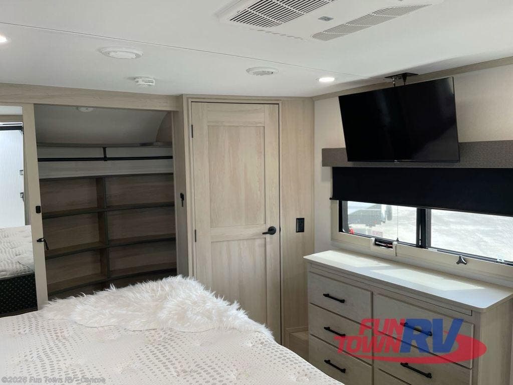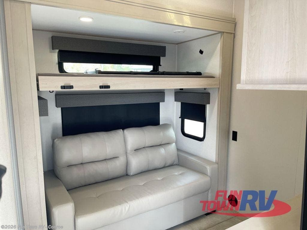 The whole gang will love camping in this spacious fifth wheel for five to six! You'll have your own bedroom up front with a queen bed slide out, a large front closet with a hamper and washer and dryer prep, plus a private entry door into the dual entry bath. Your guest can take the middle bedroom that includes a tri-fold sofa with a bunk above, a dresser/desk, plus a 50" TV for entertainment. A full kitchen includes an L-shaped counter, a 20 cu. ft. refrigerator, pull-out trash cans plus many more convenient features. And don't overlook the rear living area with its L-shaped sofa, theater seating, and free-standing dinette. There is also an entertainment center with a telescoping TV and a fireplace plus an electronics drawer to charge your phone or laptop.