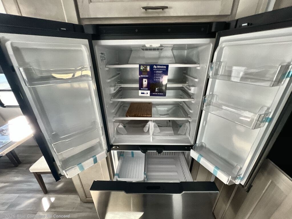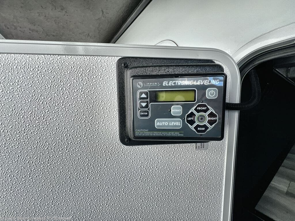 The whole gang will love camping in this spacious fifth wheel for five to six! You'll have your own bedroom up front with a queen bed slide out, a large front closet with a hamper and washer and dryer prep, plus a private entry door into the dual entry bath. Your guest can take the middle bedroom that includes a tri-fold sofa with a bunk above, a dresser/desk, plus a 50" TV for entertainment. A full kitchen includes an L-shaped counter, a 20 cu. ft. refrigerator, pull-out trash cans plus many more convenient features. And don't overlook the rear living area with its L-shaped sofa, theater seating, and free-standing dinette. There is also an entertainment center with a telescoping TV and a fireplace plus an electronics drawer to charge your phone or laptop.
