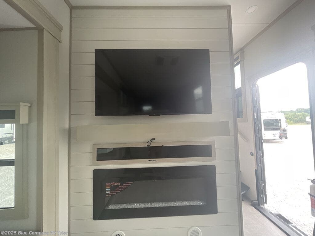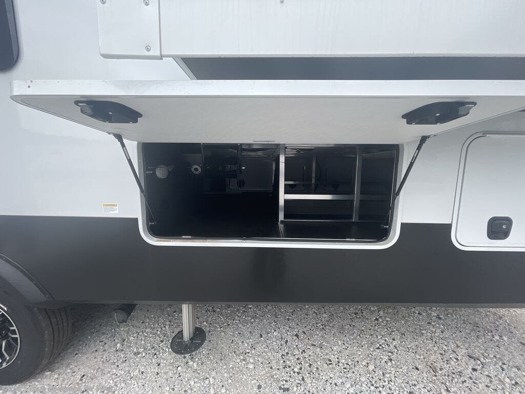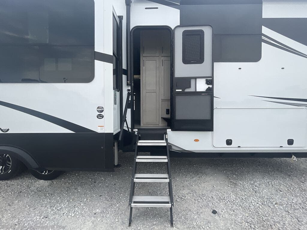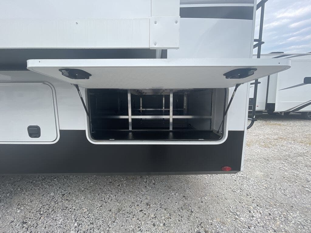 Enjoy each and every vacation, month-long trips, or even extended stays at an RV park in this spacious fifth wheel! The raised rear kitchen gives the cook plenty of room to whip up any type of meal using the stainless steel appliances including a built-in oven, an oversized pantry, and the raised bar top will provide you even more counter space on top of dining with two chairs that overlook the middle living area. Relaxing is made easy thanks to two tri-fold sofas and theatre seating while watching the big game on the LED Smart TV and enjoying the fireplace below. At night, retire to your own queen bed which slides out to provide more floor space, and you can store your clothes in the slide top dresser and front closet with washer and dryer prep.