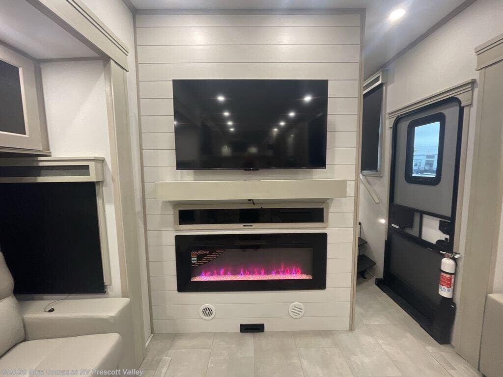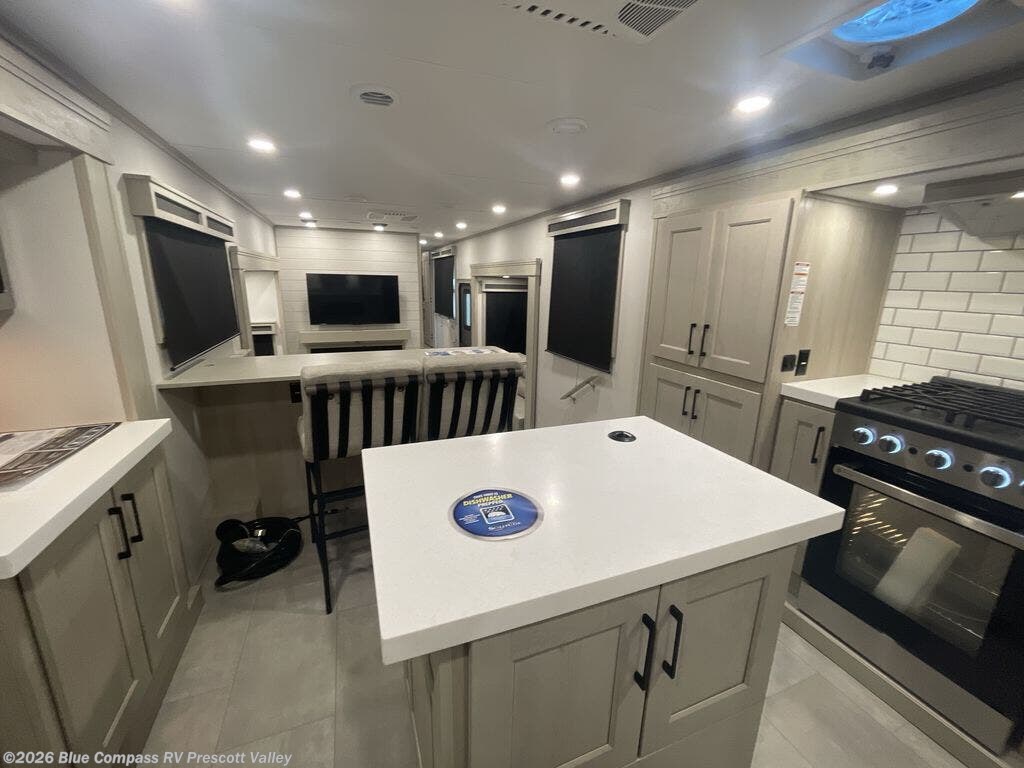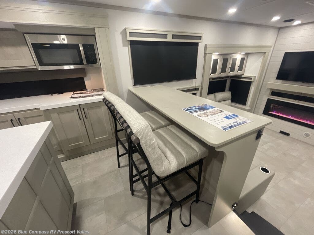 Enjoy each and every vacation, month-long trips, or even extended stays at an RV park in this spacious fifth wheel! The raised rear kitchen gives the cook plenty of room to whip up any type of meal using the stainless steel appliances including a built-in oven, an oversized pantry, and the raised bar top will provide you even more counter space on top of dining with two chairs that overlook the middle living area. Relaxing is made easy thanks to two tri-fold sofas and theatre seating while watching the big game on the LED Smart TV and enjoying the fireplace below. At night, retire to your own queen bed which slides out to provide more floor space, and you can store your clothes in the slide top dresser and front closet with washer and dryer prep.