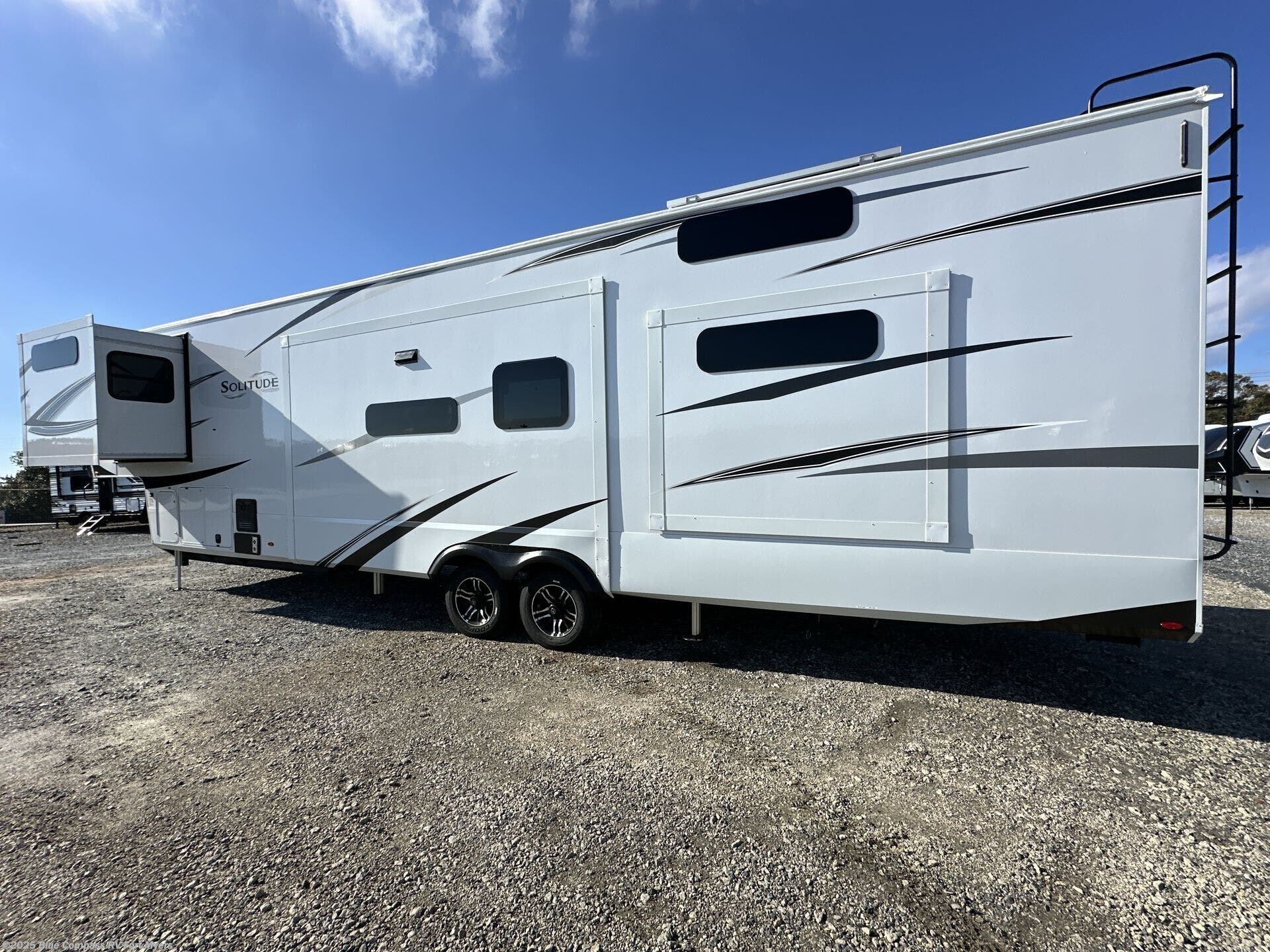 Each Solitude fifth wheel by Grand Design features a 101" wide-body construction, heavy duty 8,000 lb. axles, frameless tinted windows, and high-gloss gel coat sidewalls. You can camp year around thanks to the Weather-Tek Package that includes a 35K BTU high-capacity furnace, an all-in-one enclosed and heated utility center, and a fully enclosed underbelly with heated tanks and storage. Inside, you'll love the premium roller shades, hardwood cabinet doors, solid surface countertops, plus residential finishes throughout to make you truly feel at home. Each model also includes a MORryde CRE3000 suspension system, self adjusting brakes, and a MORryde pin box that will provide smooth towing from home to campground. Affordable luxury is possible with the Solitude fifth wheels; choose yours today!