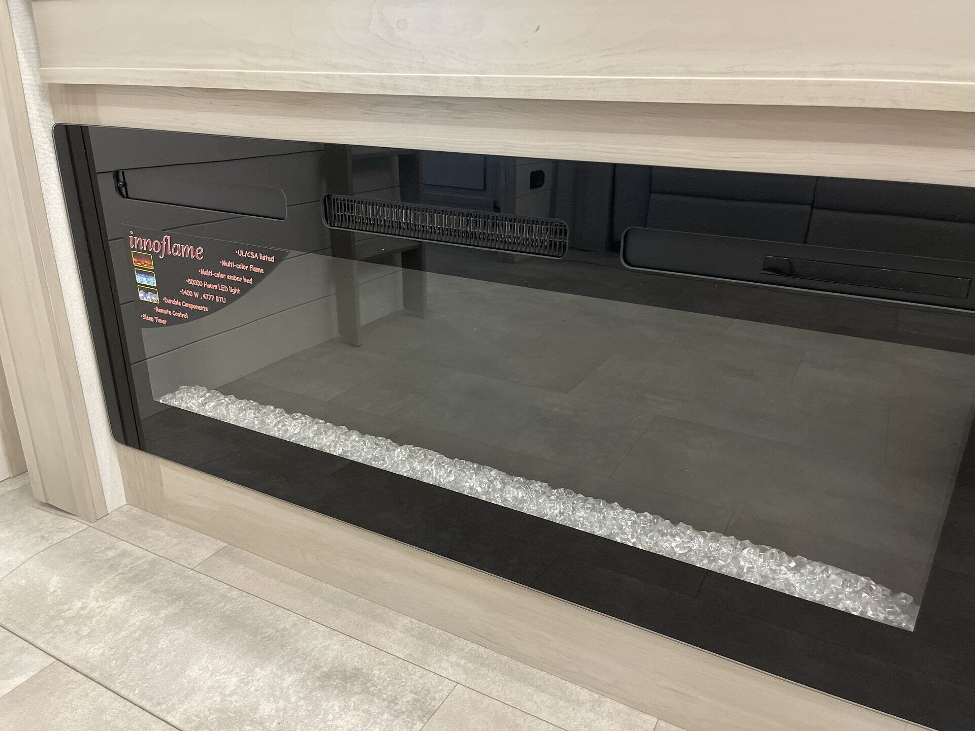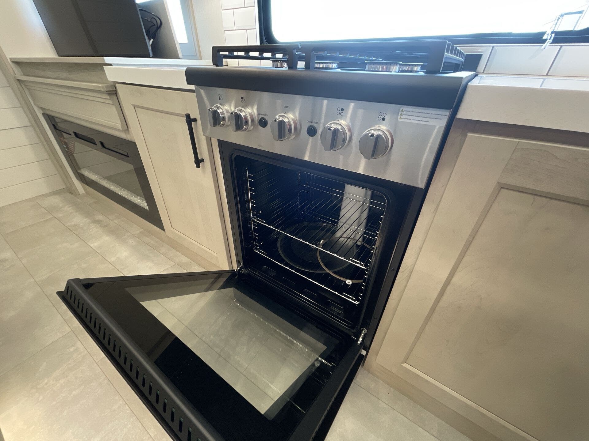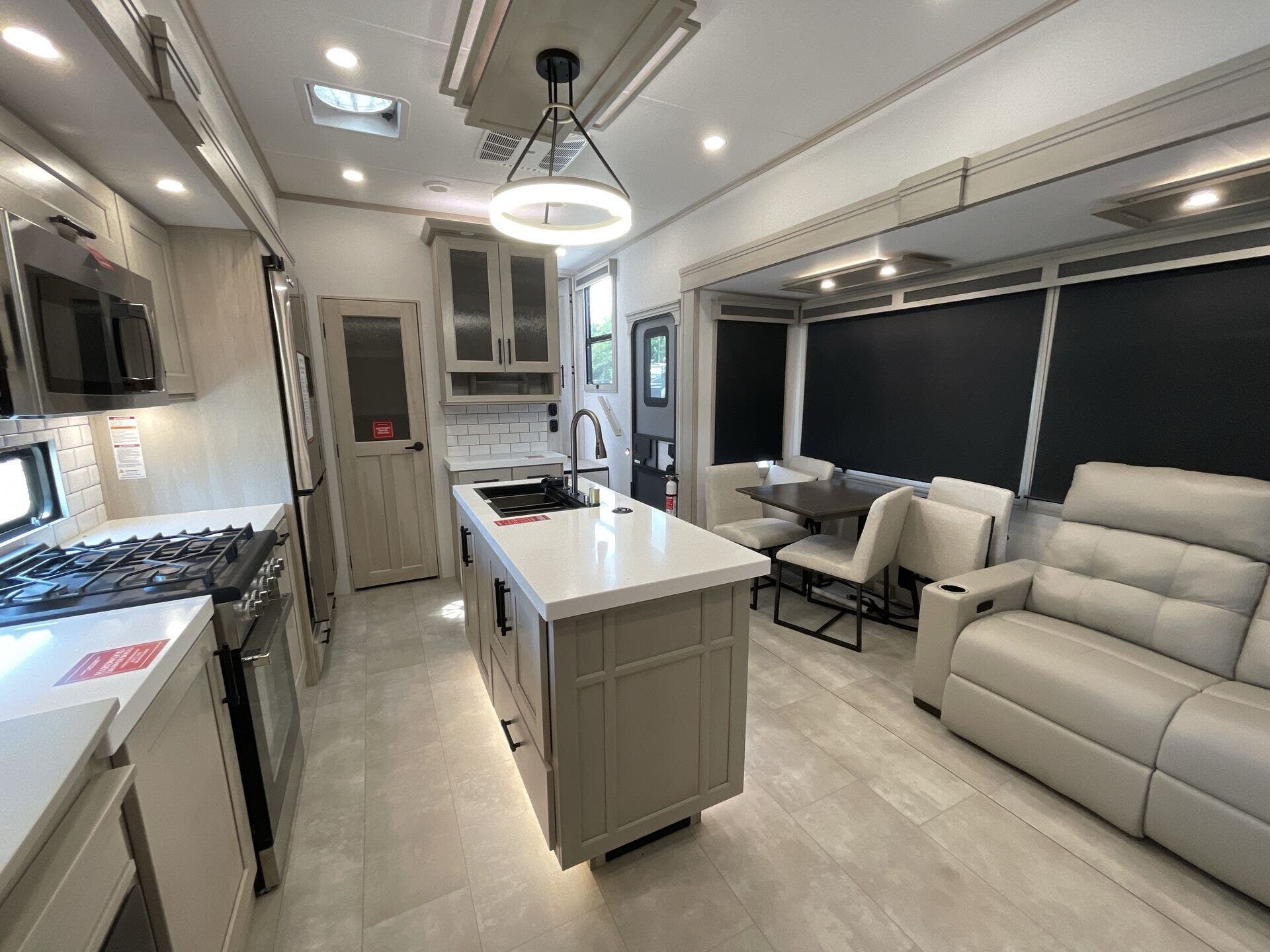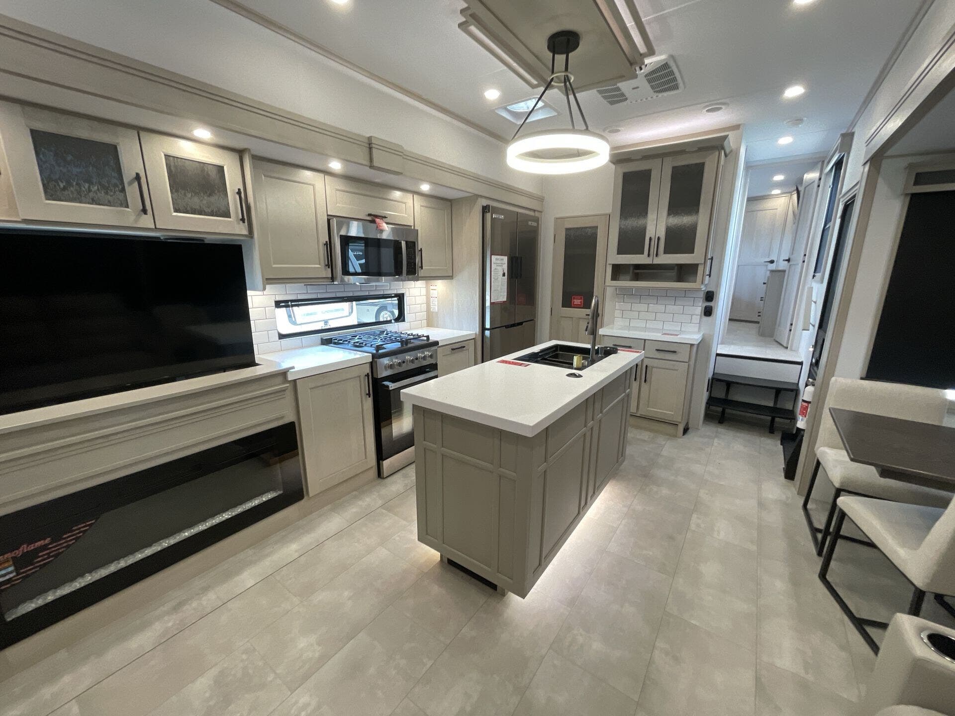 The main living area boasts opposing slides, a large entertainment center with a fireplace, theater seating, and a free-standing dinette, creating a welcoming space to relax or entertain. The gourmet kitchen is equipped with premium appliances, a spacious island, oversized pantry, and residential refrigerator—perfect for preparing meals just like at home. A half bath is conveniently located off the kitchen for easy access.