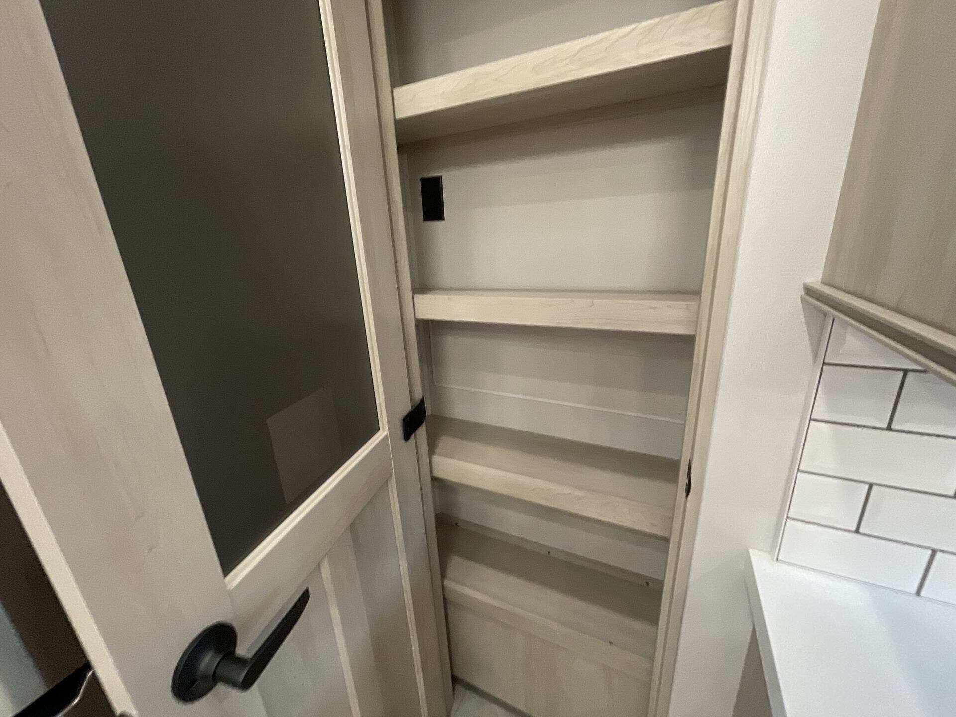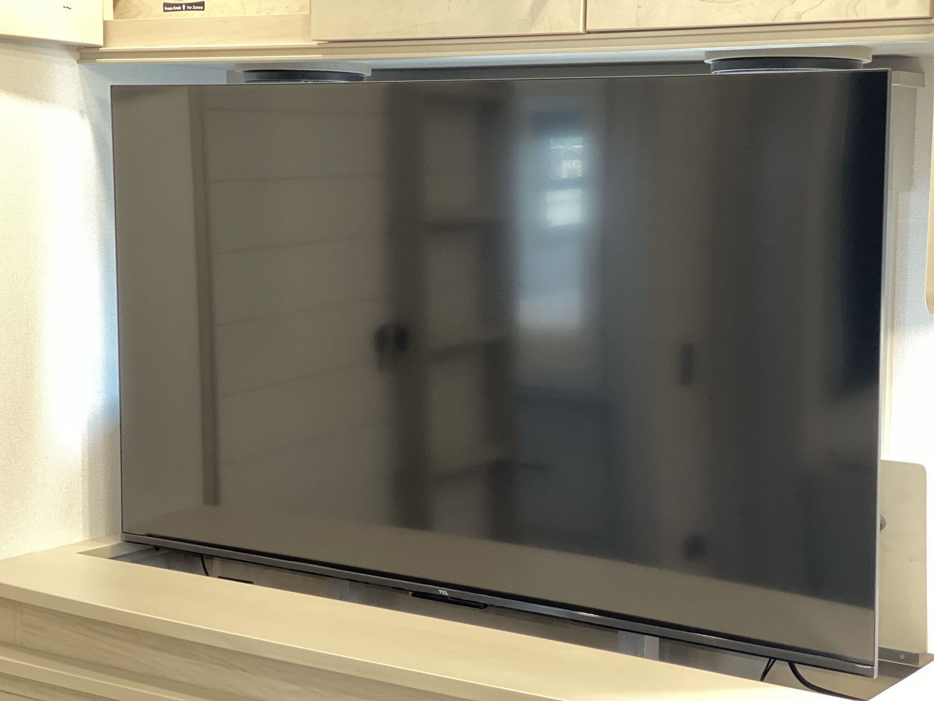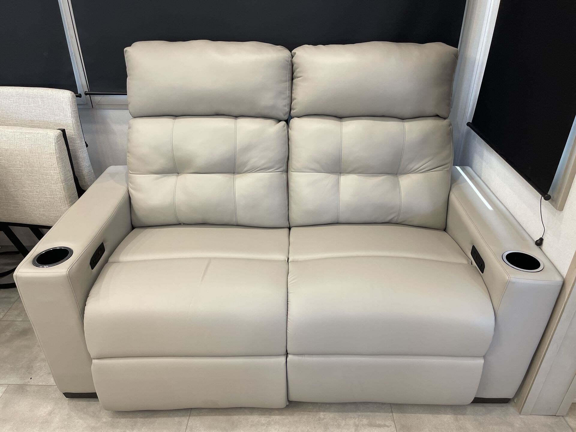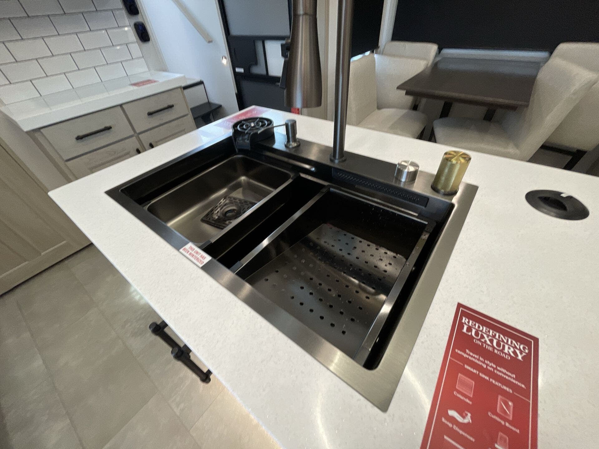 The main living area boasts opposing slides, a large entertainment center with a fireplace, theater seating, and a free-standing dinette, creating a welcoming space to relax or entertain. The gourmet kitchen is equipped with premium appliances, a spacious island, oversized pantry, and residential refrigerator—perfect for preparing meals just like at home. A half bath is conveniently located off the kitchen for easy access.