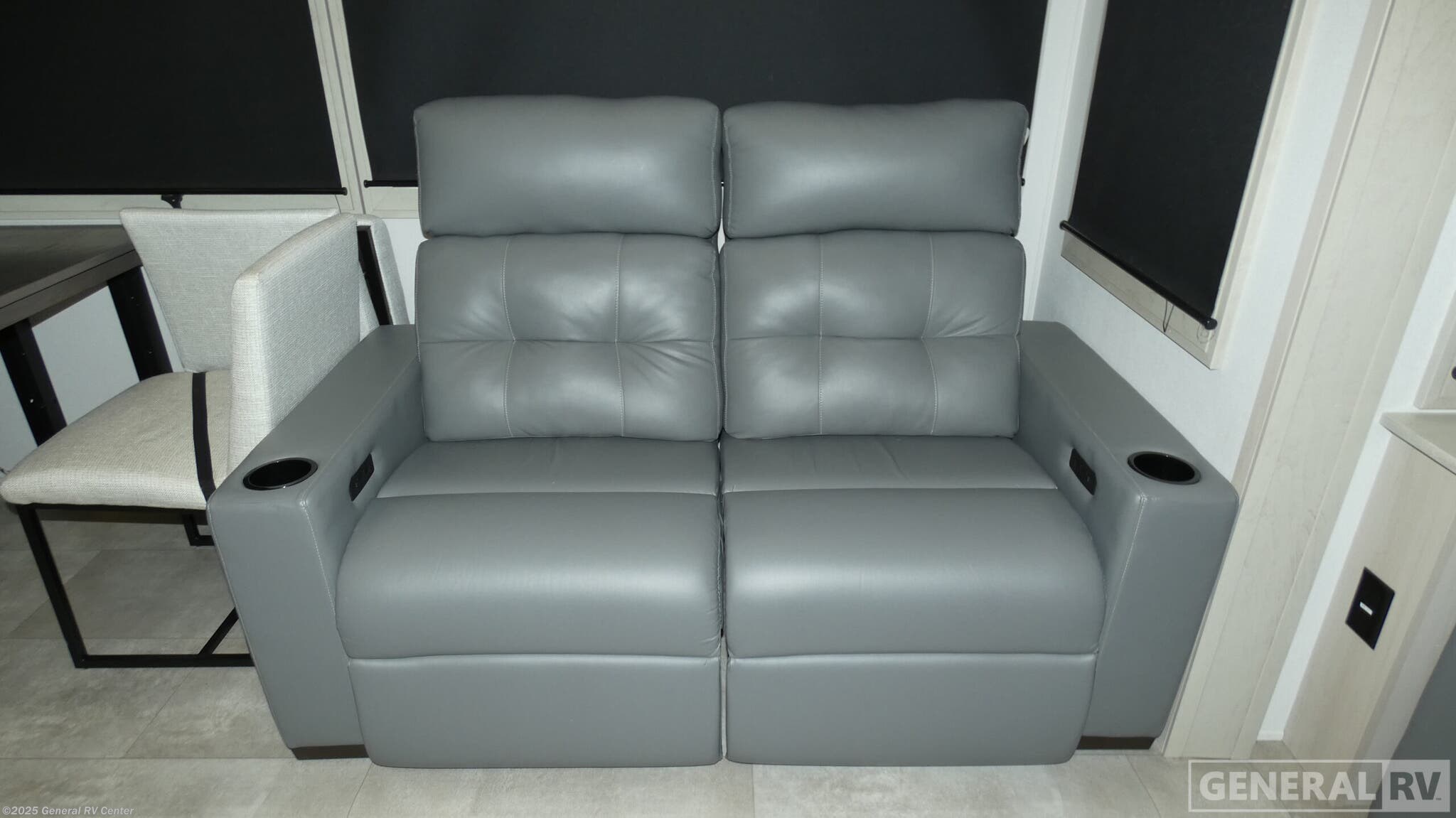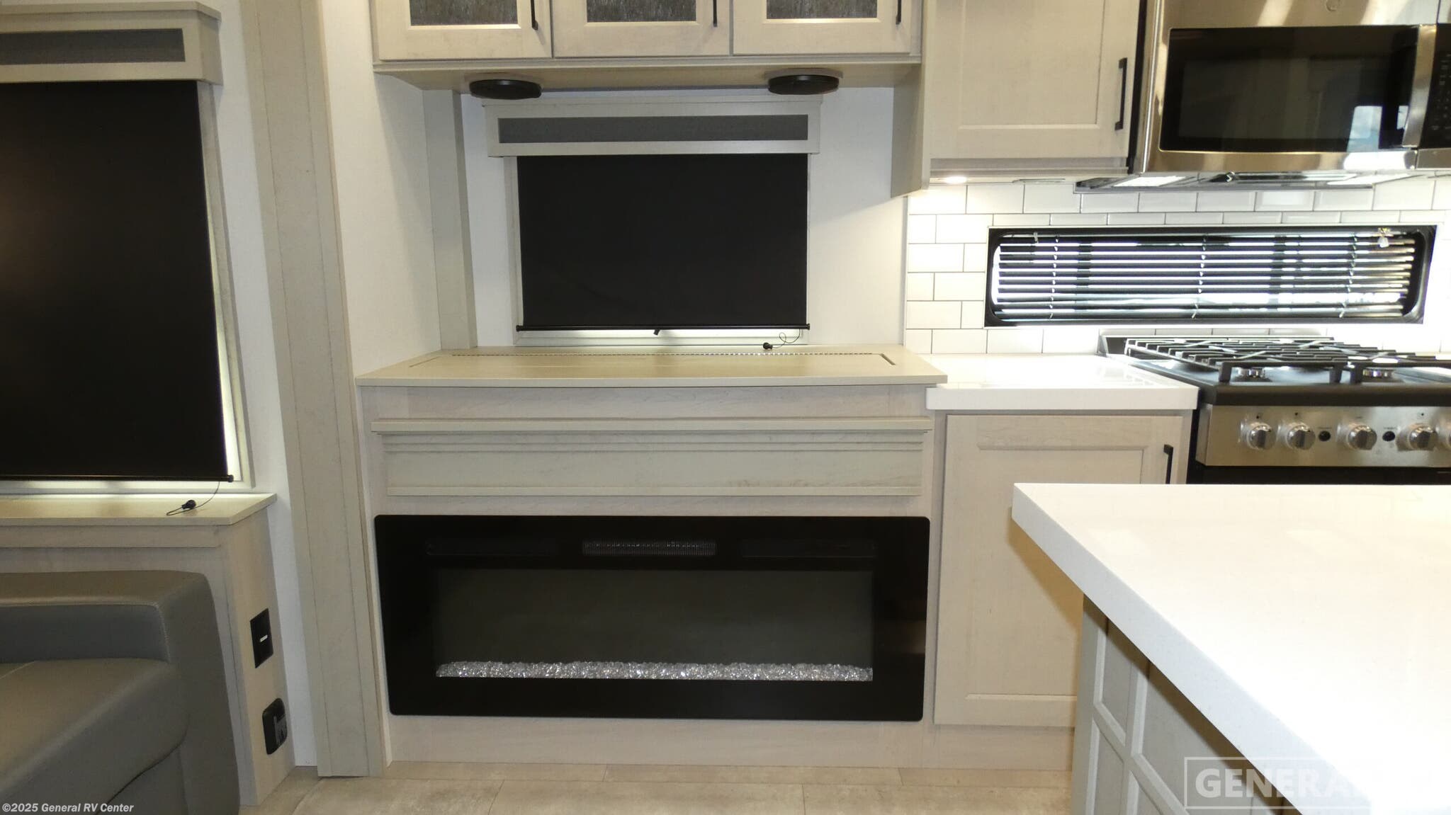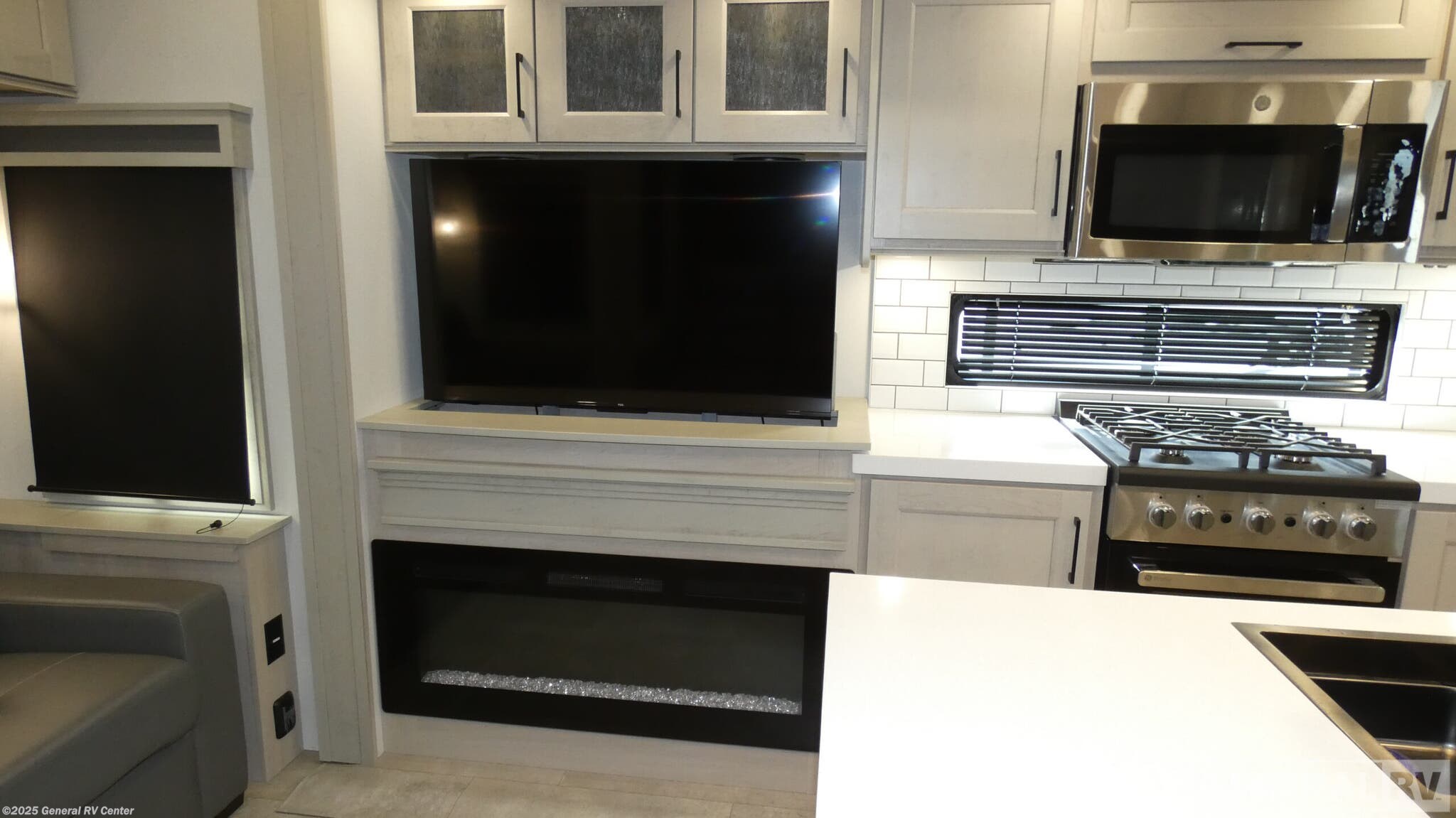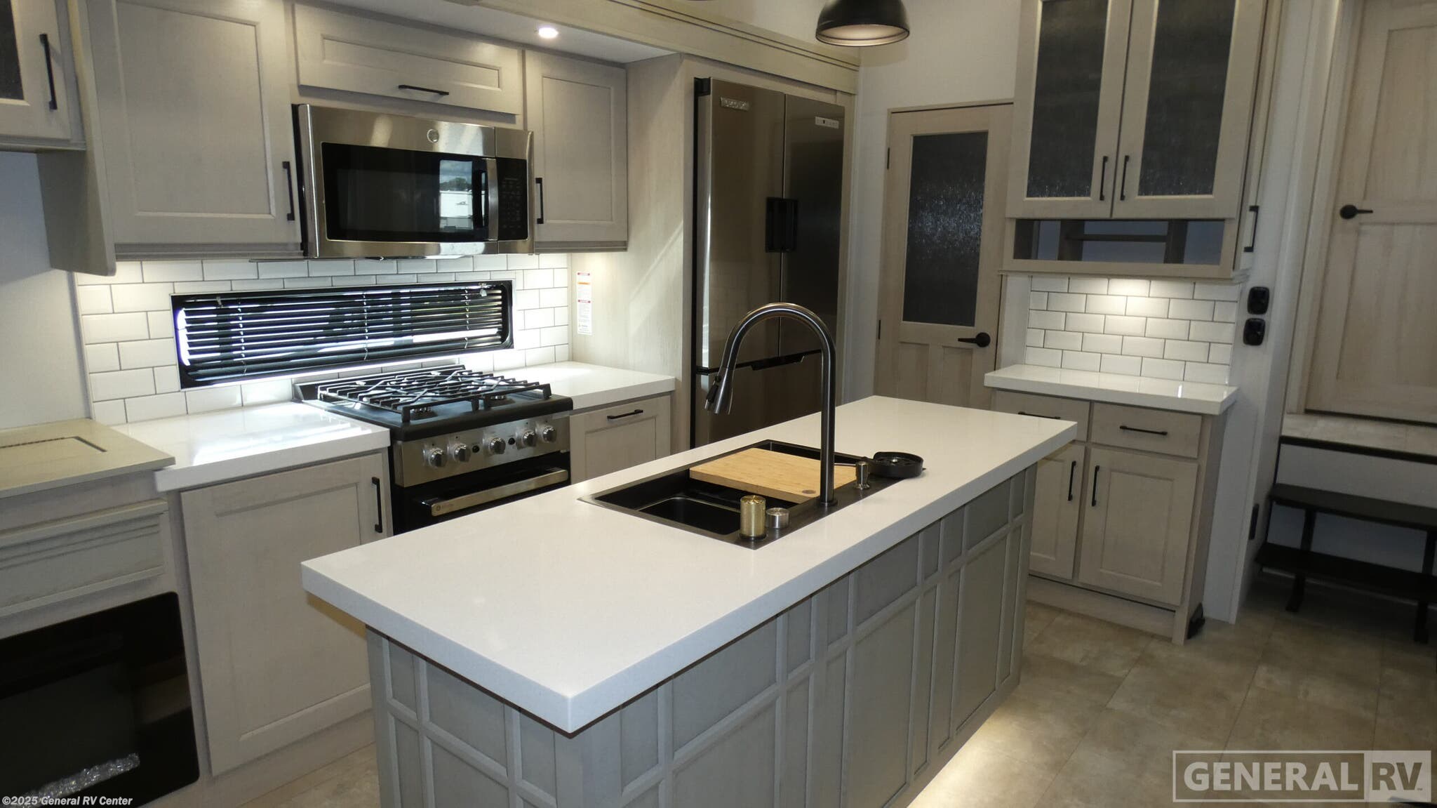 Experience the epitome of luxury and comfort with the 2025 Grand Design Solitude 310GK. This elegant fifth wheel is designed for those who crave adventure without sacrificing the comforts of home. Measuring just under 35 feet, it offers a spacious retreat with a stunning rear living area perfect for relaxation and entertainment. Enjoy the convenience of a center kitchen equipped with a full-size refrigerator and a four-burner cooktop, making meal preparation a delight. The telescoping TV in the entertainment center and the theater seating ensure cozy movie nights or catching up on your favorite shows. The Solitude 310GK is thoughtfully designed with a front bedroom that promises restful nights on a queen or optional king bed. The center bath offers convenience and privacy, complete with a sleek shower. With washer and dryer prep, staying fresh on the road has never been easier. The ample pass-through storage and optional pull-out kitchen enhance your outdoor living experience. With a cargo capacity of 2900 pounds and a GVWR of 15,000 pounds, this RV is as functional as it is beautiful. For more details and to see this model in person, visit your nearest General RV dealership.