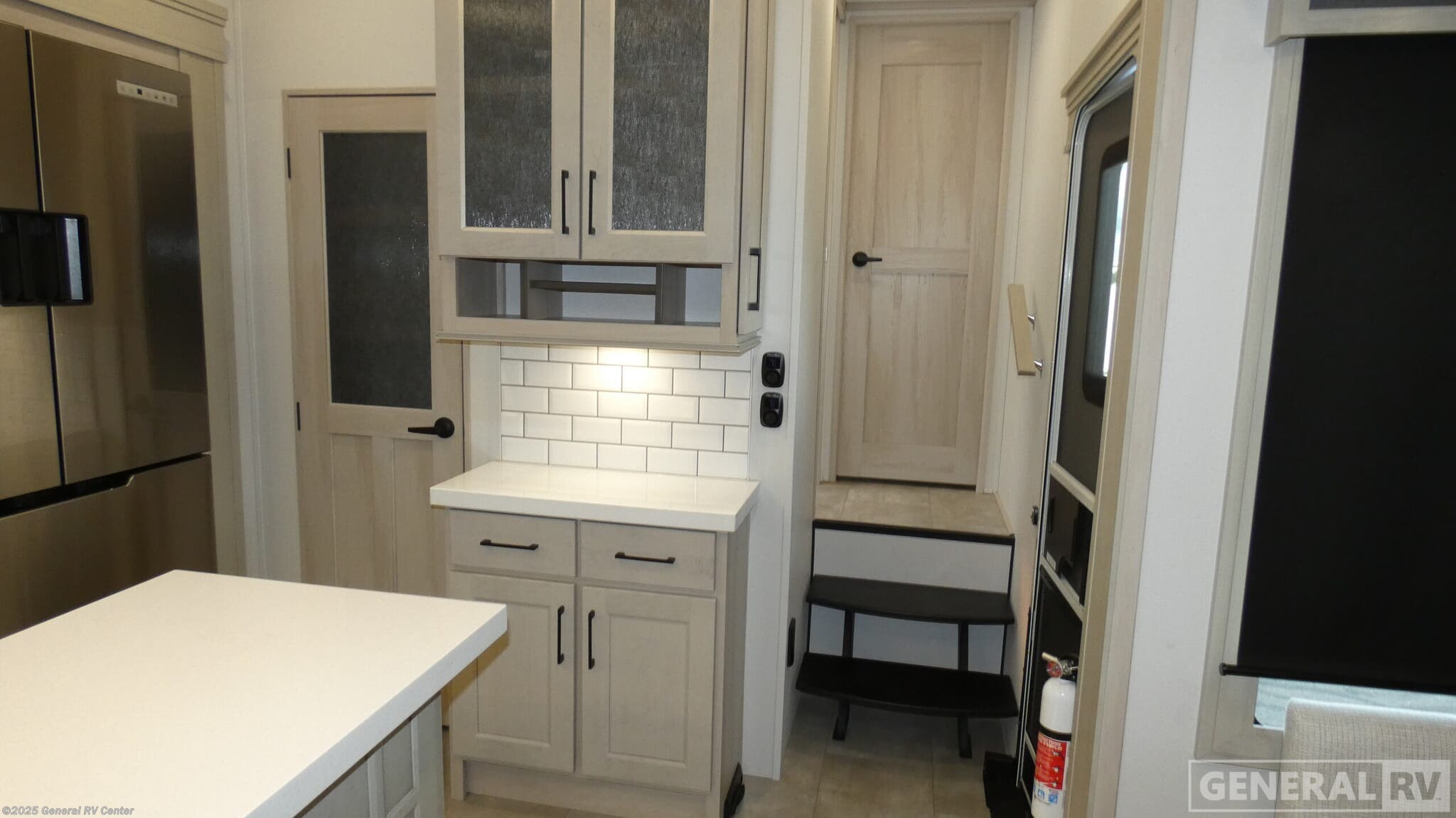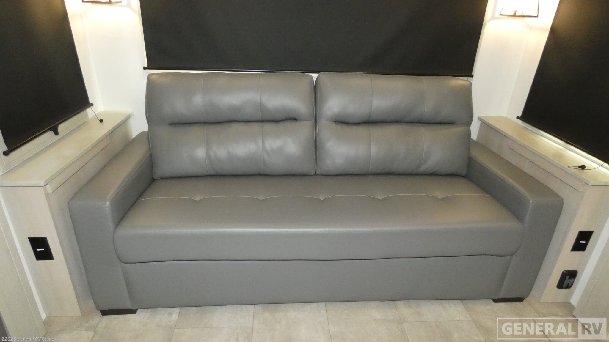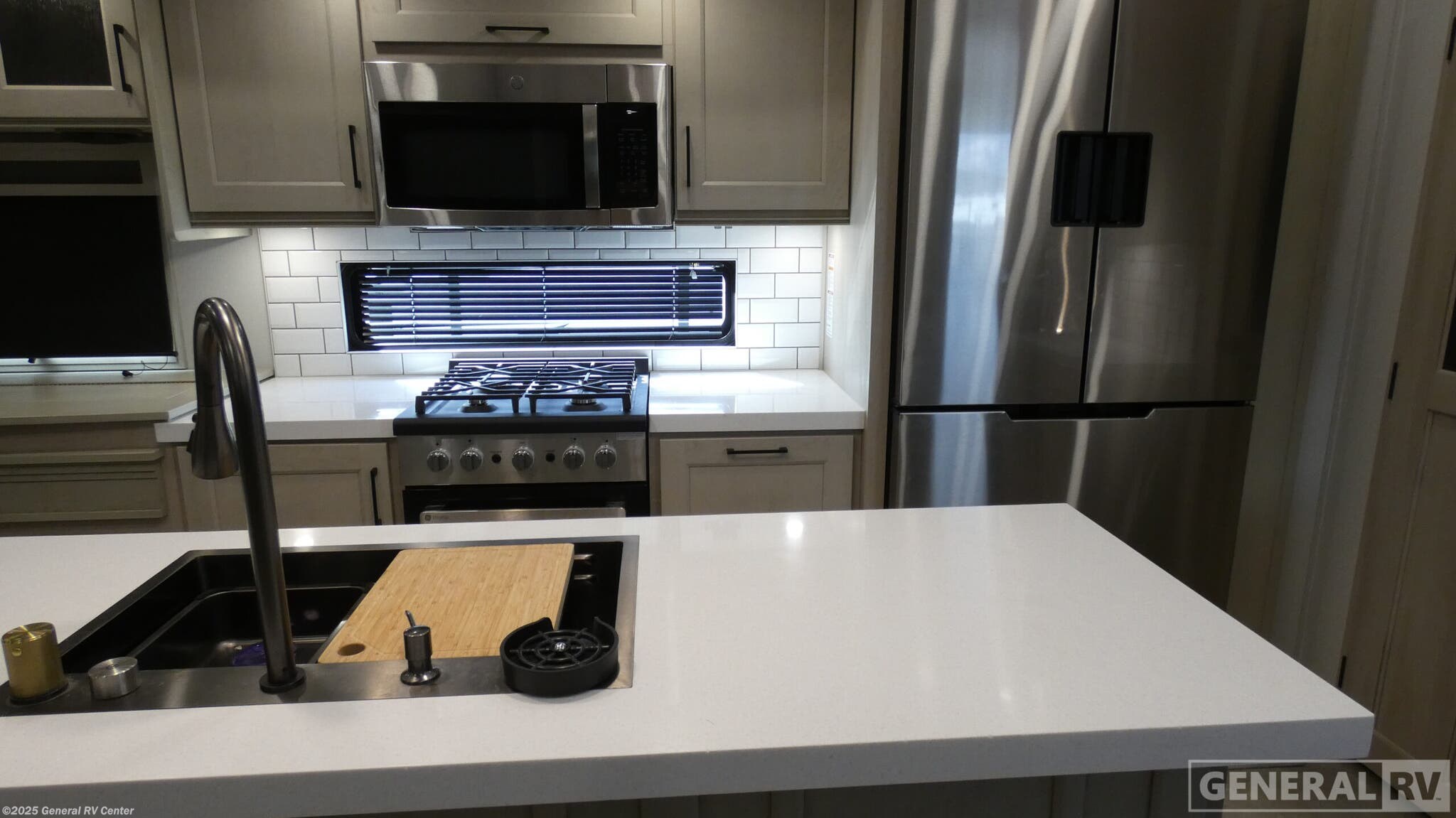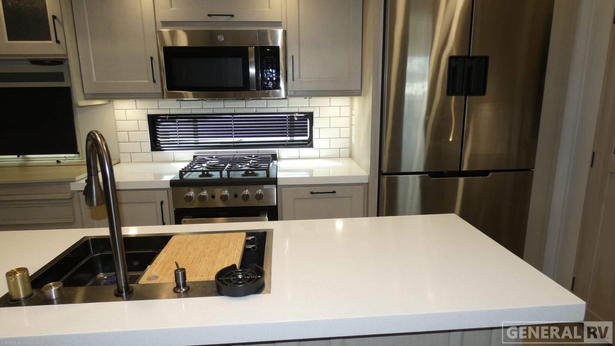 Experience the epitome of luxury and comfort with the 2025 Grand Design Solitude 310GK. This elegant fifth wheel is designed for those who crave adventure without sacrificing the comforts of home. Measuring just under 35 feet, it offers a spacious retreat with a stunning rear living area perfect for relaxation and entertainment. Enjoy the convenience of a center kitchen equipped with a full-size refrigerator and a four-burner cooktop, making meal preparation a delight. The telescoping TV in the entertainment center and the theater seating ensure cozy movie nights or catching up on your favorite shows. The Solitude 310GK is thoughtfully designed with a front bedroom that promises restful nights on a queen or optional king bed. The center bath offers convenience and privacy, complete with a sleek shower. With washer and dryer prep, staying fresh on the road has never been easier. The ample pass-through storage and optional pull-out kitchen enhance your outdoor living experience. With a cargo capacity of 2900 pounds and a GVWR of 15,000 pounds, this RV is as functional as it is beautiful. For more details and to see this model in person, visit your nearest General RV dealership.