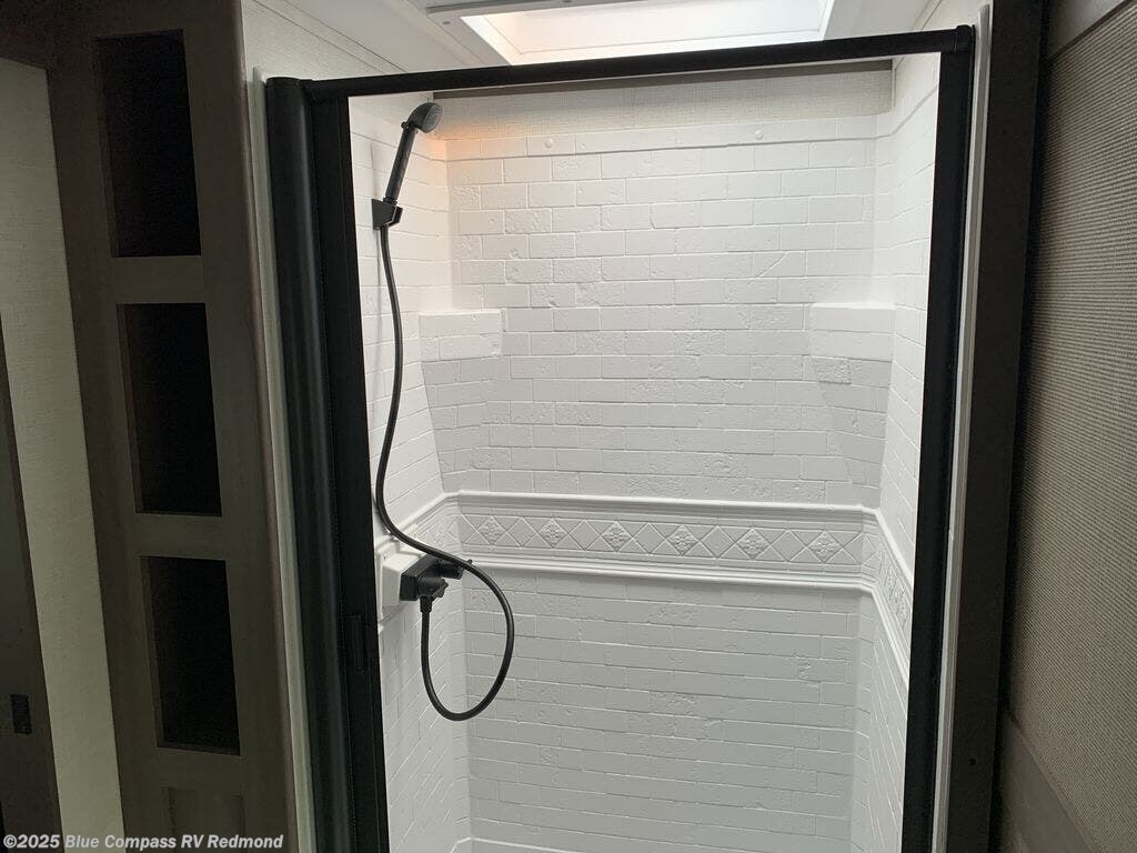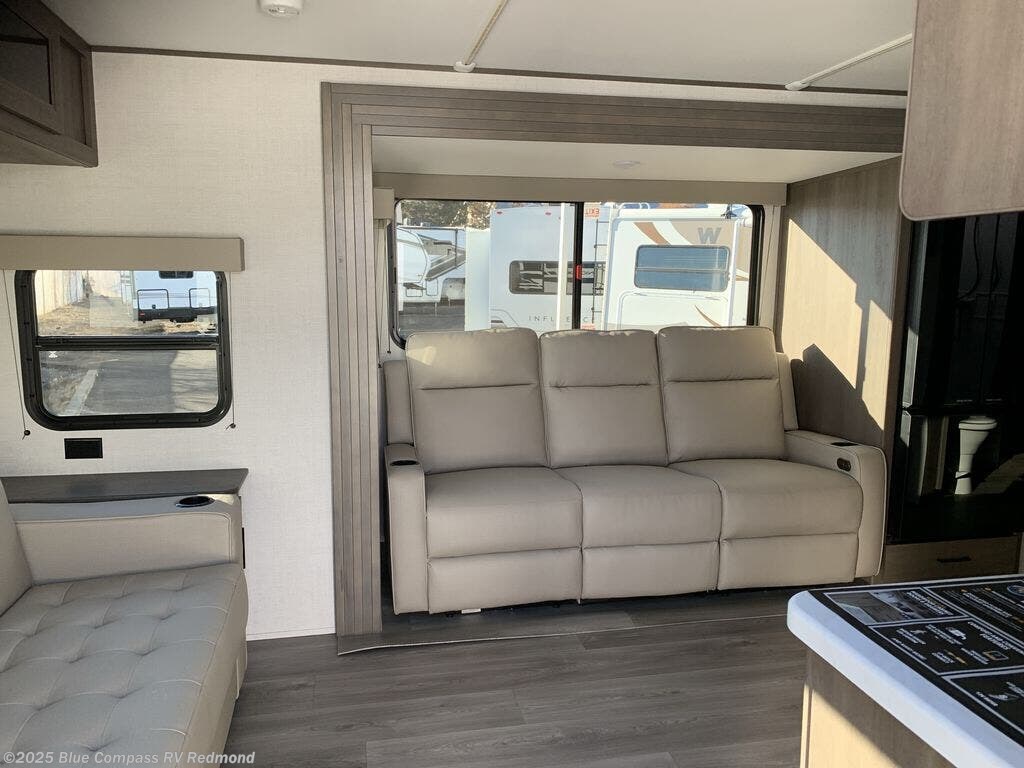 the amount of interior space you have in the living area thanks to the U-shaped dinette slide, which can be switched out for optional theater seats. The rear 70" sleeper sofa will be perfect for guests to sleep on, and the 32" TV lets you enjoy movie nights. There is a three burner range and convection microwave/combo air fryer to cook meals inside, or you can cook on the exterior griddle with a 1.7 cu. ft. refrigerator. And the 17' power awning will provide much wanted shade as you visit with friends. Back inside, the walk-thru bath is both spacious and convenient since it can be accessed from the main living area and the front master bedroom. Here, you'll find a queen bed, storage space, plus TV prep if you want to add a television. You even have your own exterior entry door for convenience!