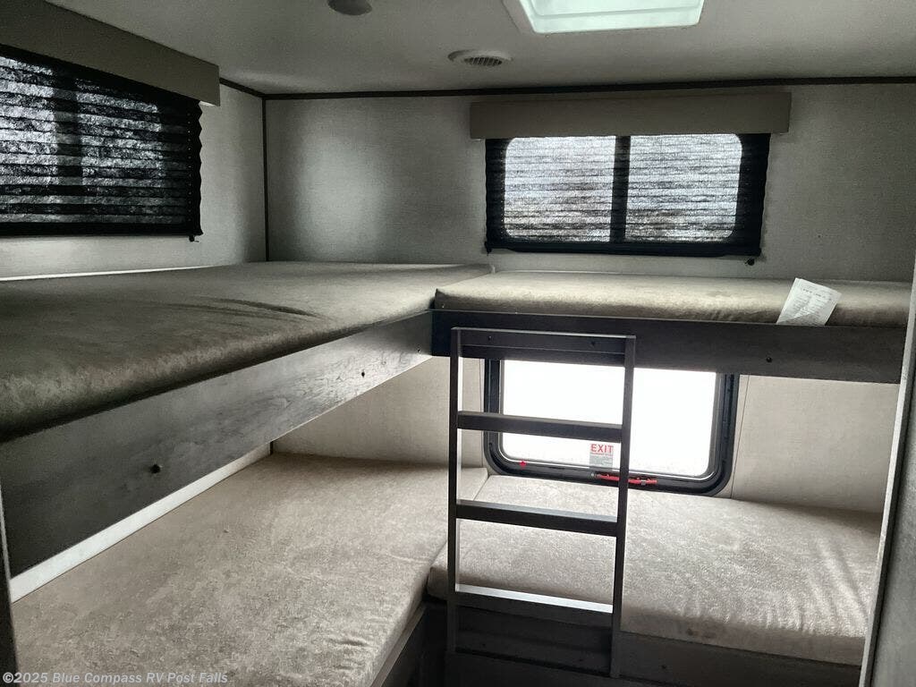 Your crew of nine will love camping in this spacious travel trailer! There are four bunks in the rear bunkhouse, along with storage drawers, and a convenient half bath! A full walk-thru bath will create a front master bedroom you are sure to love, especially with its queen bed, wardrobe storage, and private exterior entry door! The main living area will be a favorite place to hang out with its booth dinette, sleeper sofa and 32" TV. If the weather is nice, you may just find yourselves outdoors since there is an exterior griddle and 1.7 cu. ft. refrigerator!