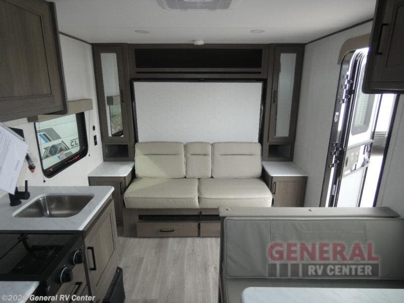 This is the perfect couple's trailer with versatile seating and sleeping space! You'll find a queen-size Murphy bed up front with storage space beside and above plus a full rear bath for added privacy. Once you've made lunch in the full kitchen, you can dine at the booth dinette, or take your plate outdoors to sit under the 10' power awning. You'll also find an unobstructed pass-thru storage outside that will be perfect for fishing poles, lawn chairs, tools and more!