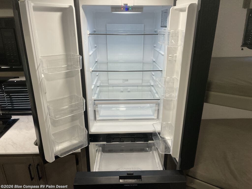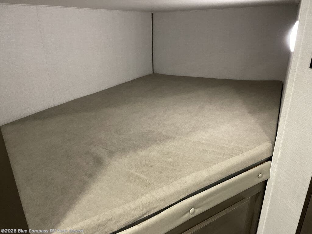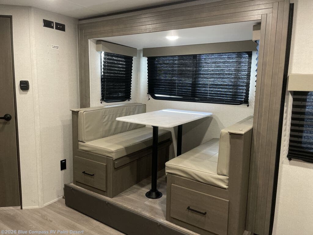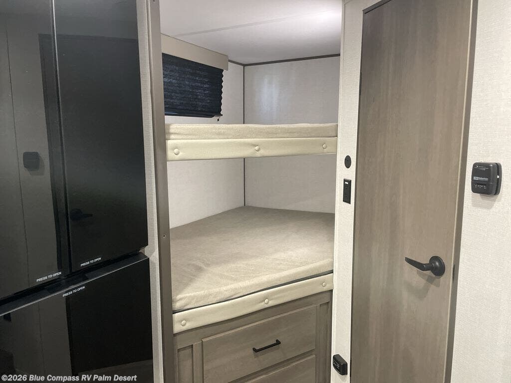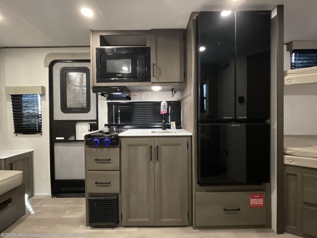 Spacious and versatile, this travel trailer is perfect for weekend trips to the campground or weeklong visits to the lake! There is a front Murphy bed with storage on both sides plus a pull-out pet drawer to keep your furry friends happy. Your guests or little ones will love the double-size bunks with privacy curtains, and the full bath is right next to the bunks for easy nighttime use. Once you make breakfast on the two burner range, you can dine at the booth dinette slide. And this model also includes an outdoor griddle and refrigerator if you want to make breakfast outdoors. Additional exterior features include a 16' power awning, an interior/exterior table, and a pass-thru storage for larger camp gear.