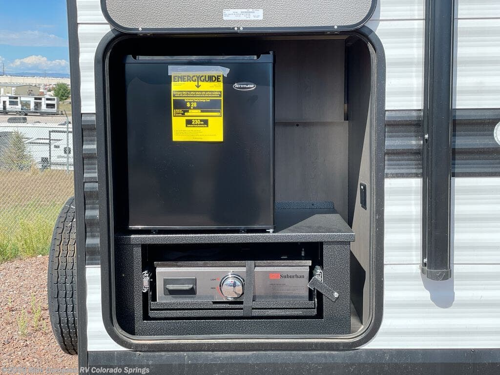 Pack your bags and head for the campground in this spacious travel trailer! Once you arrive, you can unload the pass-thru storage, then make lunch on the exterior griddle with a 1.7 cu. ft. exterior refrigerator. The U-shaped dinette slide will provide a place to dine if you decide not to stay outside under the 16' power awning. Optional theater seats can be chosen in place of the dinette for even more comfort! You'll sleep soundly on the queen bed in the front bedroom, and the full rear bath lets you freshen up each day.