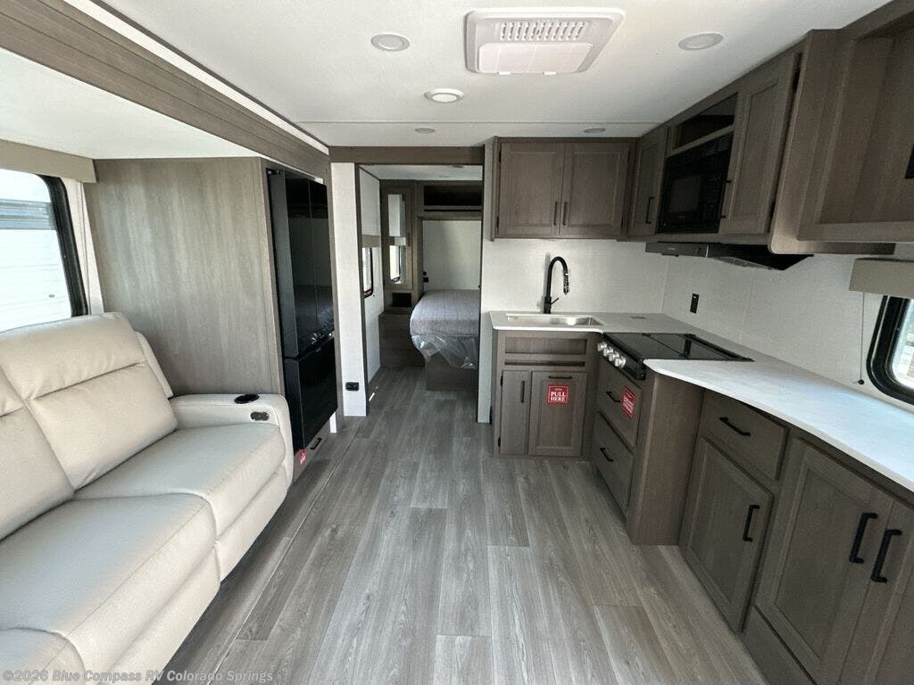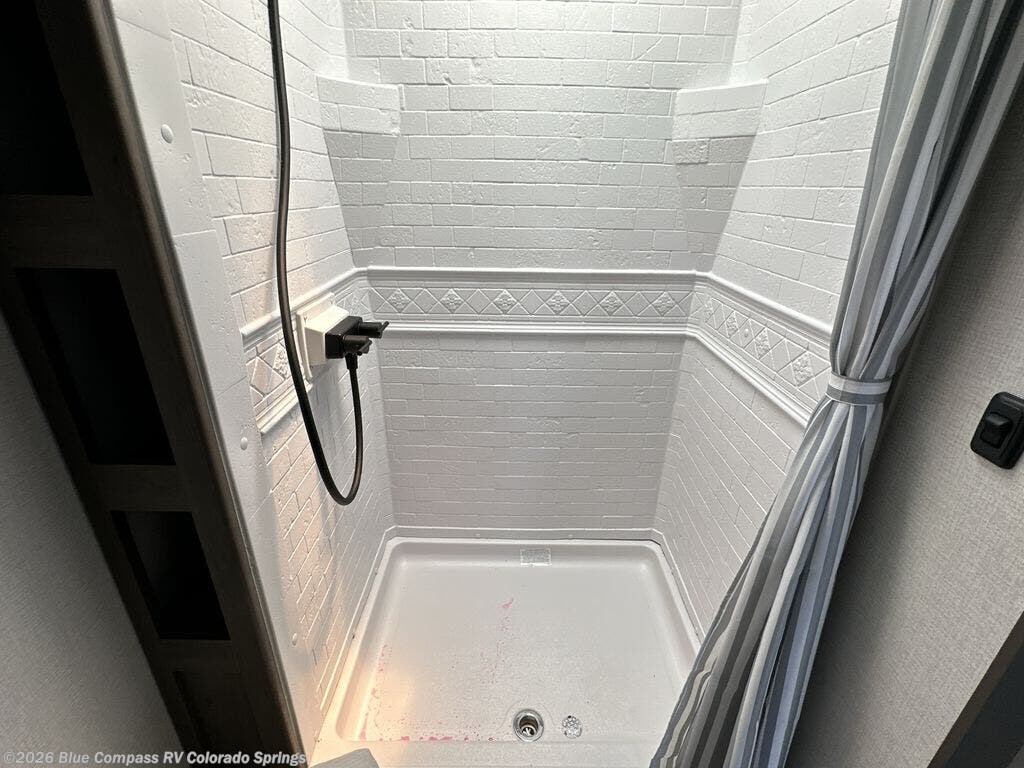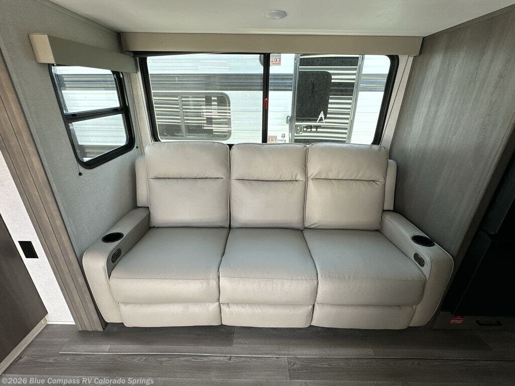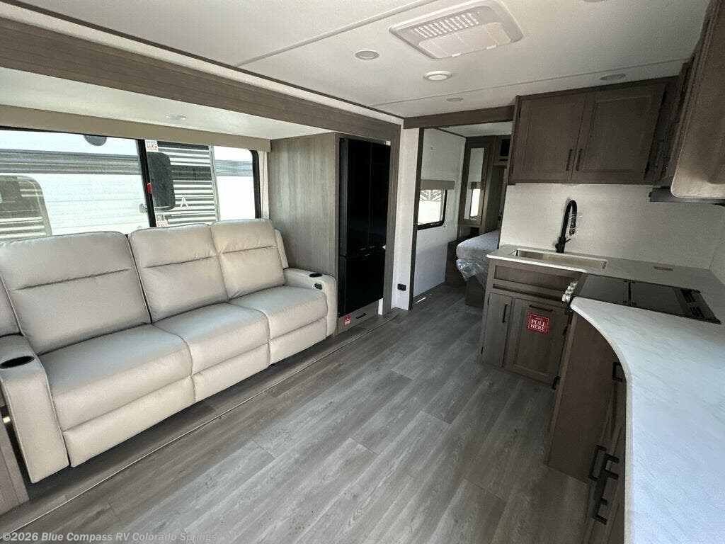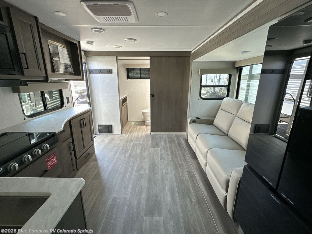 Pack your bags and head for the campground in this spacious travel trailer! Once you arrive, you can unload the pass-thru storage, then make lunch on the exterior griddle with a 1.7 cu. ft. exterior refrigerator. The U-shaped dinette slide will provide a place to dine if you decide not to stay outside under the 16' power awning. Optional theater seats can be chosen in place of the dinette for even more comfort! You'll sleep soundly on the queen bed in the front bedroom, and the full rear bath lets you freshen up each day.