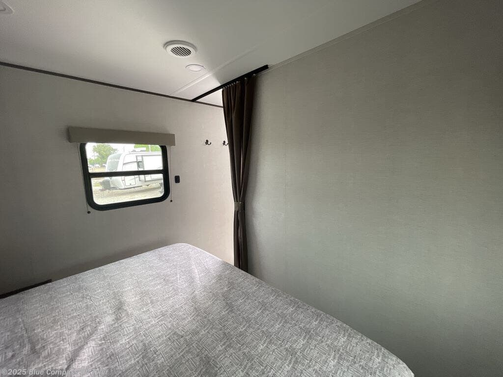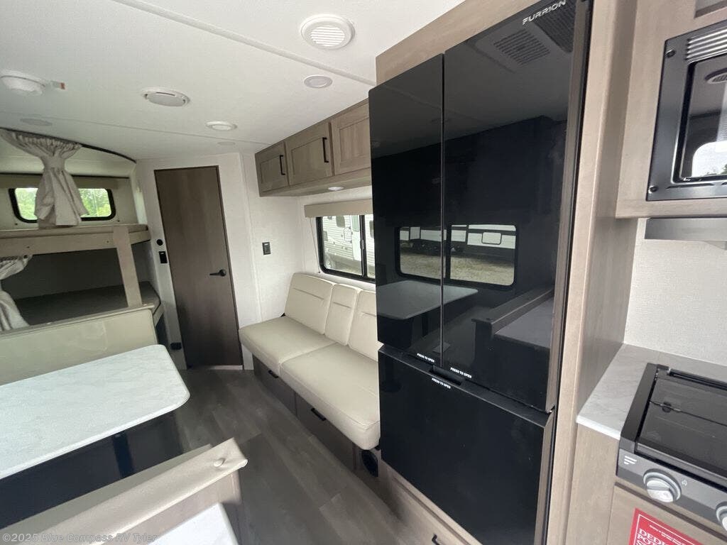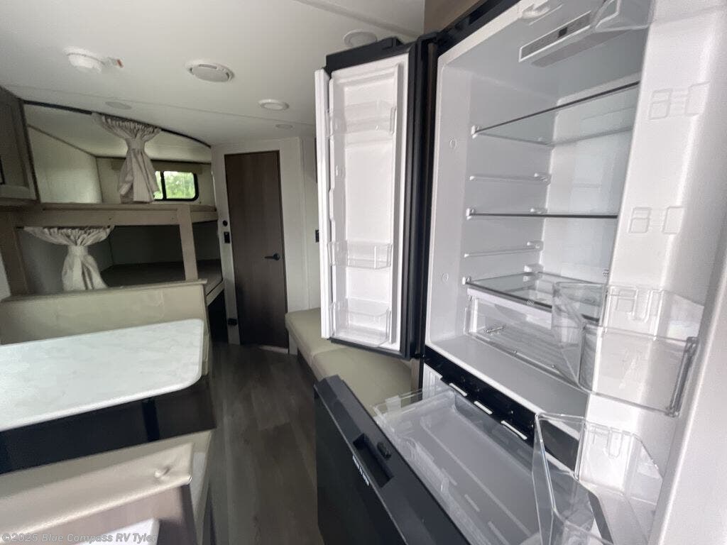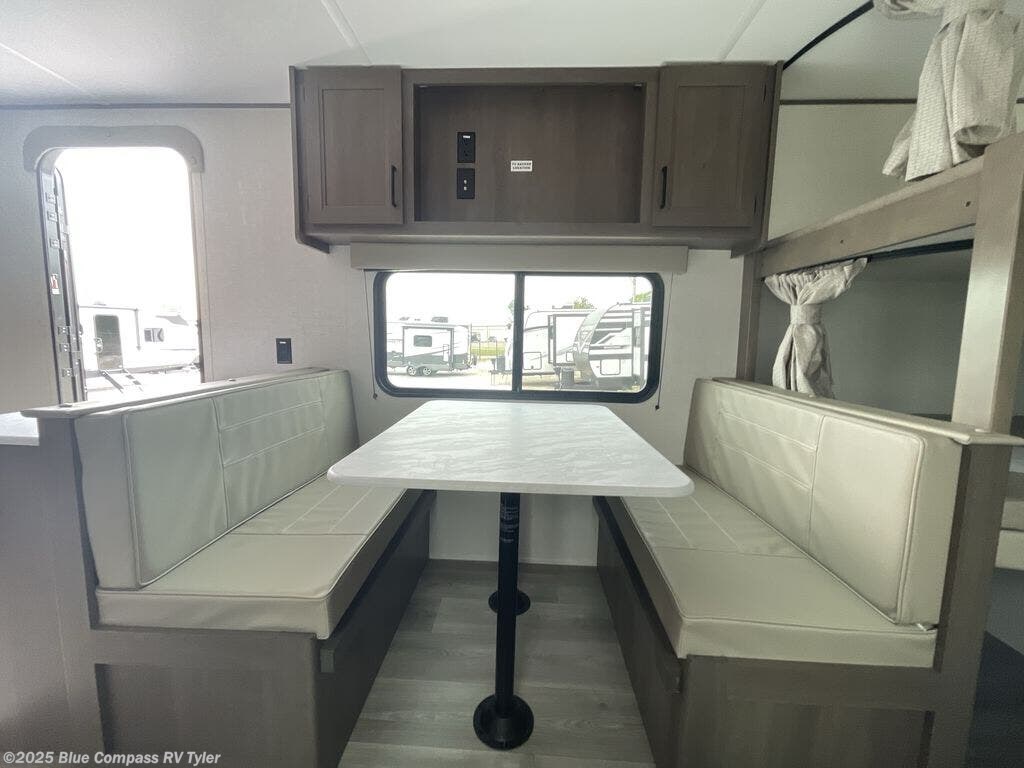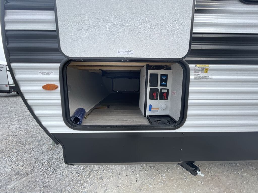 This is the perfect travel trailer if you like to camp with friends and family. Since there are double-size bunks, a queen bed in the front bedroom, plus a booth dinette and sofa, you can sleep eight campers each night! The three burner range and microwave in the kitchen will let you cook meals each day, and the 12V refrigerator will keep your cold items fresh. This model also includes a counter with extra storage underneath, a pull-out trash can storage for convenience, and a full bath to freshen up in each day. And you'll love having your own space in the front bedroom with a privacy curtain, dual wardrobes, and TV prep if you want to add a television!