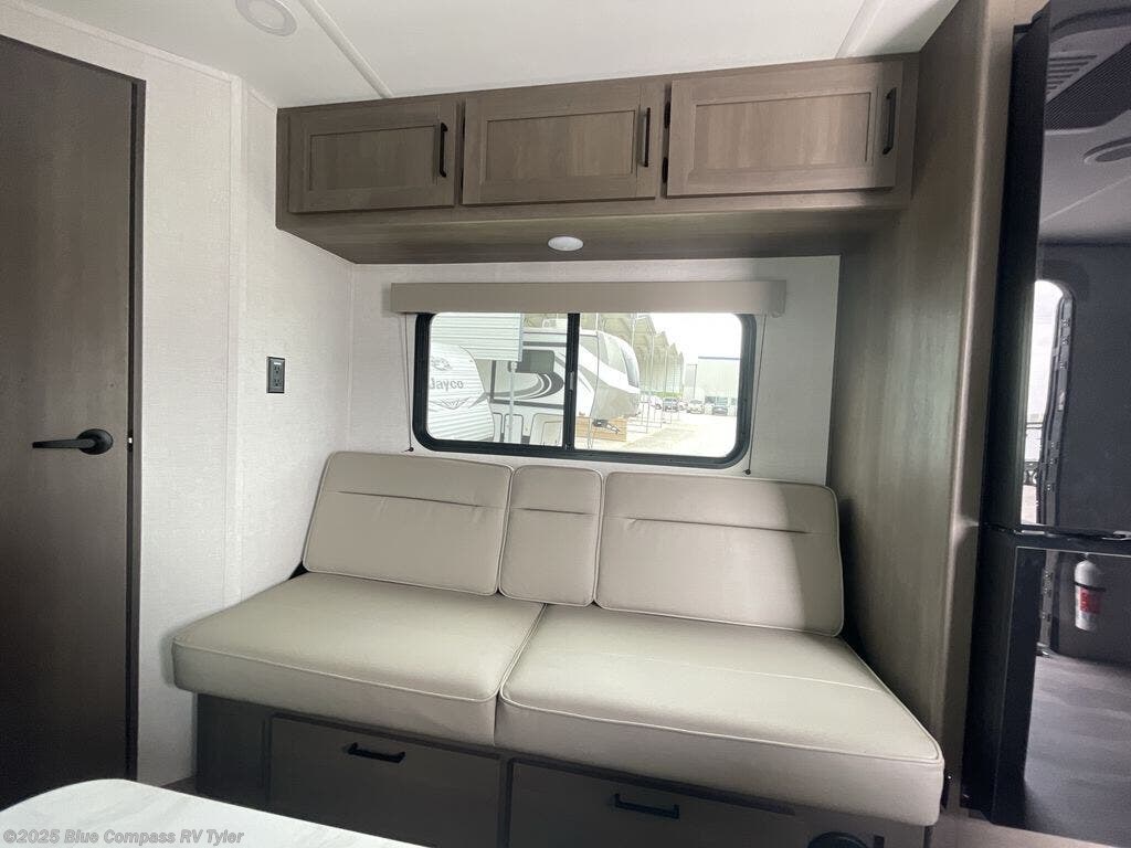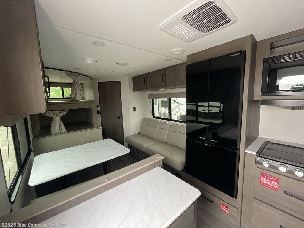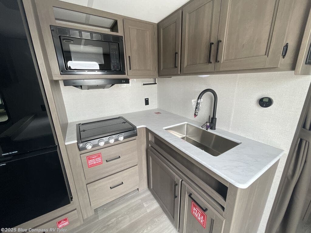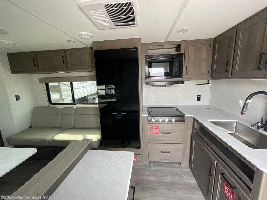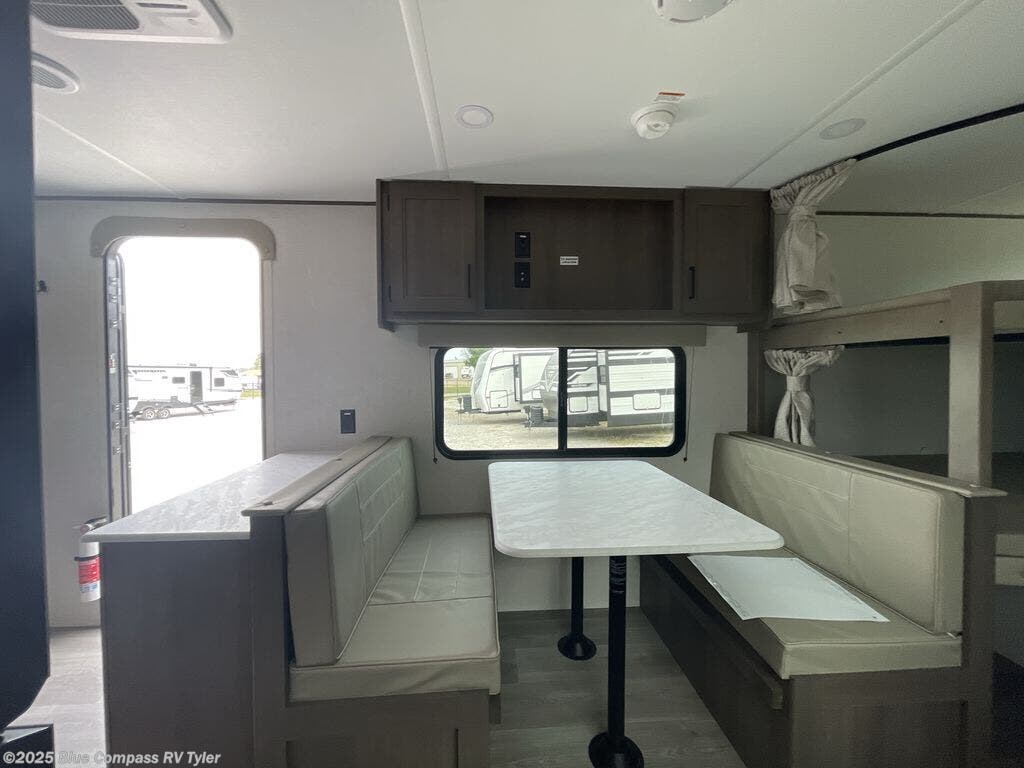 This is the perfect travel trailer if you like to camp with friends and family. Since there are double-size bunks, a queen bed in the front bedroom, plus a booth dinette and sofa, you can sleep eight campers each night! The three burner range and microwave in the kitchen will let you cook meals each day, and the 12V refrigerator will keep your cold items fresh. This model also includes a counter with extra storage underneath, a pull-out trash can storage for convenience, and a full bath to freshen up in each day. And you'll love having your own space in the front bedroom with a privacy curtain, dual wardrobes, and TV prep if you want to add a television!