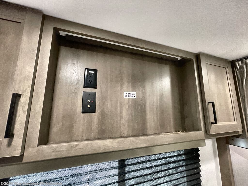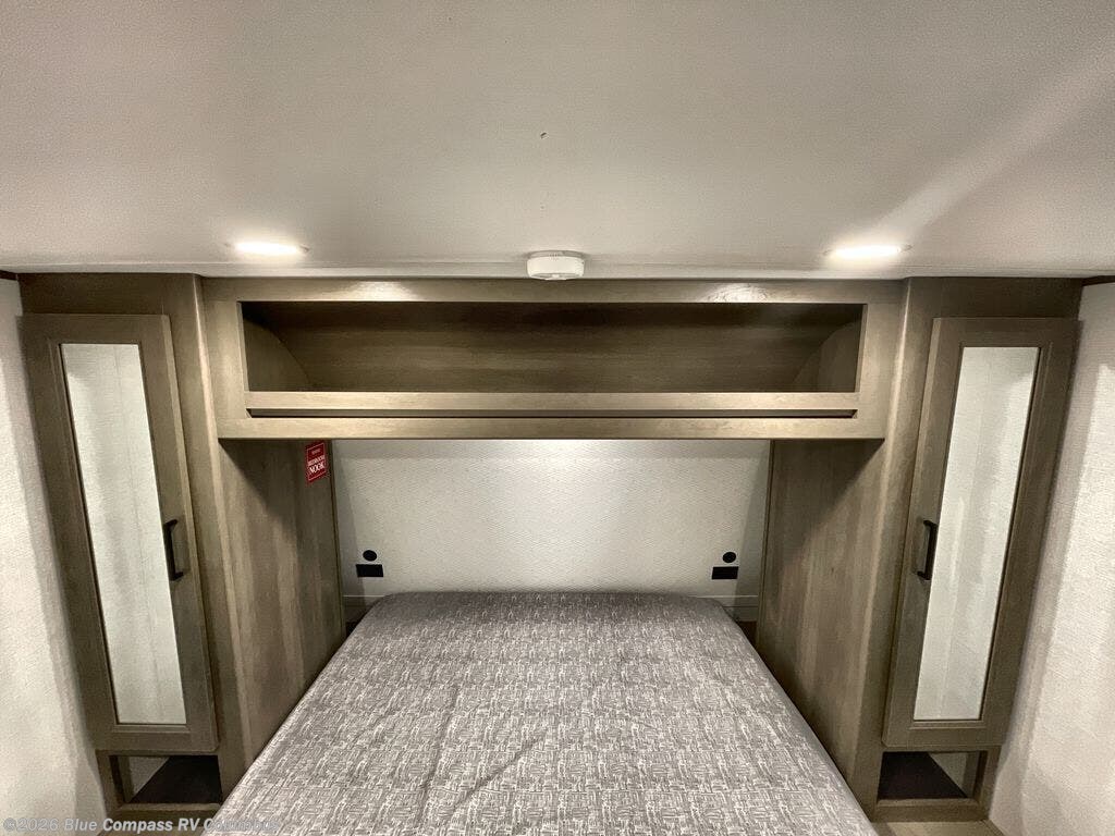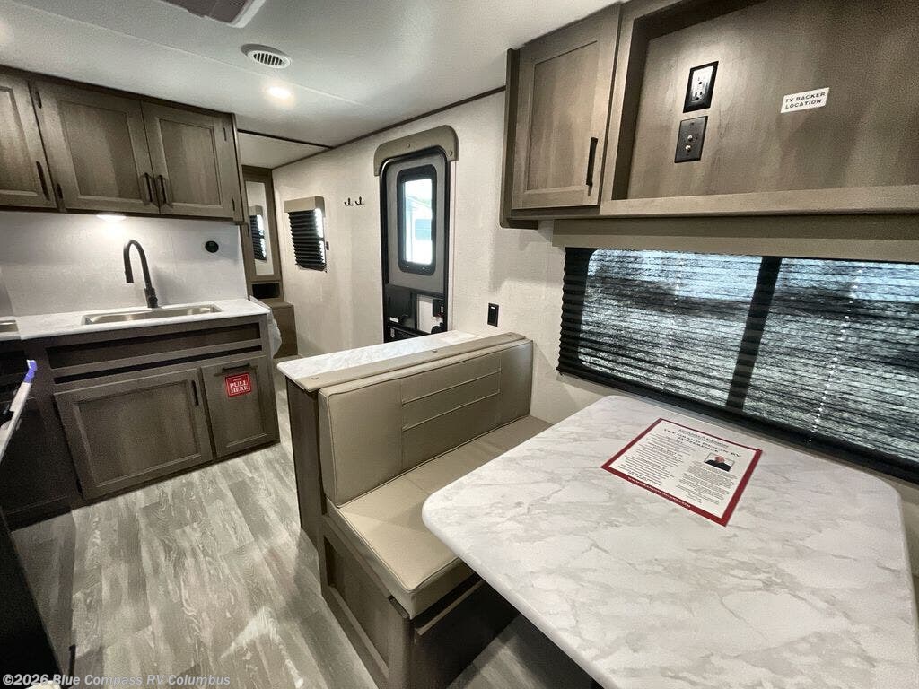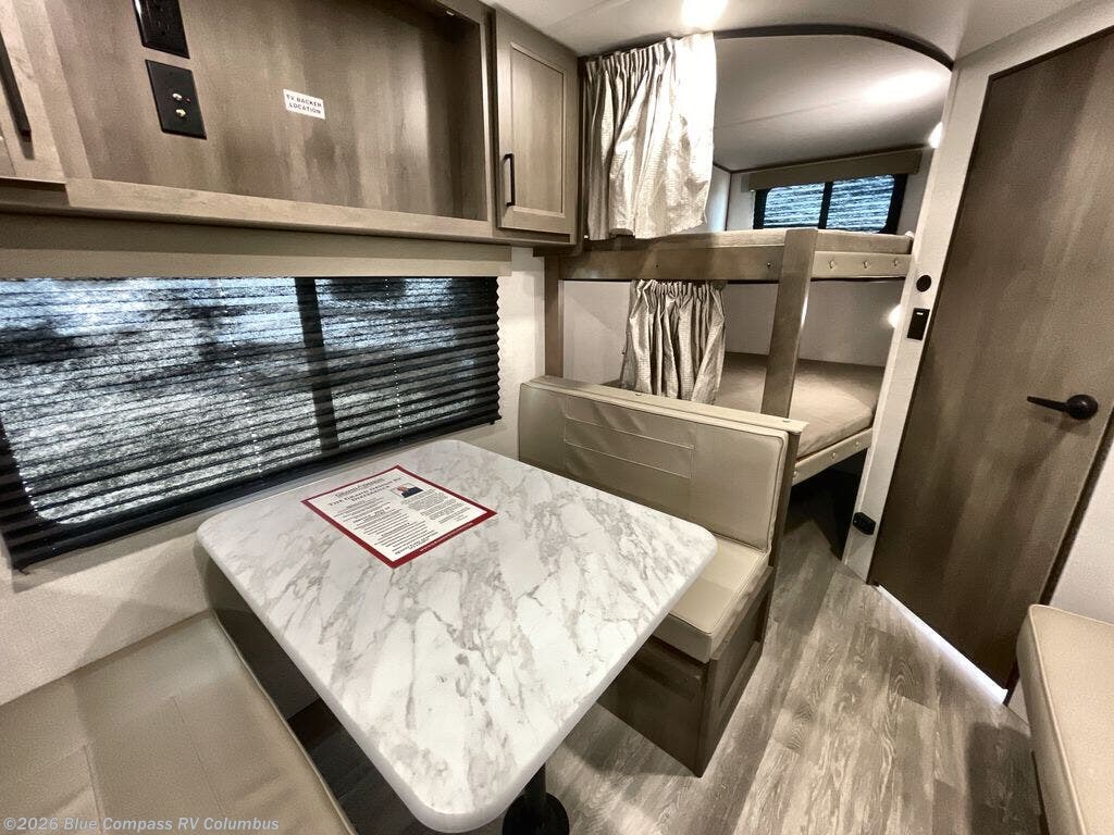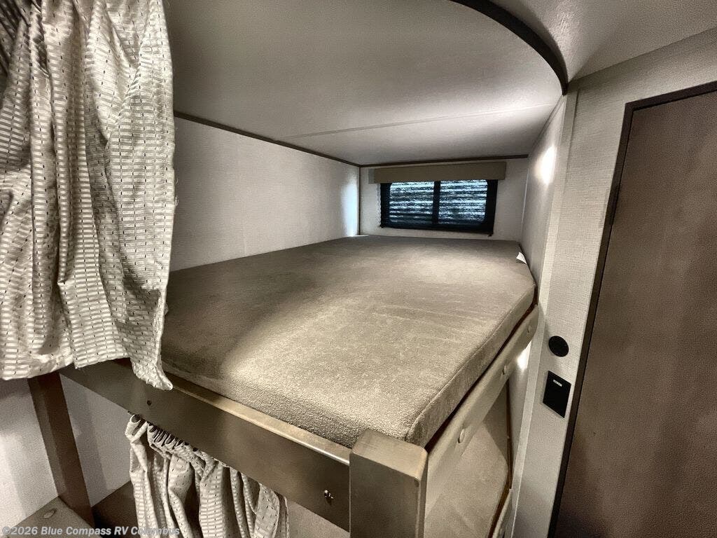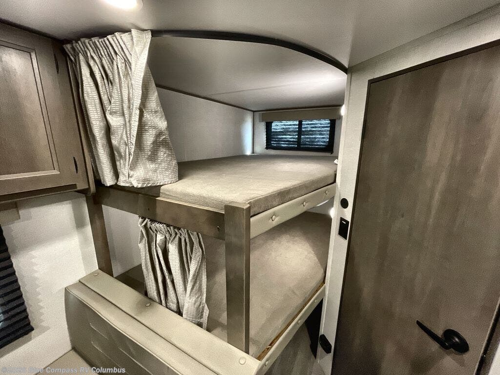 This is the perfect travel trailer if you like to camp with friends and family. Since there are double-size bunks, a queen bed in the front bedroom, plus a booth dinette and sofa, you can sleep eight campers each night! The three burner range and microwave in the kitchen will let you cook meals each day, and the 12V refrigerator will keep your cold items fresh. This model also includes a counter with extra storage underneath, a pull-out trash can storage for convenience, and a full bath to freshen up in each day. And you'll love having your own space in the front bedroom with a privacy curtain, dual wardrobes, and TV prep if you want to add a television!
