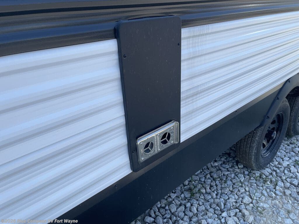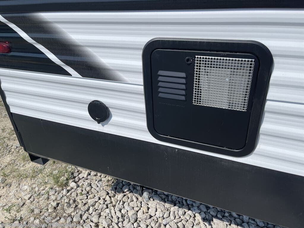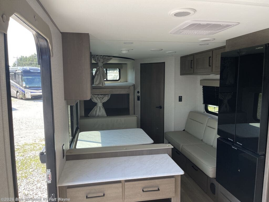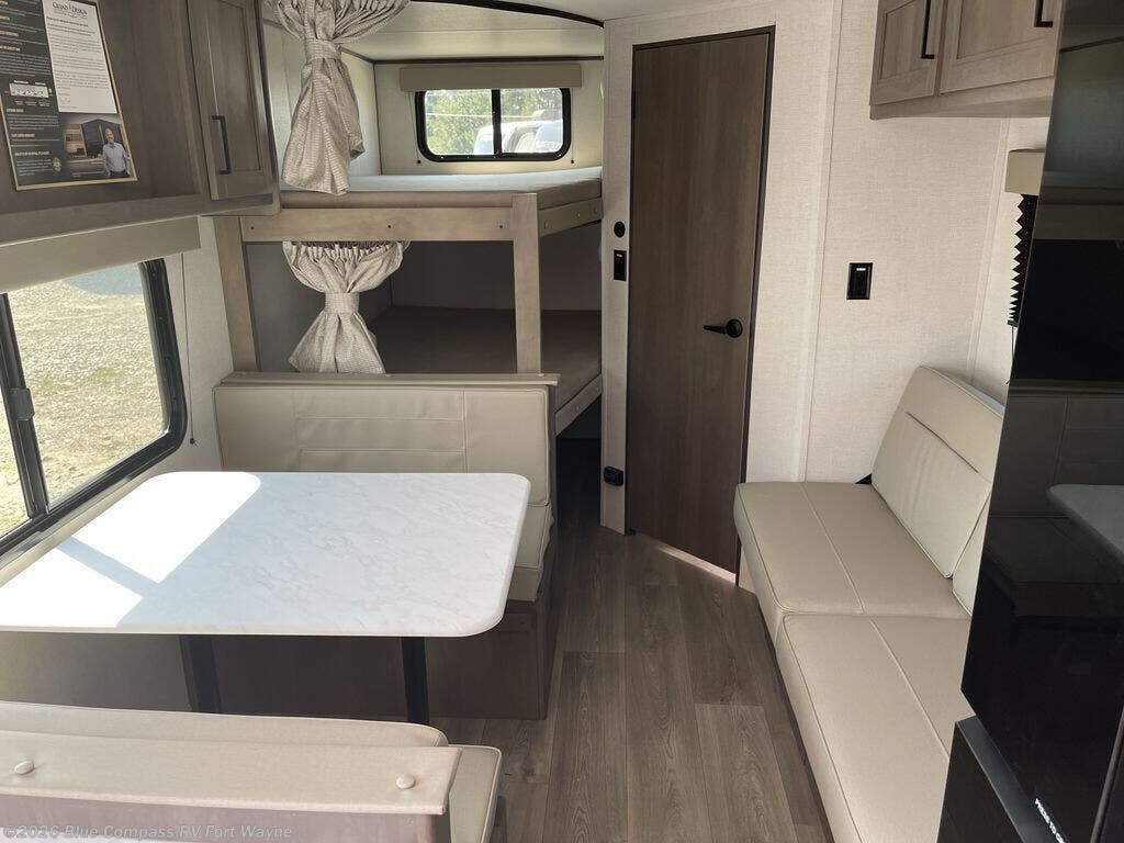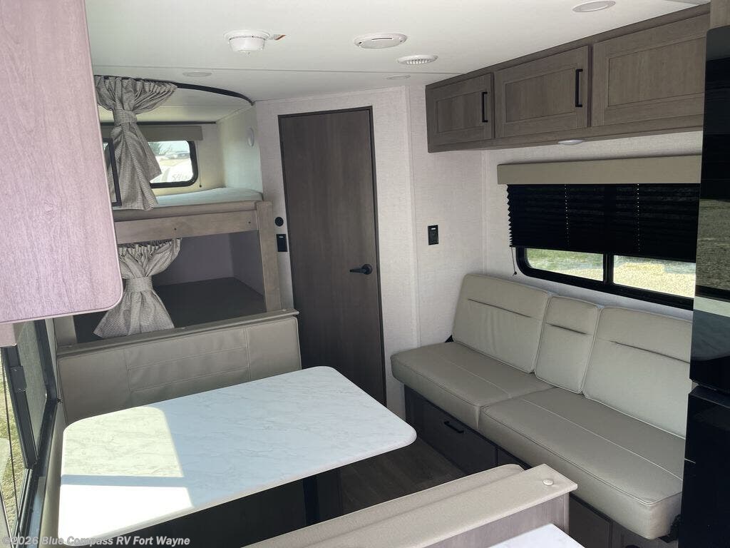 This is the perfect travel trailer if you like to camp with friends and family. Since there are double-size bunks, a queen bed in the front bedroom, plus a booth dinette and sofa, you can sleep eight campers each night! The three burner range and microwave in the kitchen will let you cook meals each day, and the 12V refrigerator will keep your cold items fresh. This model also includes a counter with extra storage underneath, a pull-out trash can storage for convenience, and a full bath to freshen up in each day. And you'll love having your own space in the front bedroom with a privacy curtain, dual wardrobes, and TV prep if you want to add a television!
