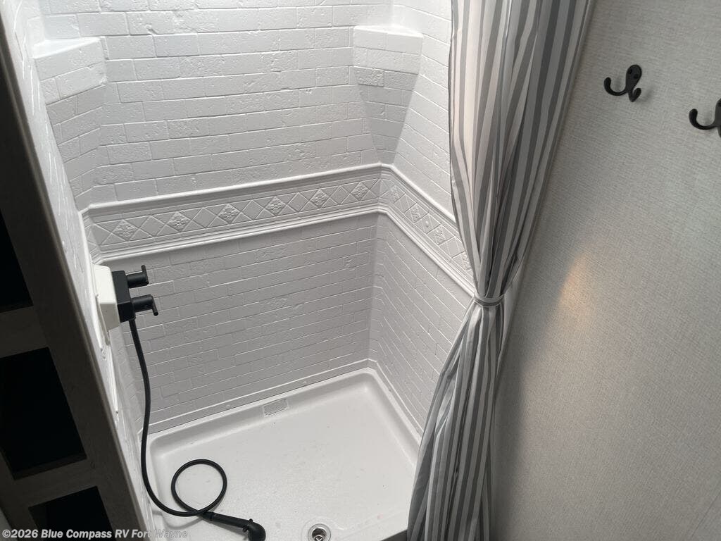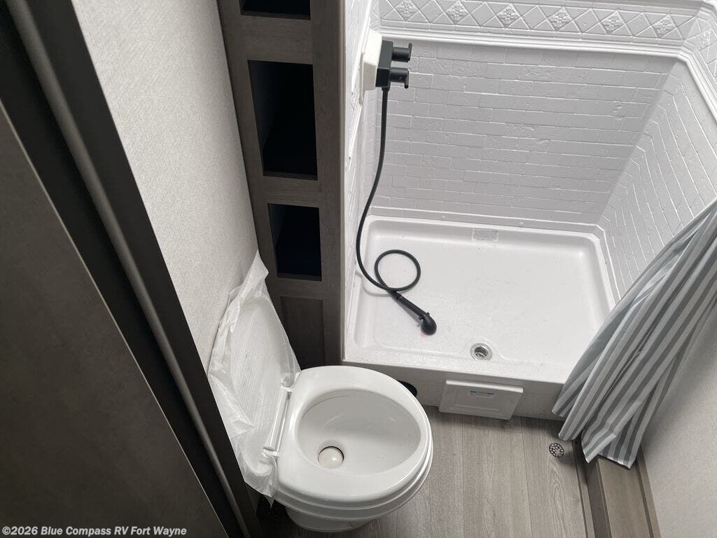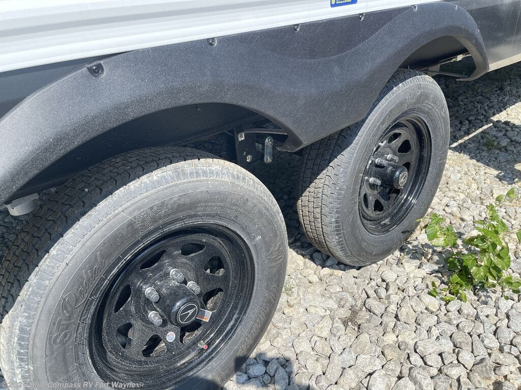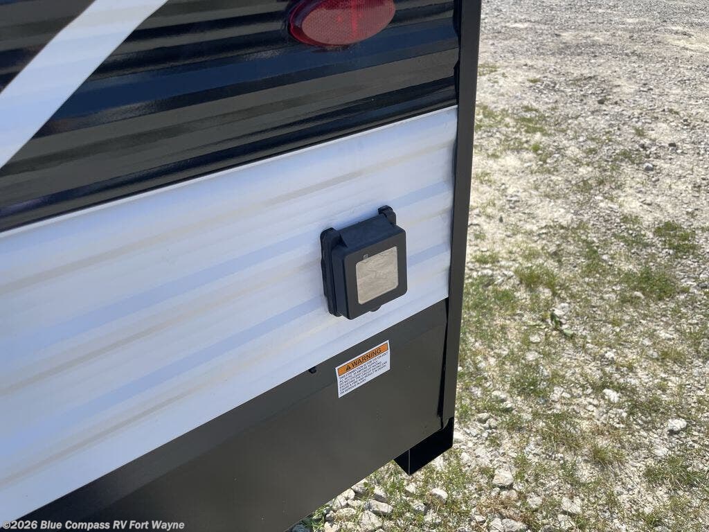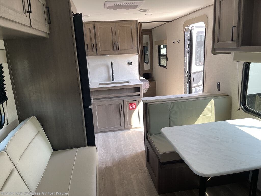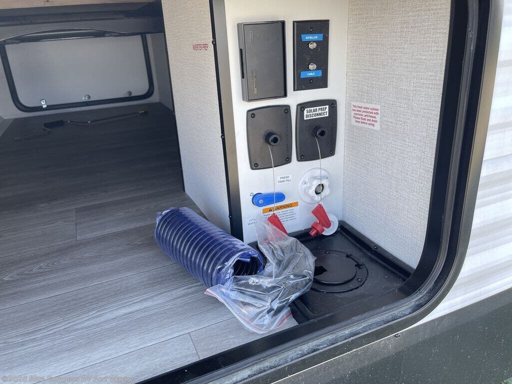 This is the perfect travel trailer if you like to camp with friends and family. Since there are double-size bunks, a queen bed in the front bedroom, plus a booth dinette and sofa, you can sleep eight campers each night! The three burner range and microwave in the kitchen will let you cook meals each day, and the 12V refrigerator will keep your cold items fresh. This model also includes a counter with extra storage underneath, a pull-out trash can storage for convenience, and a full bath to freshen up in each day. And you'll love having your own space in the front bedroom with a privacy curtain, dual wardrobes, and TV prep if you want to add a television!