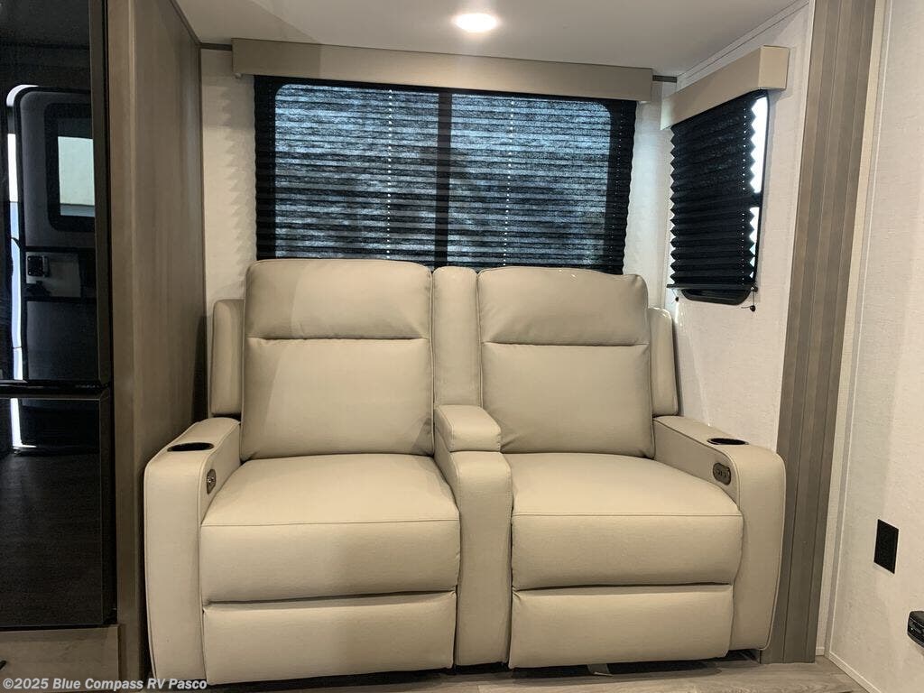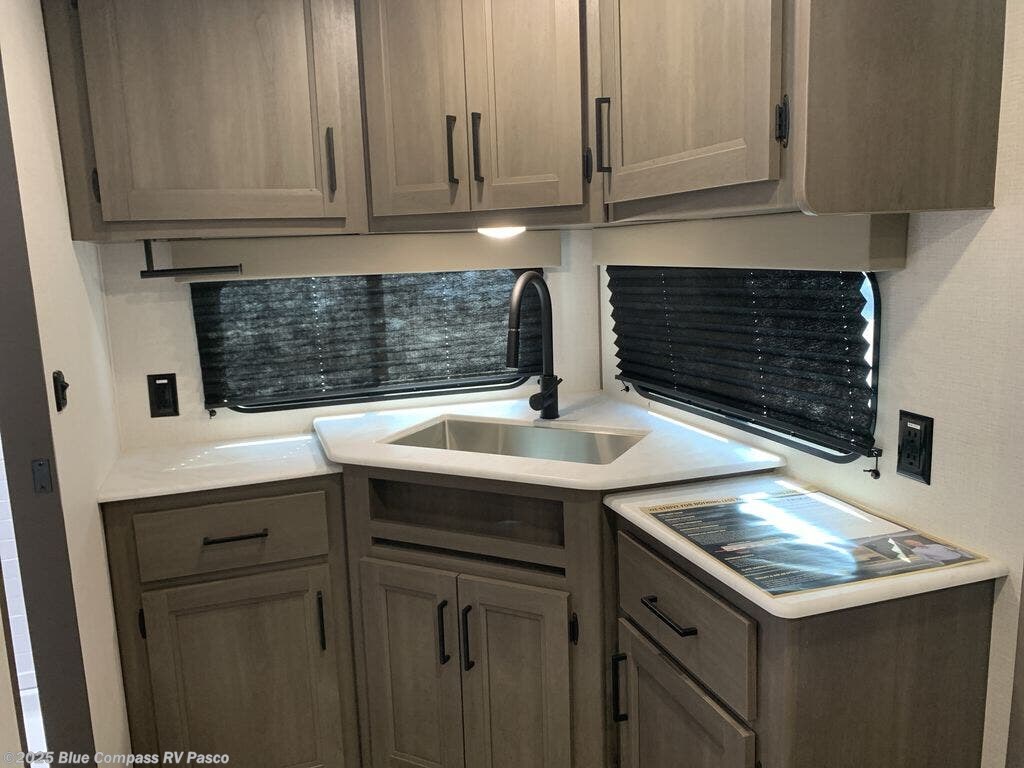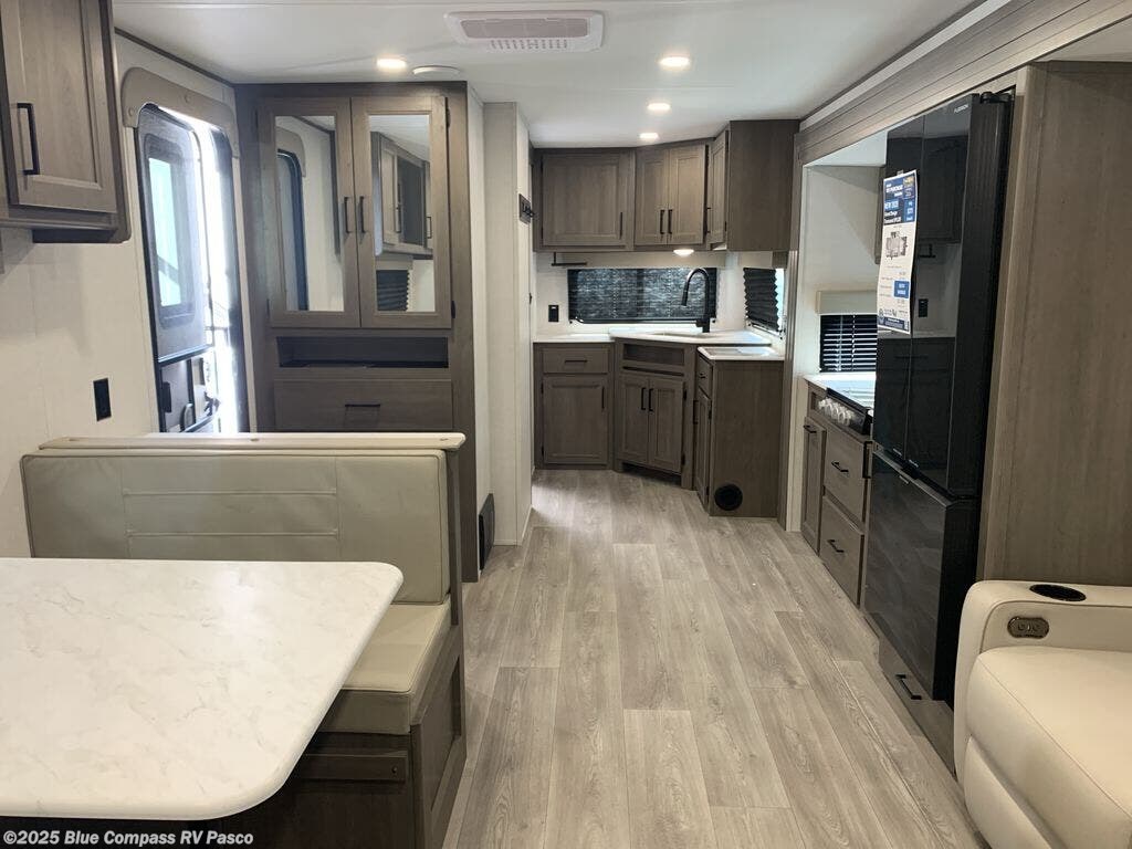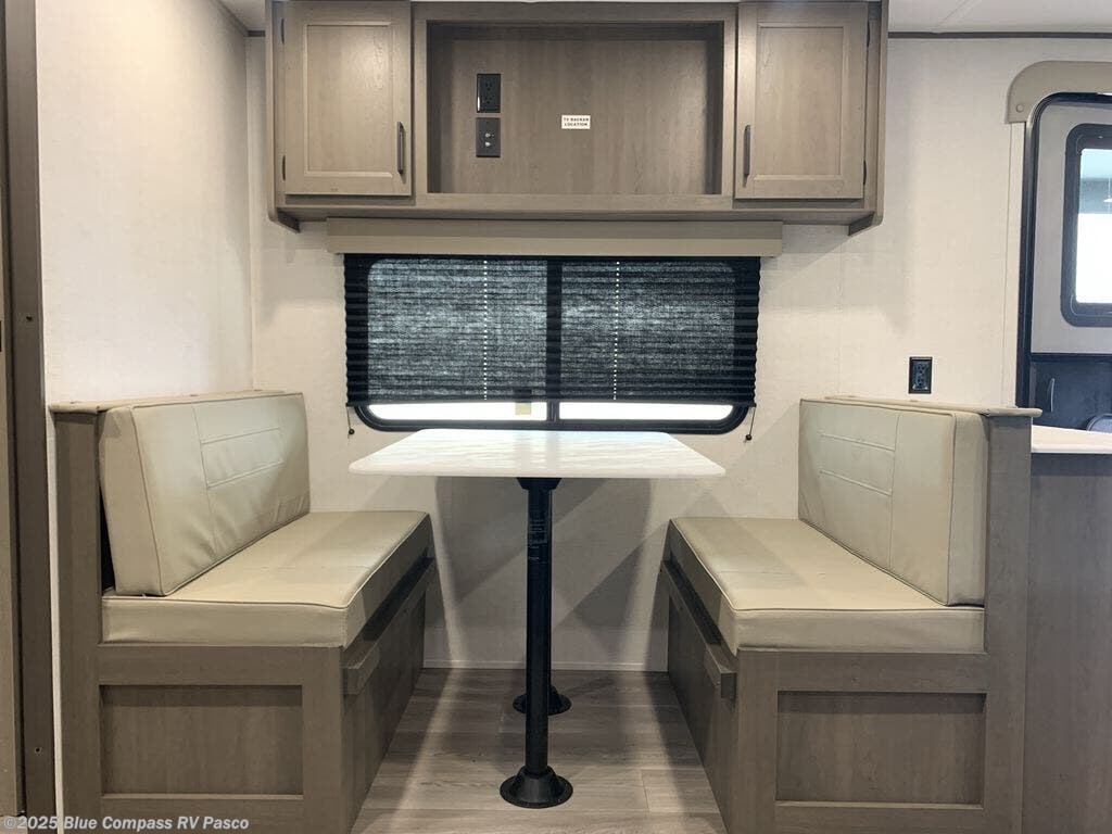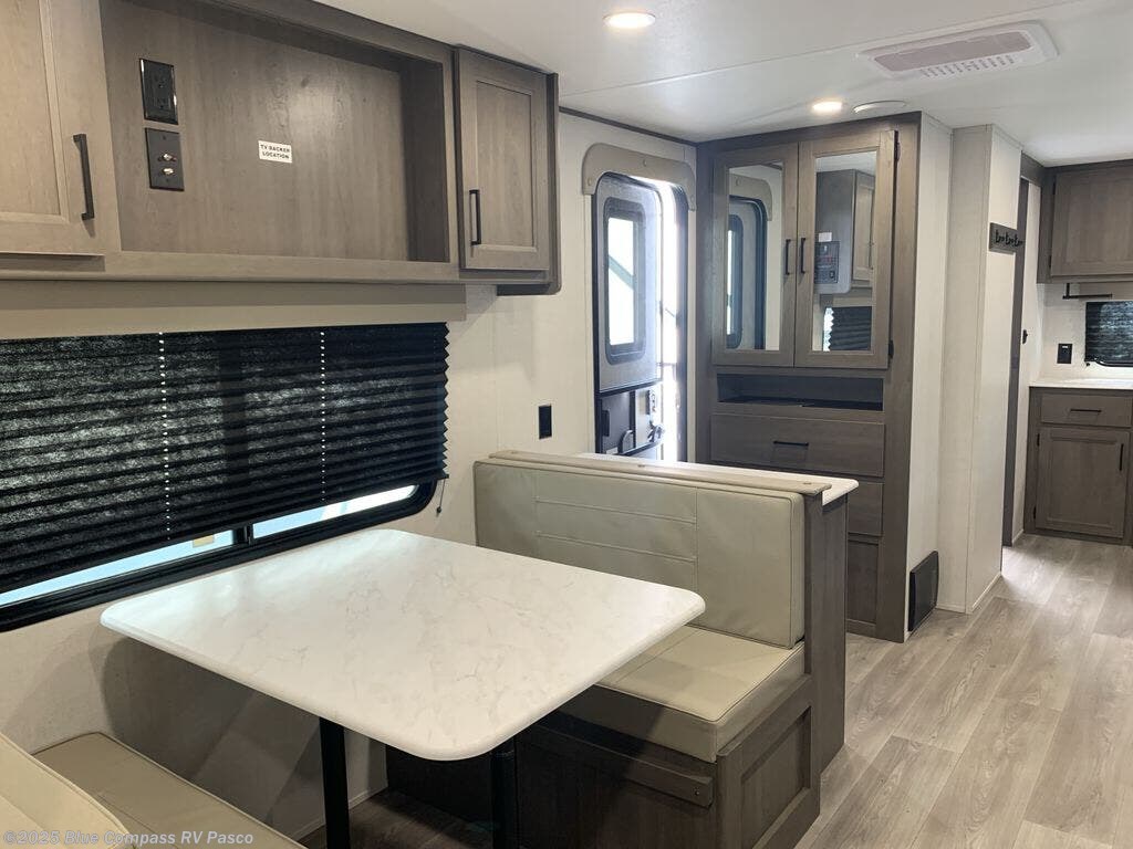 It will be so easy to enjoy camping trips in this travel trailer for five to six! The main living area is made spacious by the large slide out, and here you'll find the 60" sleeper sofa and the kitchen appliances. A booth dinette across the room provides a place to dine and play board games, or you can head outdoors to sit under the 17' power awning with LED lights. The queen bed in the front private bedroom will have you feeling right at home, and the TV prep here gives you the option to watch movies in bed. This model also includes a rear corner kitchen with ample counter space and a large sink, and you'll find the full bath in the other rear corner!