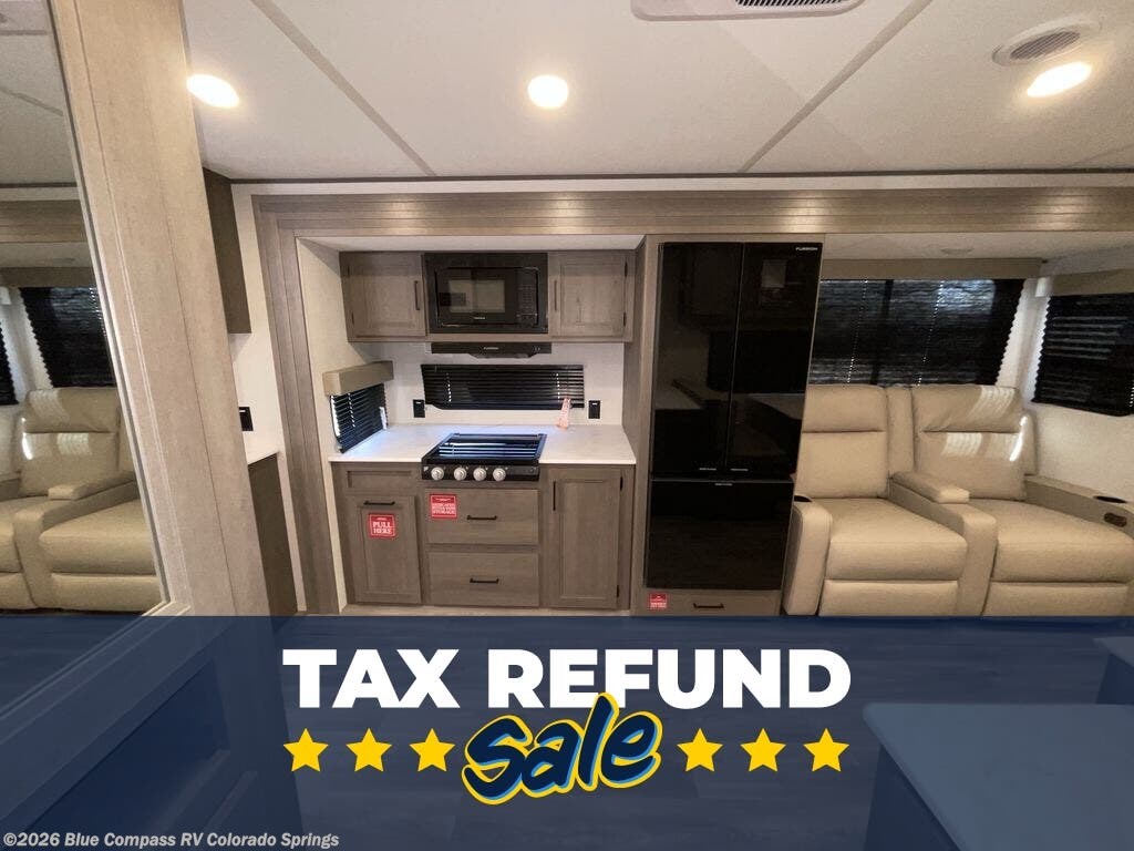 It will be so easy to enjoy camping trips in this travel trailer for five to six! The main living area is made spacious by the large slide out, and here you'll find the 60" sleeper sofa and the kitchen appliances. A booth dinette across the room provides a place to dine and play board games, or you can head outdoors to sit under the 17' power awning with LED lights. The queen bed in the front private bedroom will have you feeling right at home, and the TV prep here gives you the option to watch movies in bed. This model also includes a rear corner kitchen with ample counter space and a large sink, and you'll find the full bath in the other rear corner!