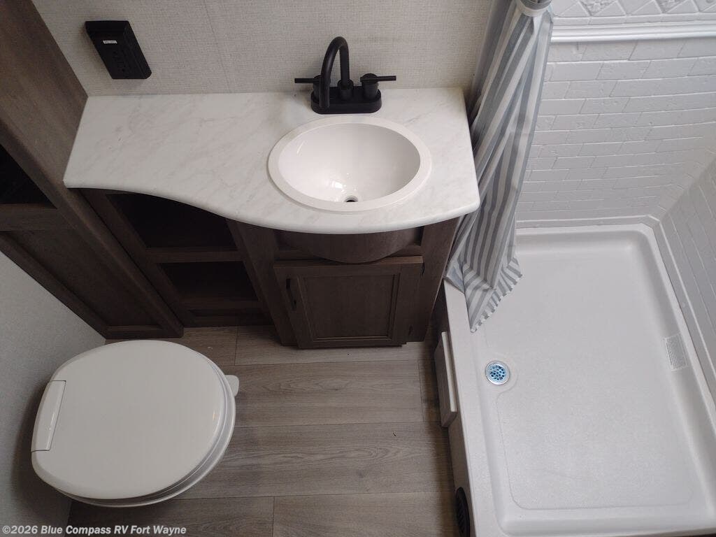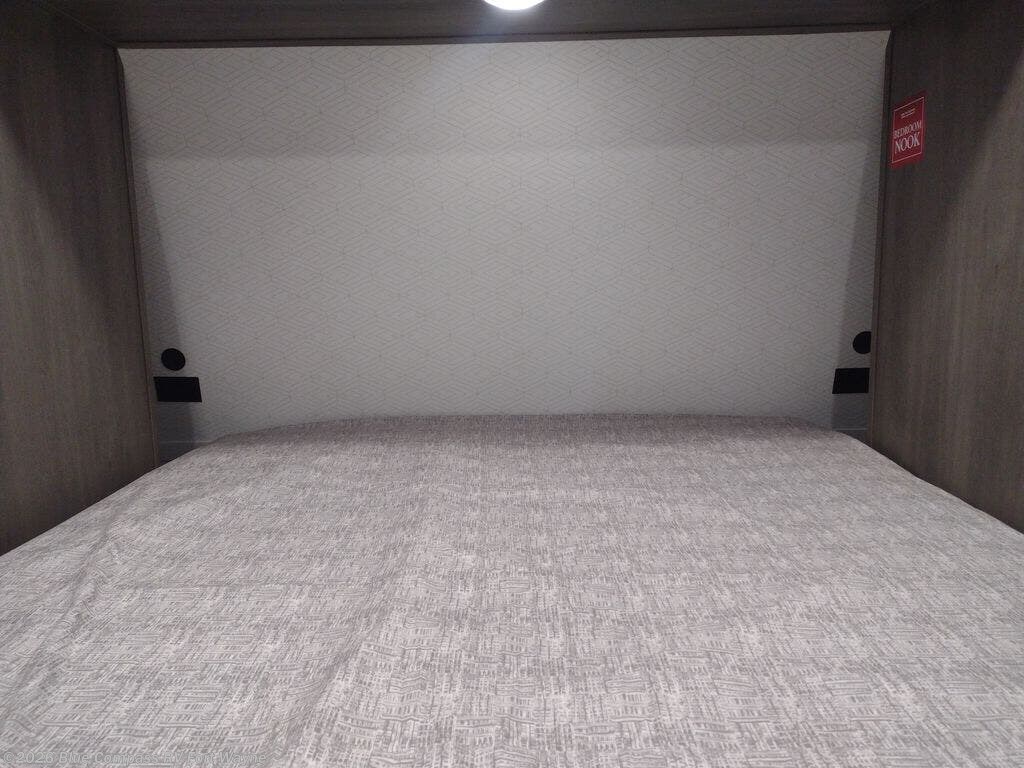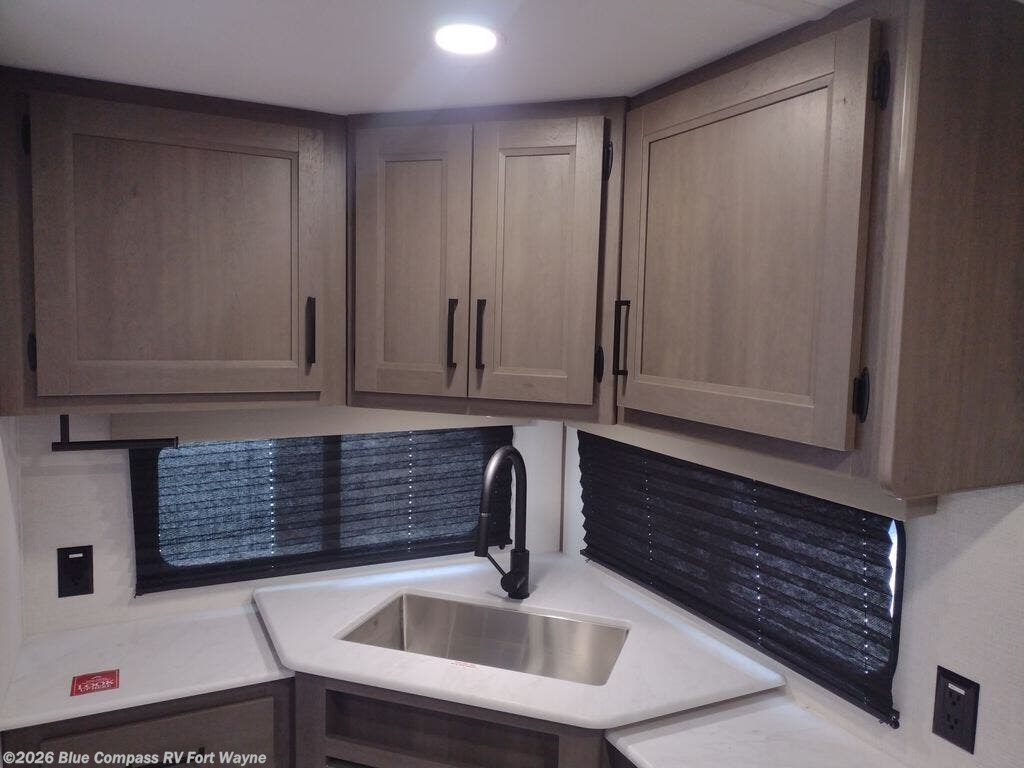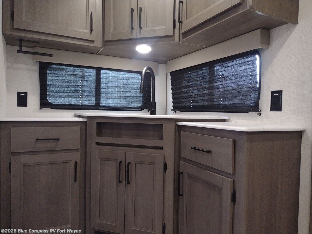 It will be so easy to enjoy camping trips in this travel trailer for five to six! The main living area is made spacious by the large slide out, and here you'll find the 60" sleeper sofa and the kitchen appliances. A booth dinette across the room provides a place to dine and play board games, or you can head outdoors to sit under the 17' power awning with LED lights. The queen bed in the front private bedroom will have you feeling right at home, and the TV prep here gives you the option to watch movies in bed. This model also includes a rear corner kitchen with ample counter space and a large sink, and you'll find the full bath in the other rear corner!