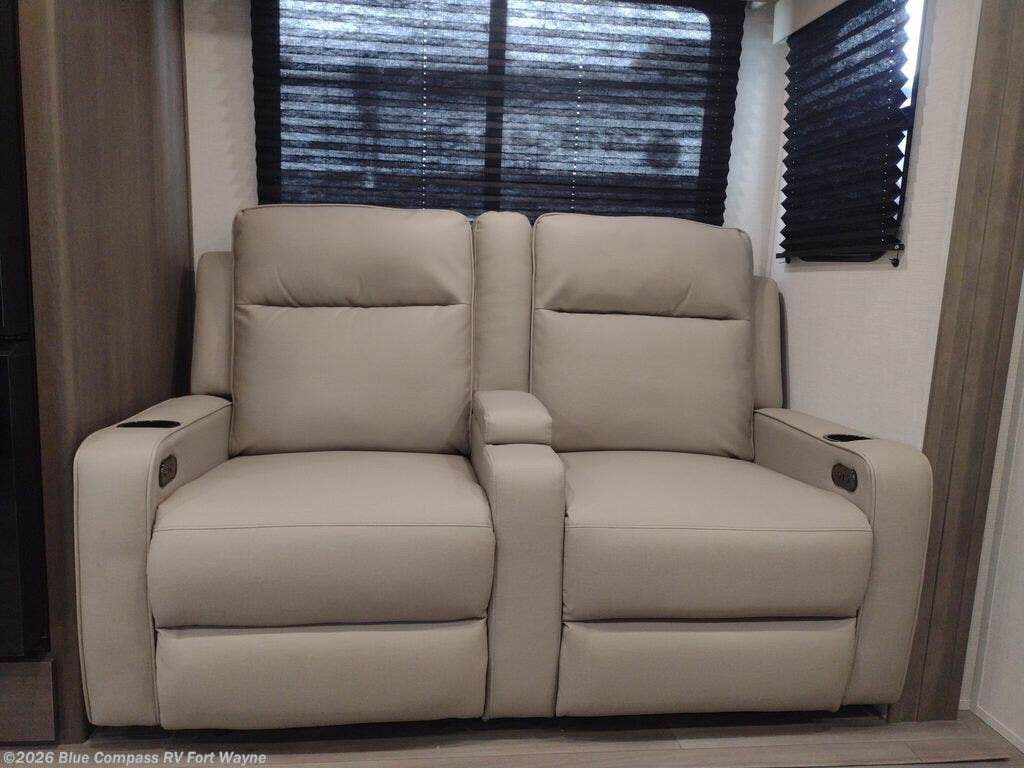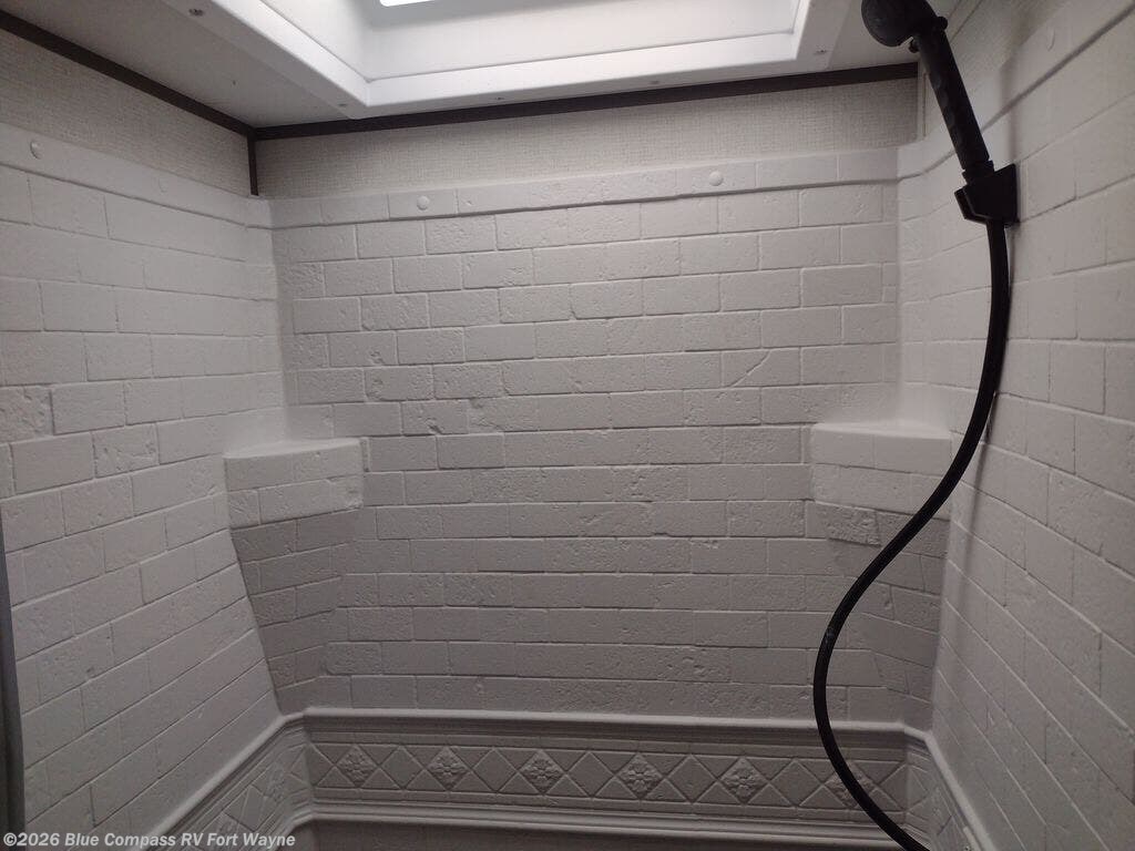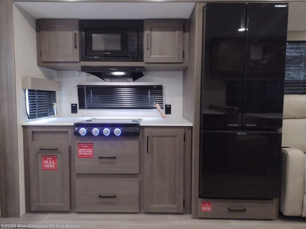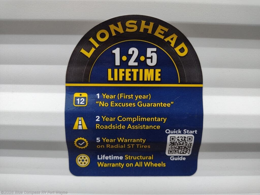 It will be so easy to enjoy camping trips in this travel trailer for five to six! The main living area is made spacious by the large slide out, and here you'll find the 60" sleeper sofa and the kitchen appliances. A booth dinette across the room provides a place to dine and play board games, or you can head outdoors to sit under the 17' power awning with LED lights. The queen bed in the front private bedroom will have you feeling right at home, and the TV prep here gives you the option to watch movies in bed. This model also includes a rear corner kitchen with ample counter space and a large sink, and you'll find the full bath in the other rear corner!