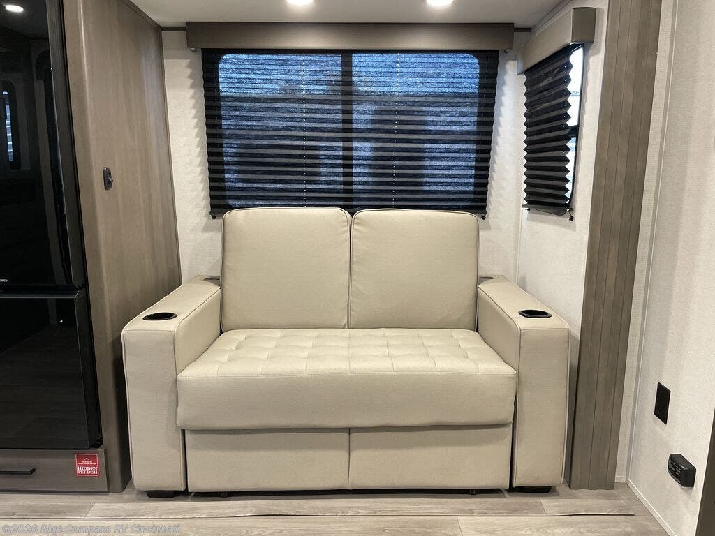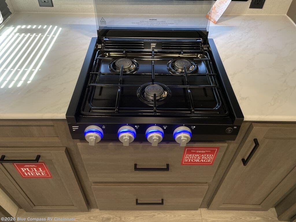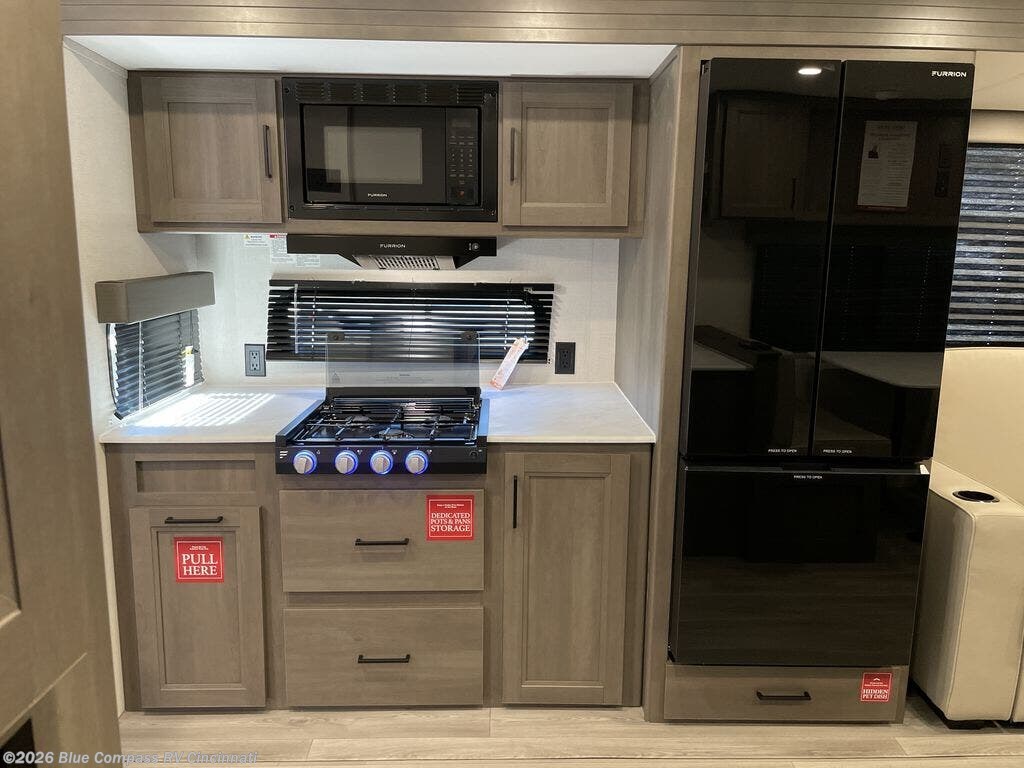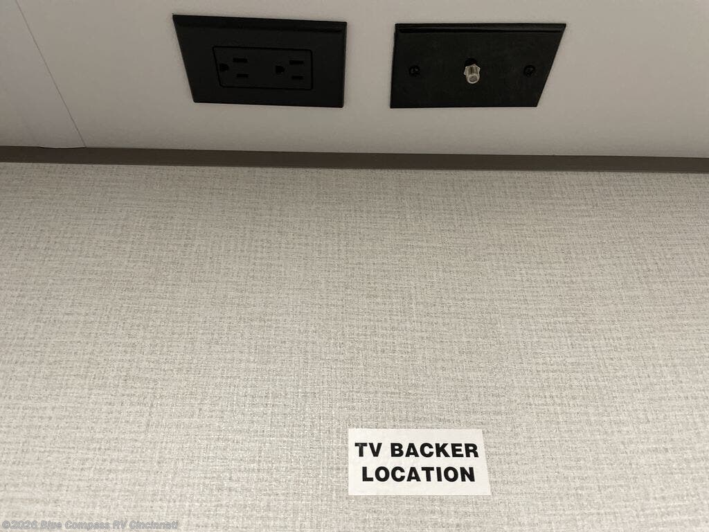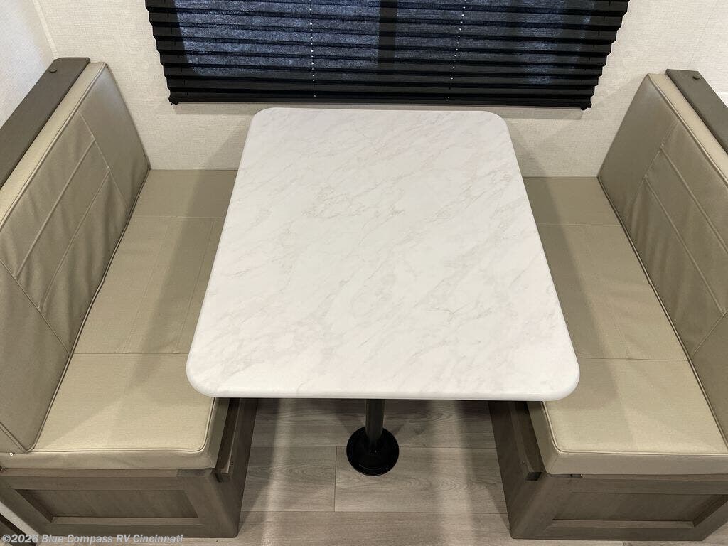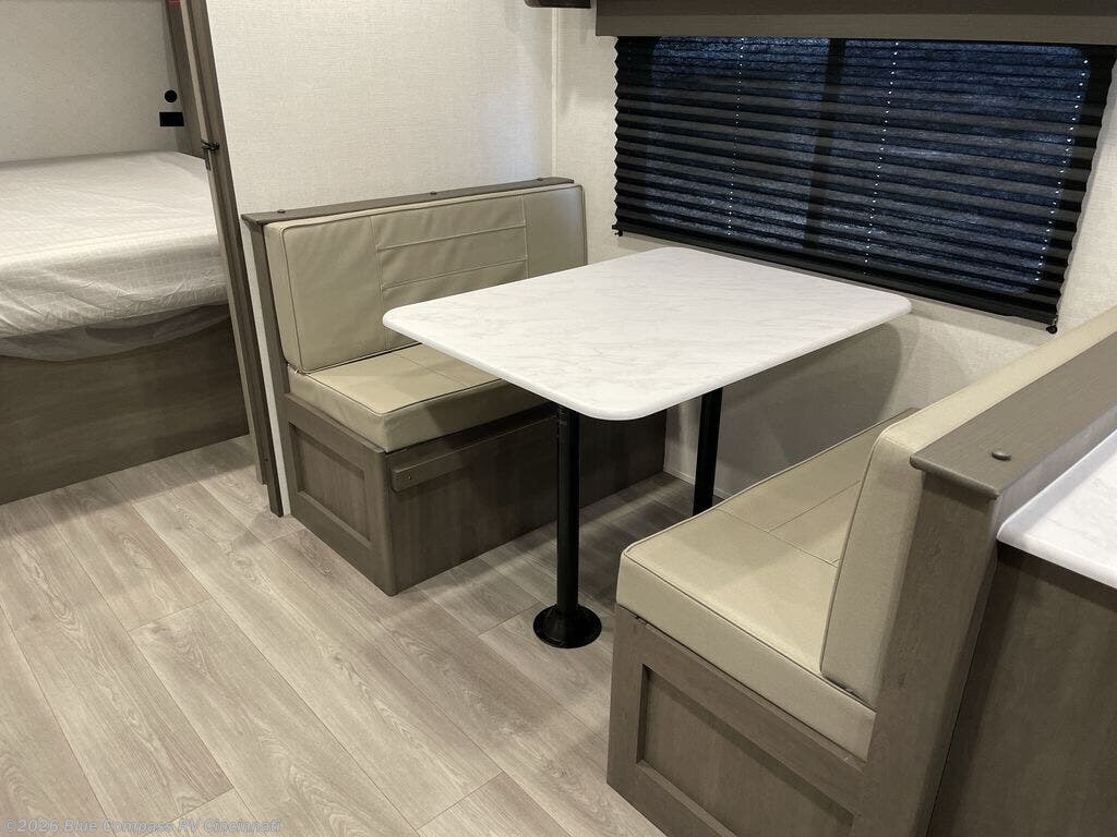 It will be so easy to enjoy camping trips in this travel trailer for five to six! The main living area is made spacious by the large slide out, and here you'll find the 60" sleeper sofa and the kitchen appliances. A booth dinette across the room provides a place to dine and play board games, or you can head outdoors to sit under the 17' power awning with LED lights. The queen bed in the front private bedroom will have you feeling right at home, and the TV prep here gives you the option to watch movies in bed. This model also includes a rear corner kitchen with ample counter space and a large sink, and you'll find the full bath in the other rear corner!