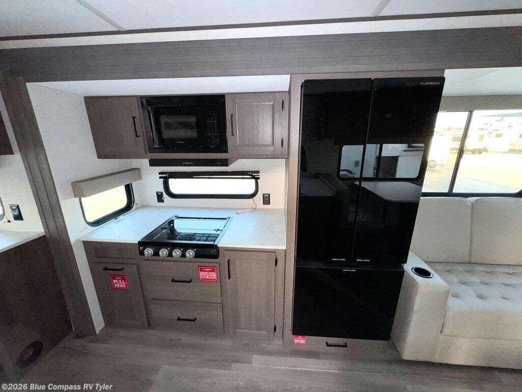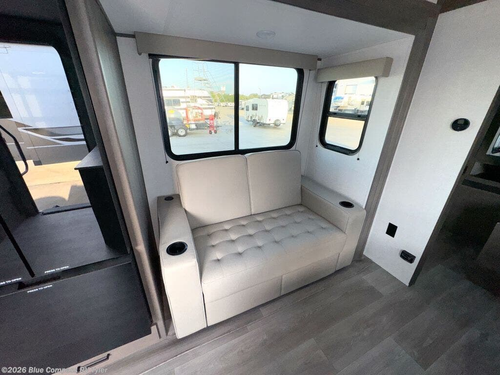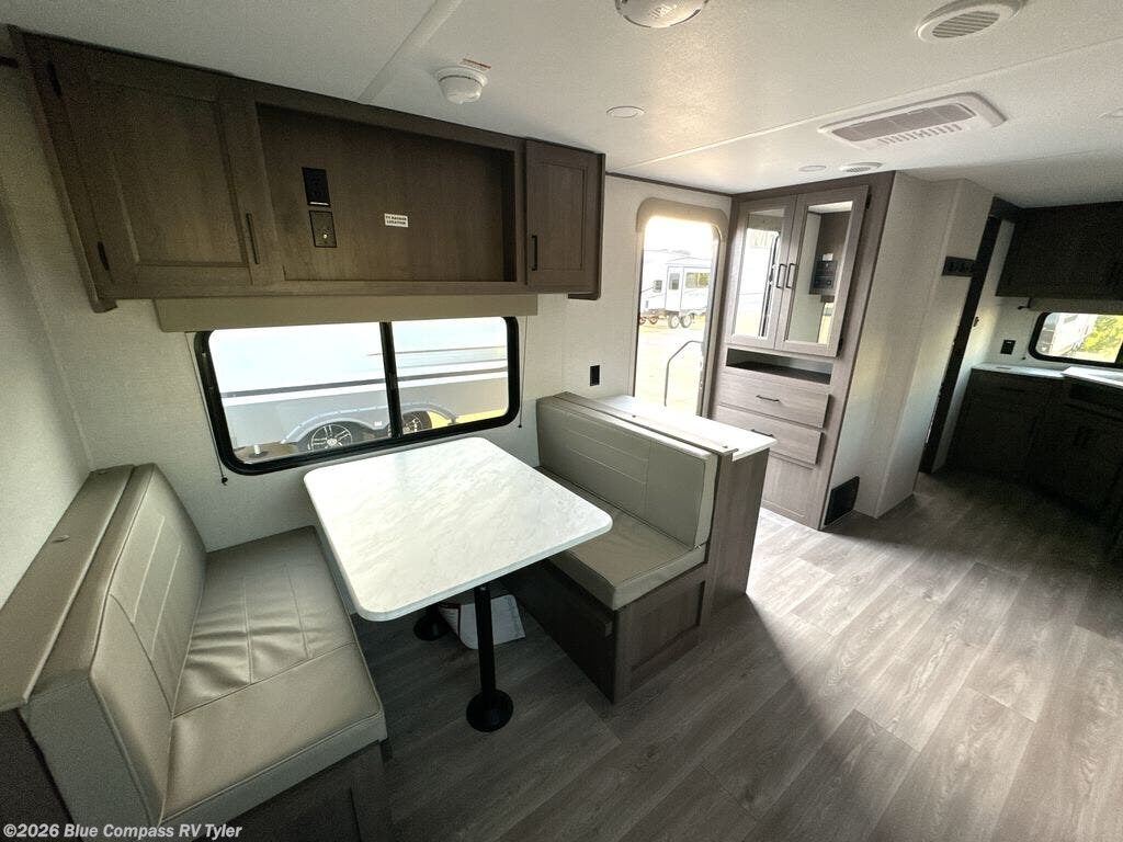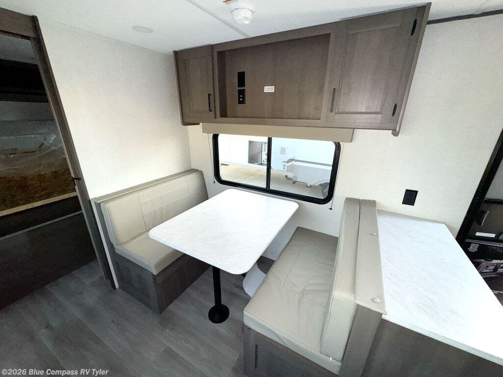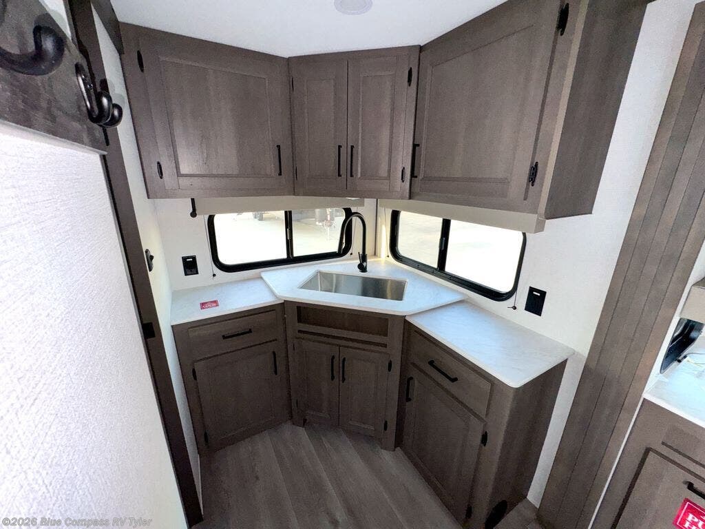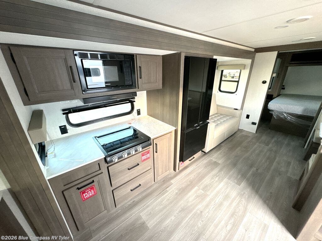 It will be so easy to enjoy camping trips in this travel trailer for five to six! The main living area is made spacious by the large slide out, and here you'll find the 60" sleeper sofa and the kitchen appliances. A booth dinette across the room provides a place to dine and play board games, or you can head outdoors to sit under the 17' power awning with LED lights. The queen bed in the front private bedroom will have you feeling right at home, and the TV prep here gives you the option to watch movies in bed. This model also includes a rear corner kitchen with ample counter space and a large sink, and you'll find the full bath in the other rear corner!