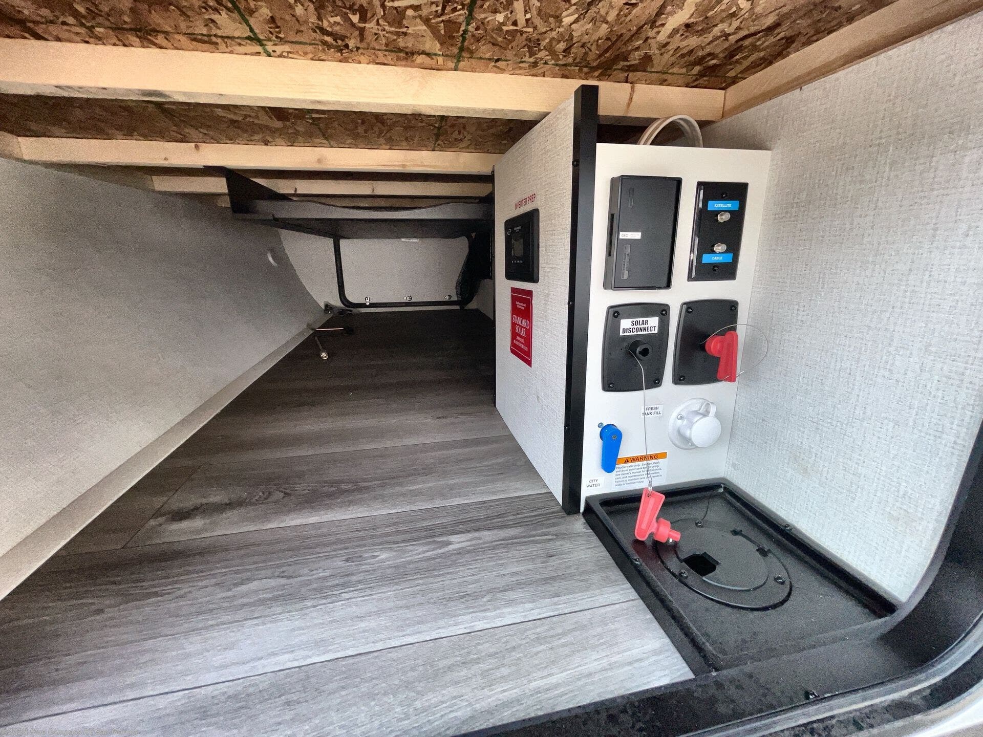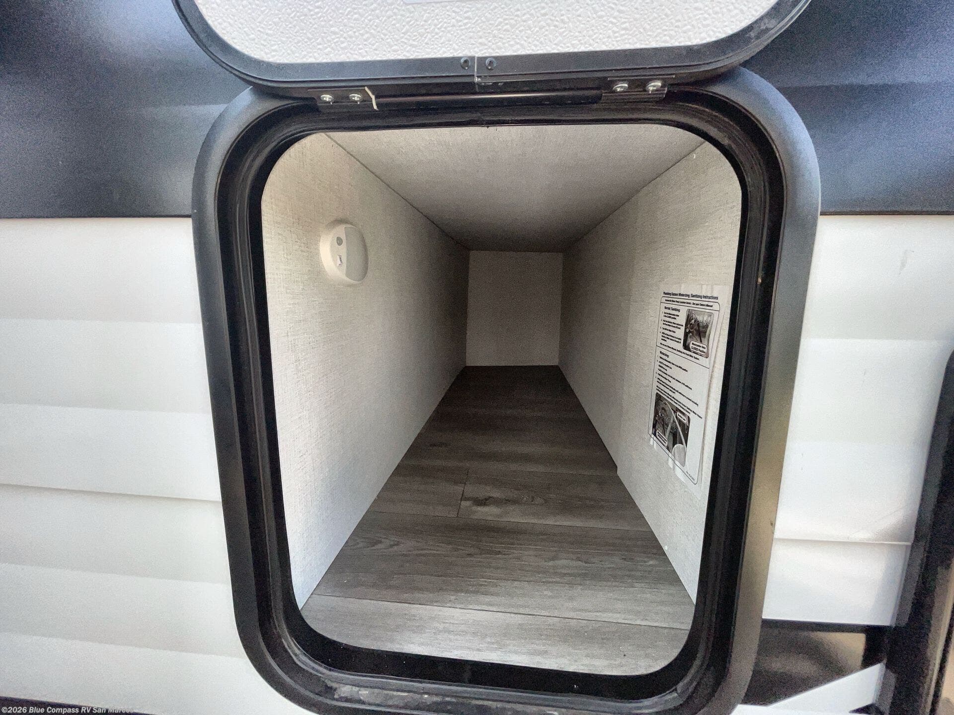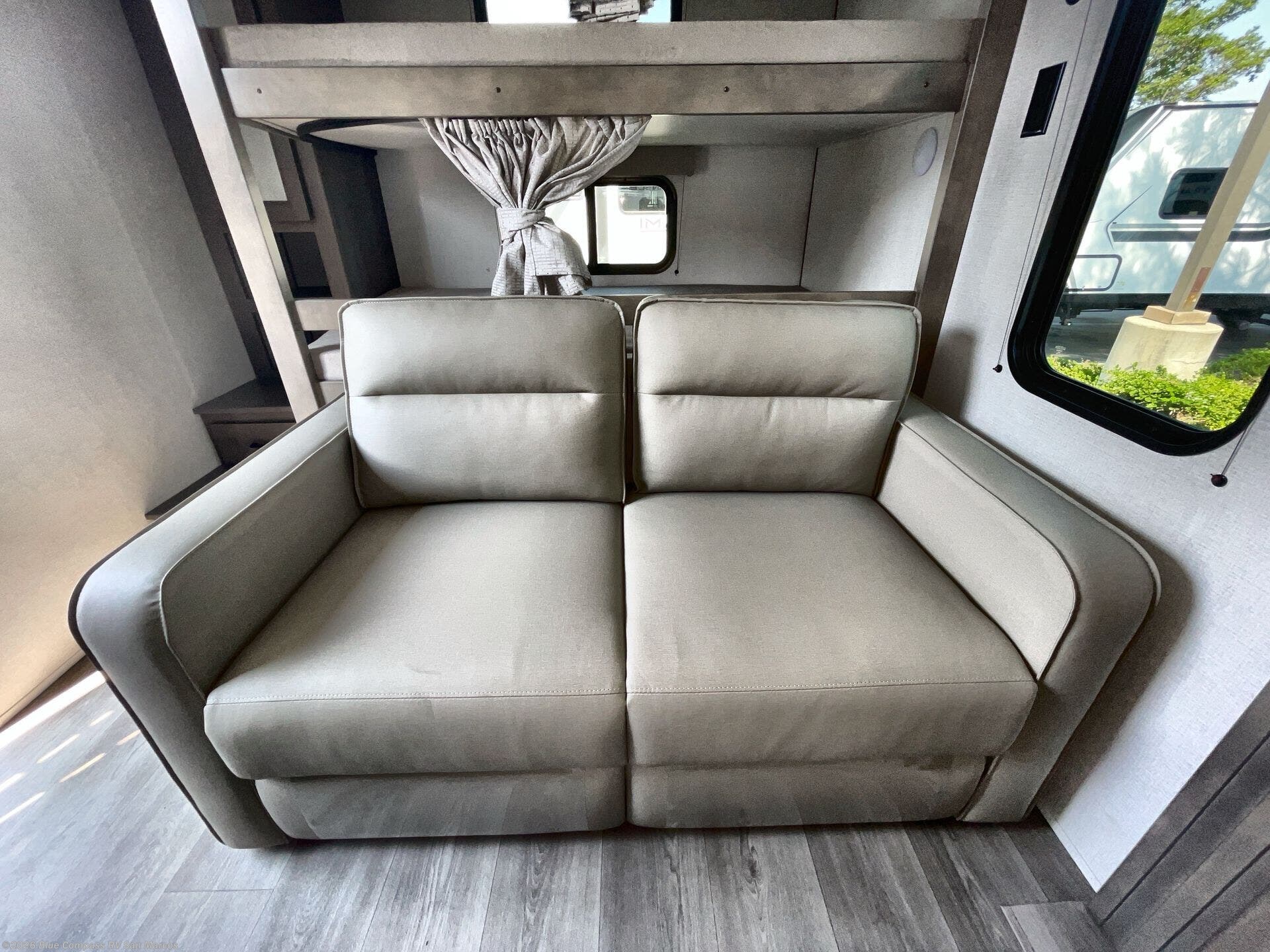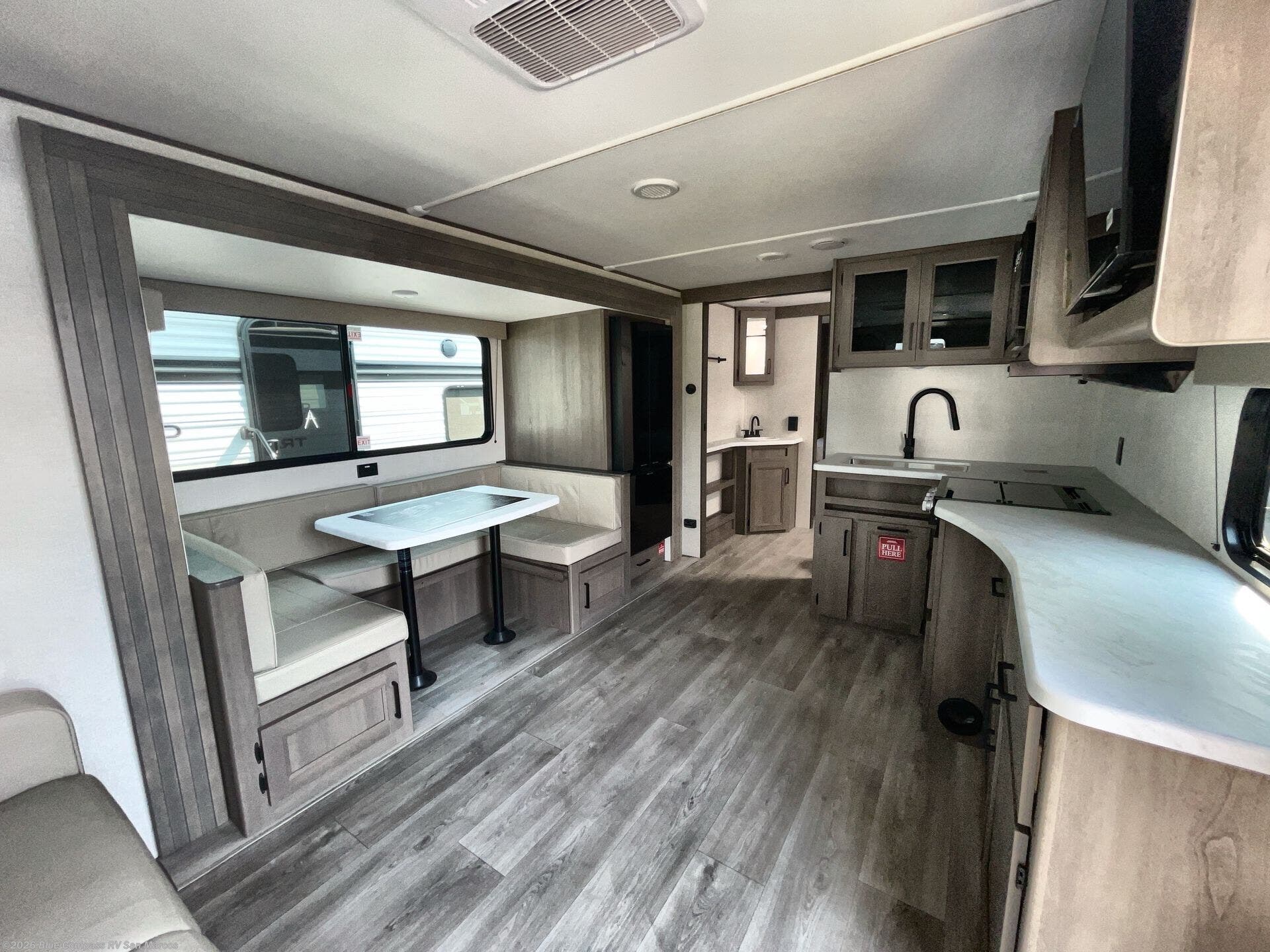 Are you ready to camp in comfort with your family or friends? This travel trailer allows you to do just that! There are double-size bunks in the back with step storage for books or board games. There is also a closet here to keep clothes wrinkle-free. The large slide features a U-Shaped dinette which is perfect for everyone to gather for a meal or games, and there is also theater seating adjacent to the slide. This model features a walk-through bath that leads to the front master bedroom. You'll love the queen bed here, overhead storage, and your own exterior entry door for convenience.