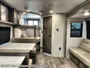 Camping with your larger family or when you want to take along a few extra friends is easy with this trailer. This unit sleeps nine with the double-size bunks in the rear corner, the 60" roll over sofa, and the queen bed in the front semi-private bedroom. The booth dinette can also be used to sleep a guest or two little ones at night once converted. Prepare your meals on the three-burner cooktop indoors, or out on the two-burner cooktop at the outside kitchen! You'll also find a handy exterior spray port and an outdoor refrigerator for cold drinks! It will be so easy to fill the dog's food bowl with the added pet dish under the refrigerator, and the full bath in this model means you don't have to use the camp's facilities. Having a 17' awning outside along with a large unobstructed pass-through compartment allows you extended living outdoors and plenty of space for all of your gear!