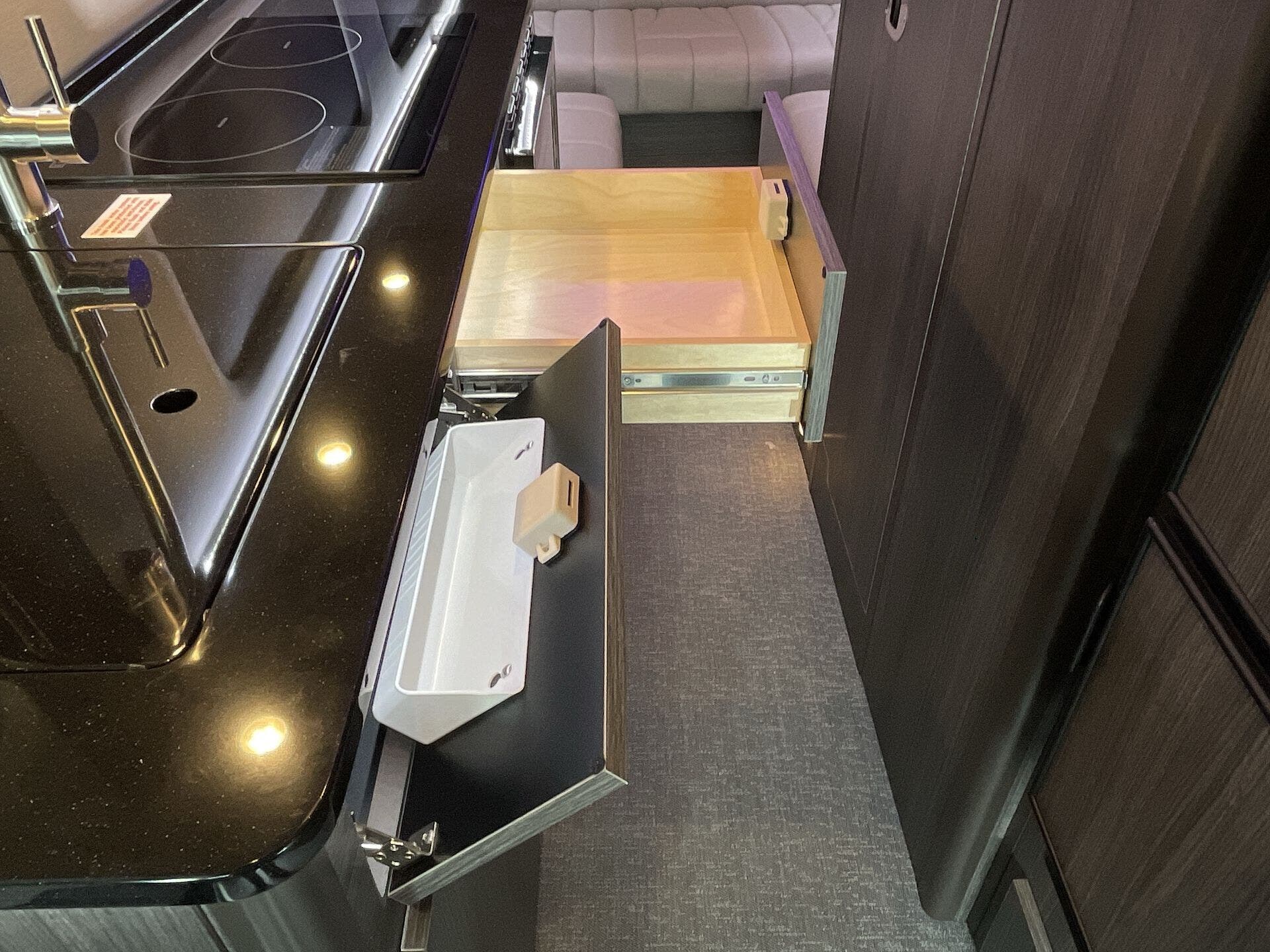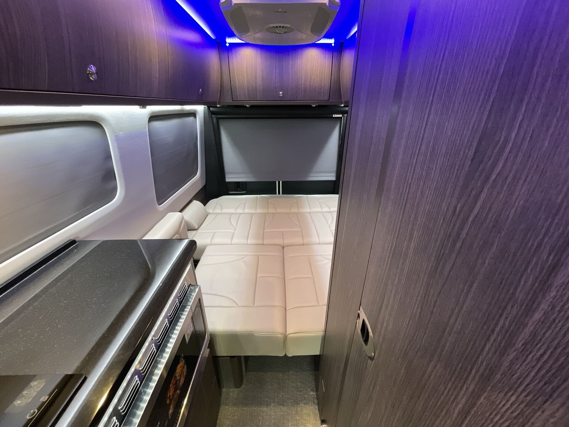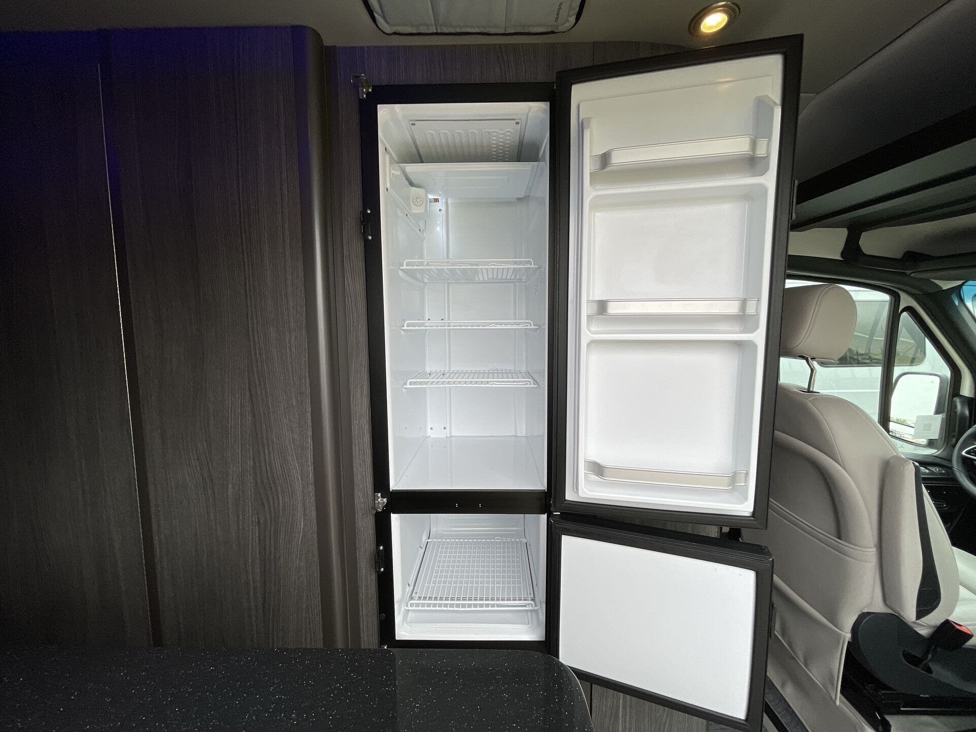 The Terreno’s thoughtfully designed interior maximizes space and functionality, making every trip enjoyable. It sleeps two comfortably, suitable for couples or solo travelers. The interior features include plush leather furniture, overhead cabinetry, a pantry, and a removable table for versatile living spaces. The full-size shower, toilet, and water capacities of 26 gallons fresh, 13 gallons black, and 27 gallons grey ensure you're well-equipped for extended adventures.