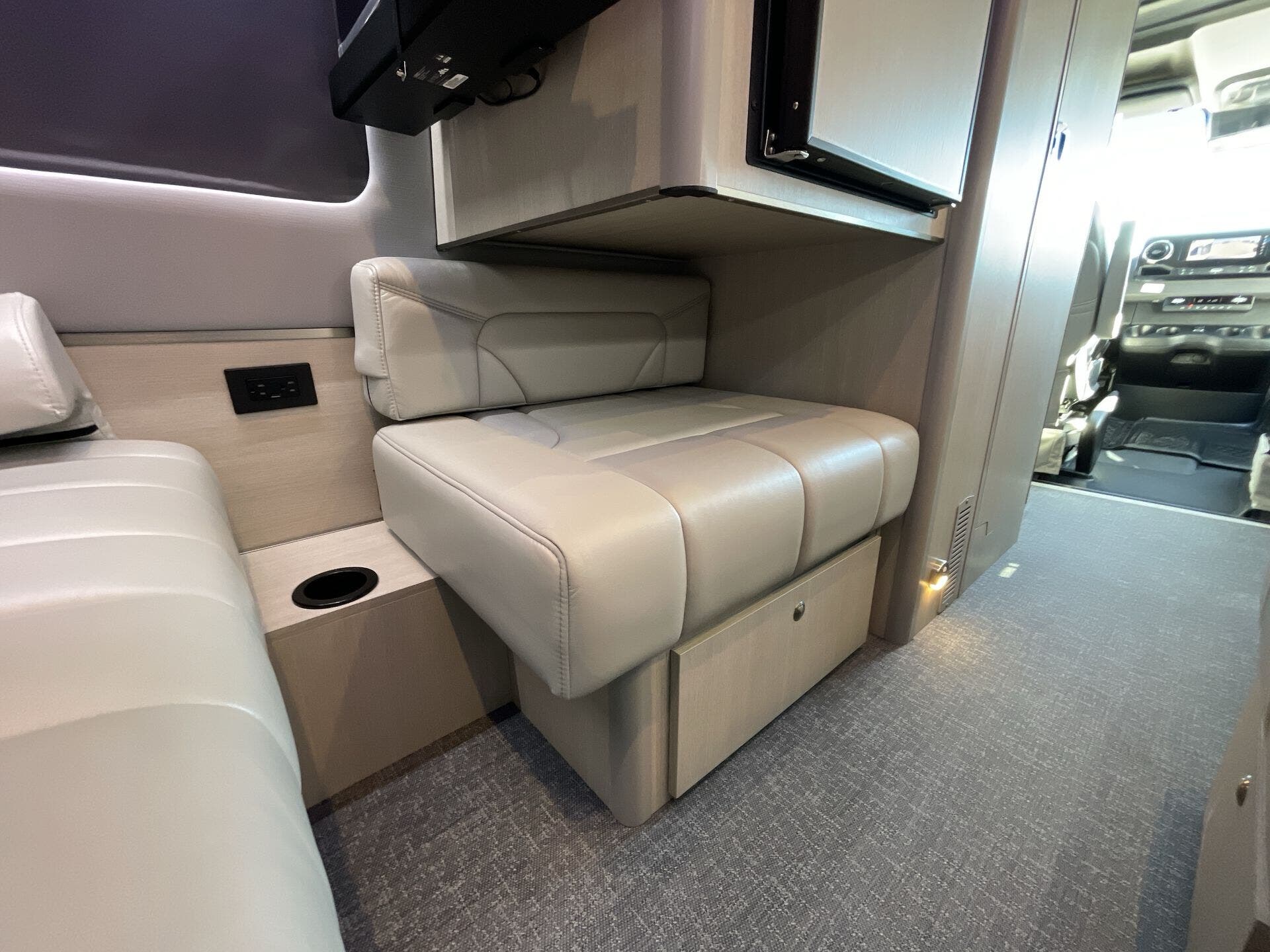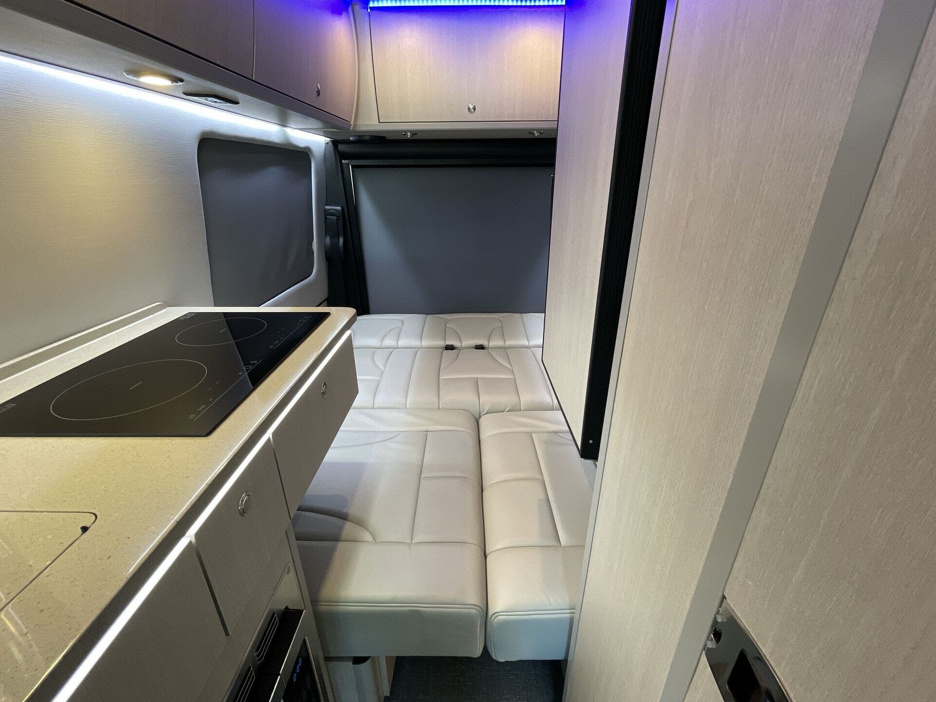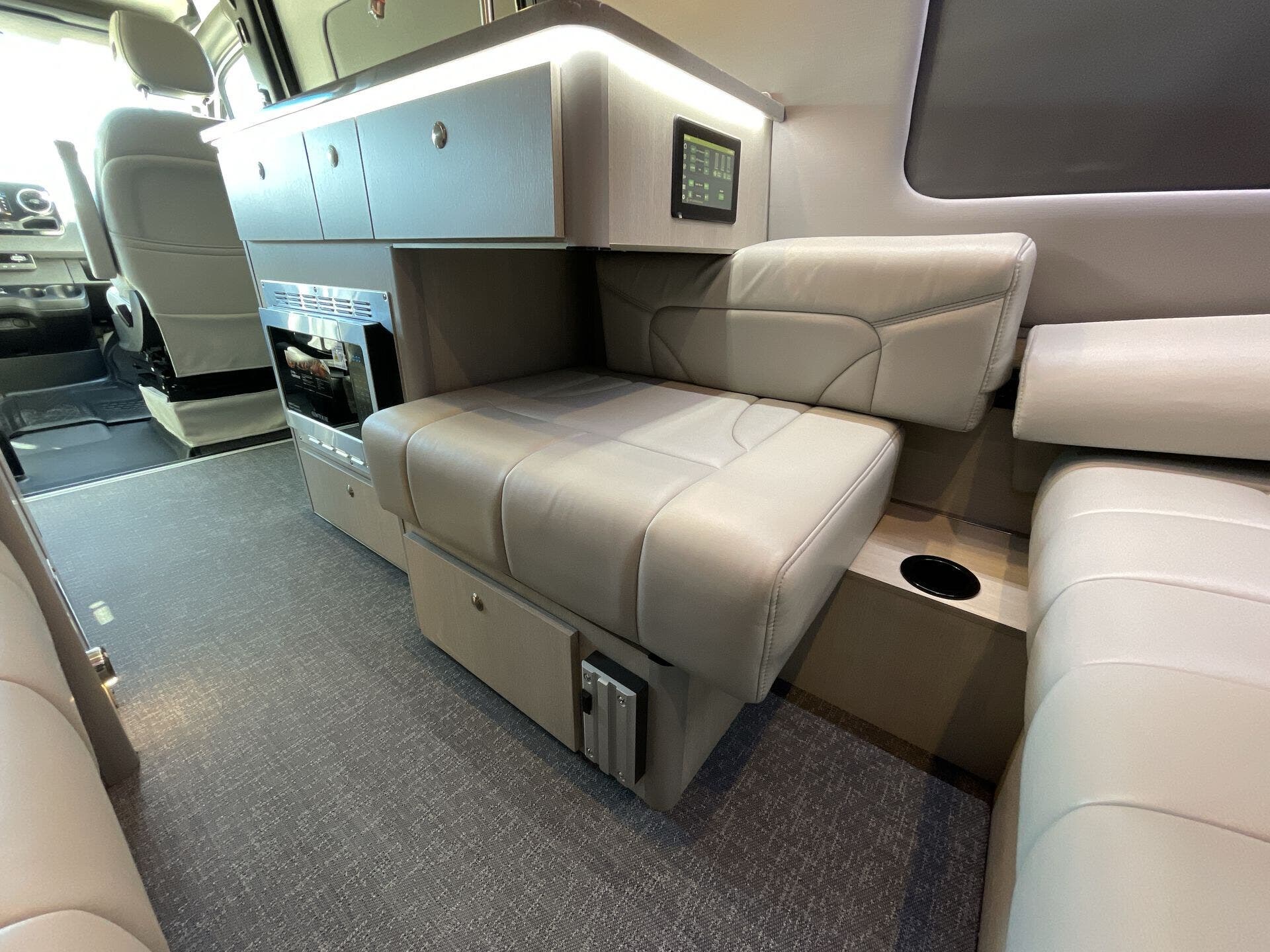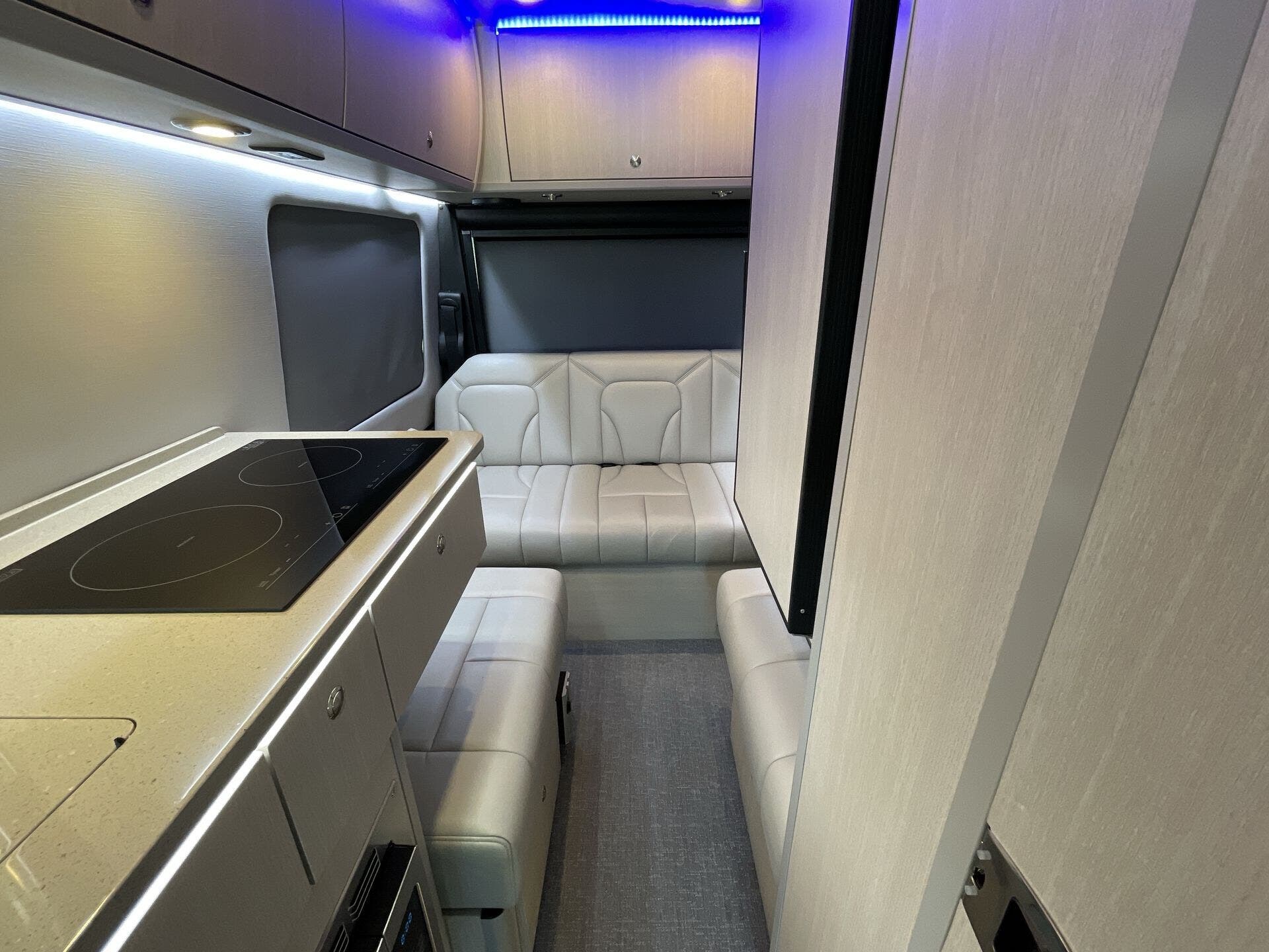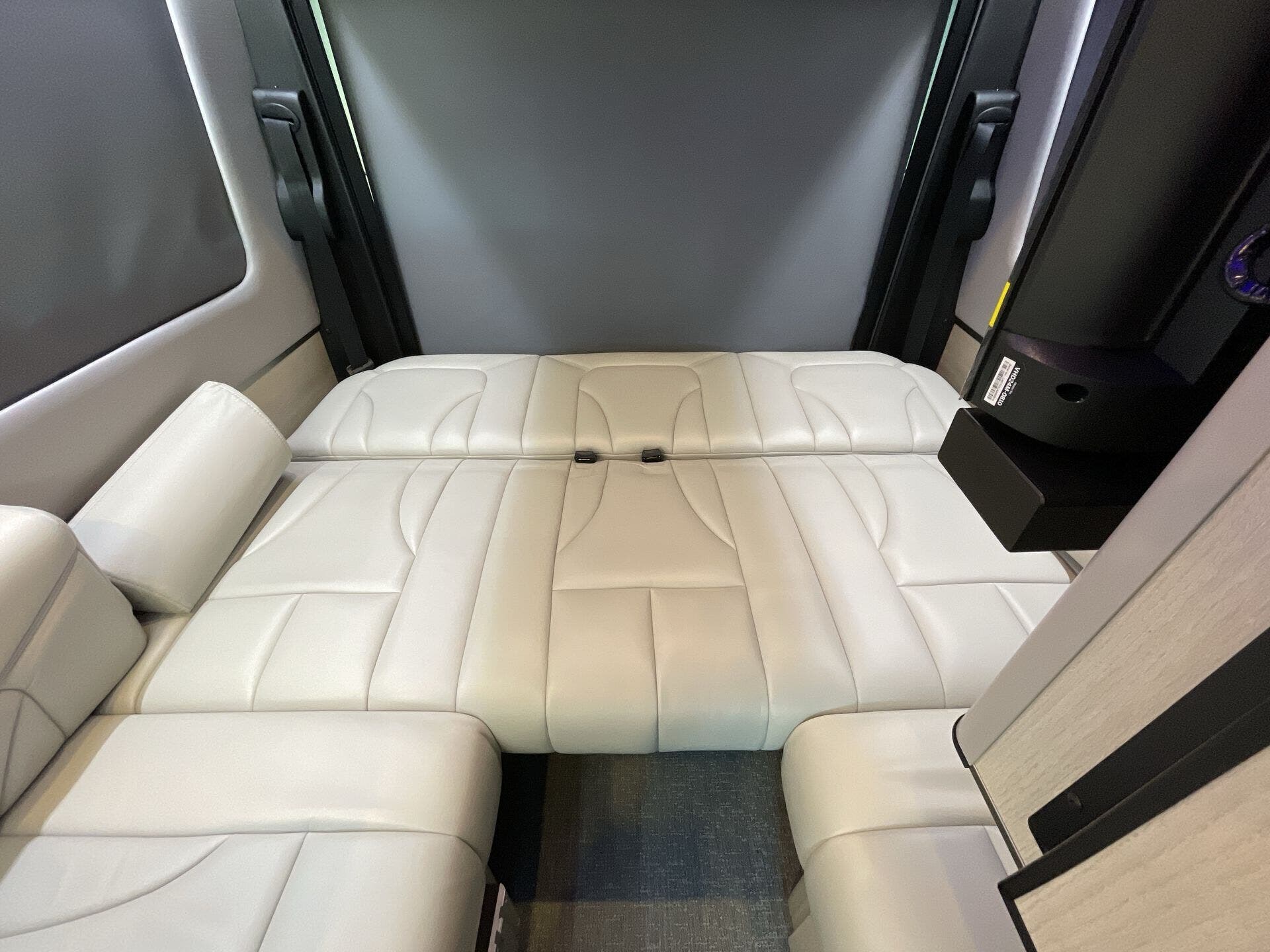 Inside, the Turismo Tour-Ion exemplifies sophisticated craftsmanship, featuring hand-stitched leather seating, sleek cabinetry, and a streamlined layout designed for comfort and functionality. Despite its compact size, the interior maximizes space with clever design elements, including a versatile seating area that converts into a sleeping space. The galley kitchen is outfitted with high-quality appliances and ample storage, while the bathroom offers a full shower and modern amenities.