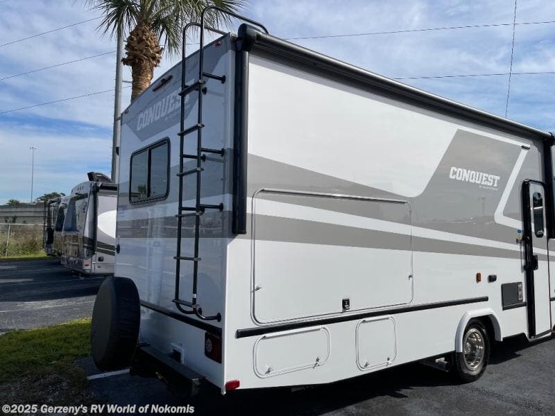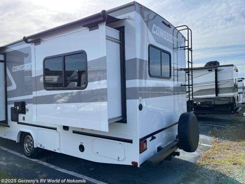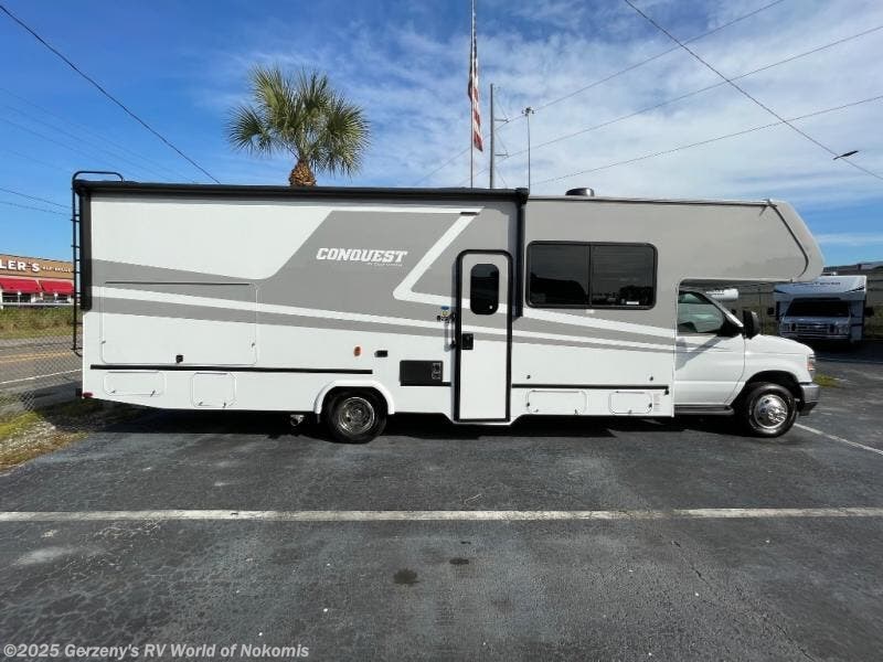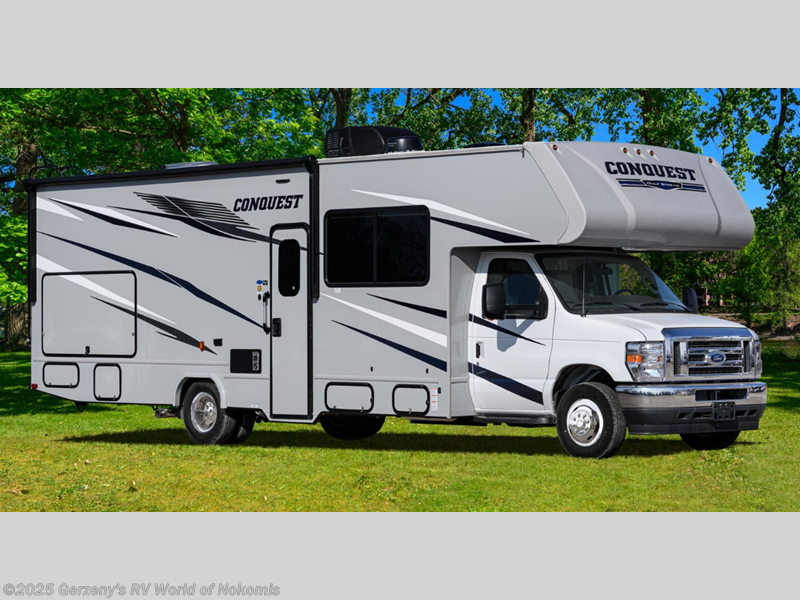 Imagine you and your family exploring new RV parks every chance you get with this Conquest Class C gas motorhome. The rear bedroom has a door that you can shut for privacy, and the separated bath has a skydome above the shower for extra room to rinse off each morning. You can cook meals on the three-burner range and visit with other RVers while relaxing on the jackknife sofa. This model also features an optional outside kitchen with a 32" HDTV!