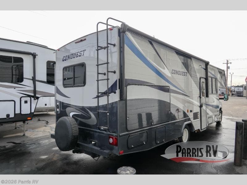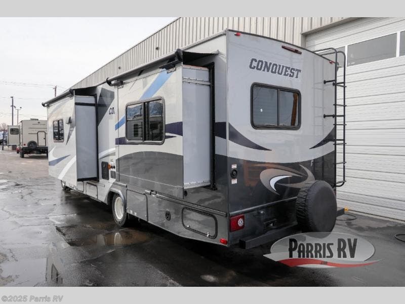 Imagine you and your family exploring new RV parks every chance you get with this Conquest Class C gas motorhome. The rear bedroom has a door that you can shut for privacy, and the separated bath has a skydome above the shower for extra room to rinse off each morning. You can cook meals on the three-burner range and visit with other RVers while relaxing on the jackknife sofa. This model also features an optional outside kitchen with a 32" HDTV!