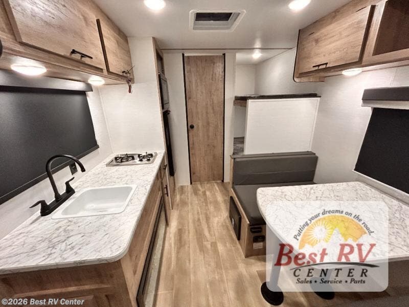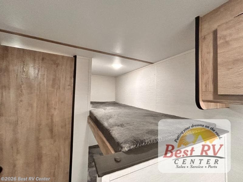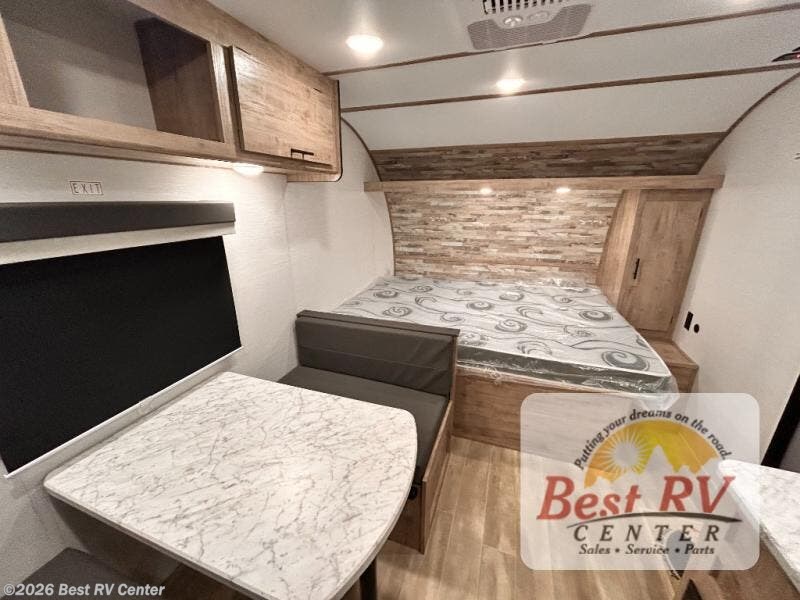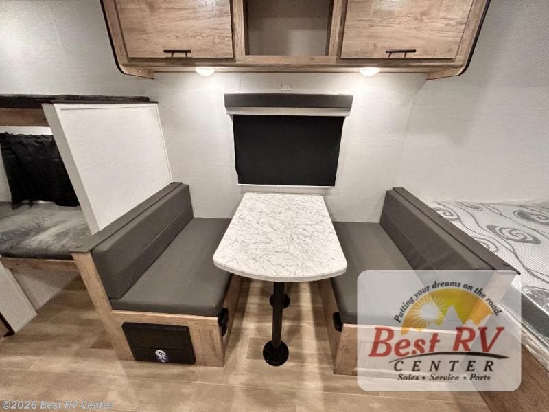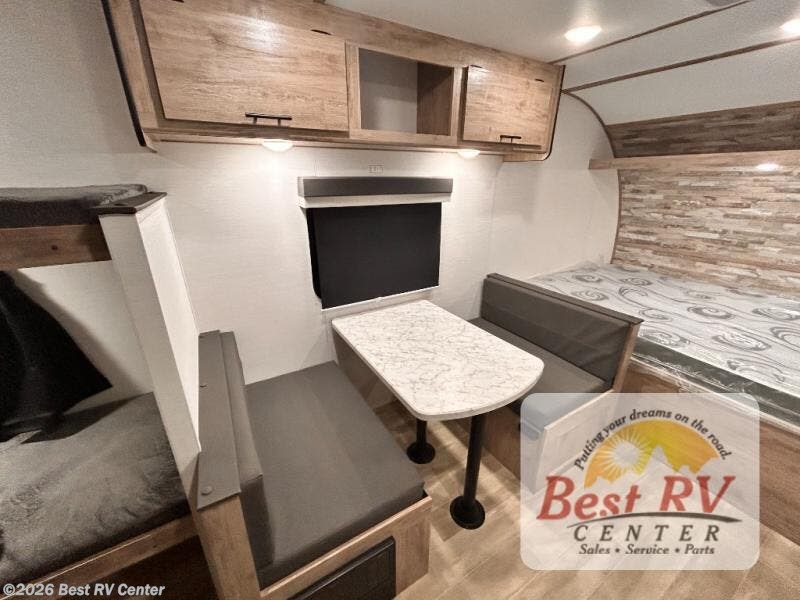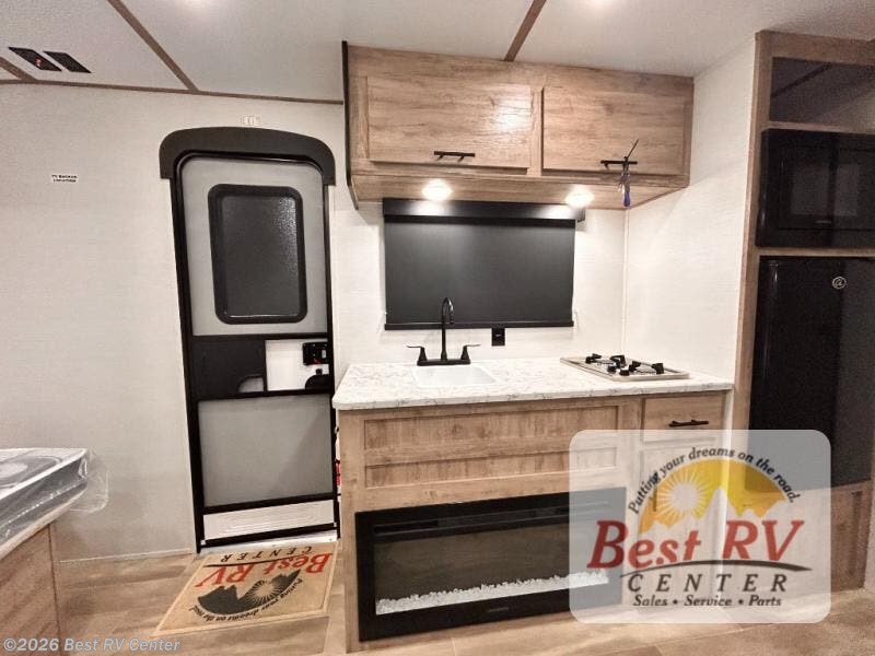 It's easier than ever to enjoy the camping lifestyle with this lightweight travel trailer. There are bunk beds for your guests or little ones, a front bed for you, plus a booth dinette that can double as dining and sleeping space. The private toilet and shower will allow you to stay clean throughout each trip, and since the sink is at the kitchen counter, someone can brush their teeth while the other showers before bed. You will love the fireplace included in this model for a more at-home feel, or you just might find yourselves outdoors under the power awning most of the day!