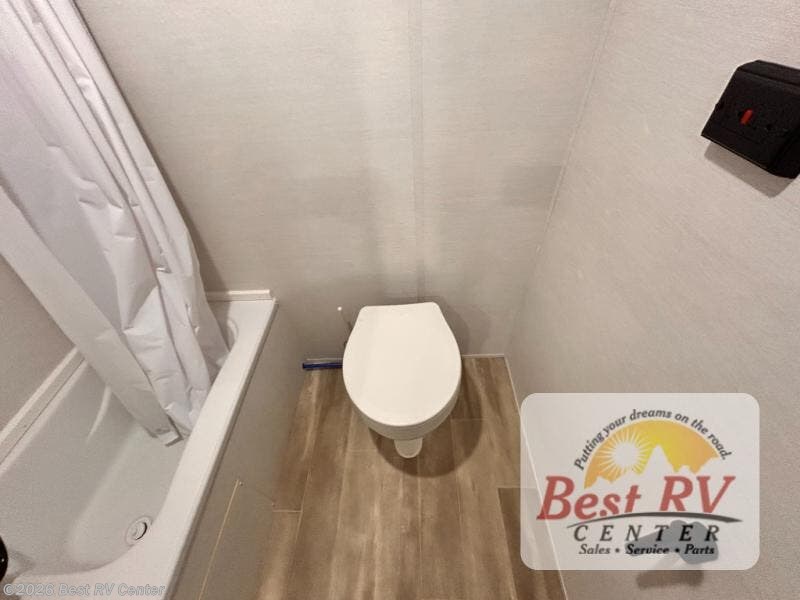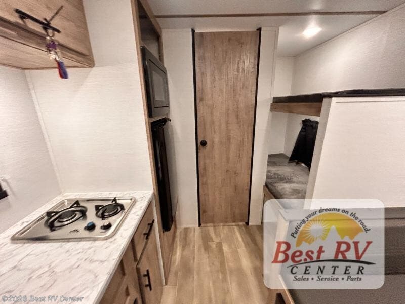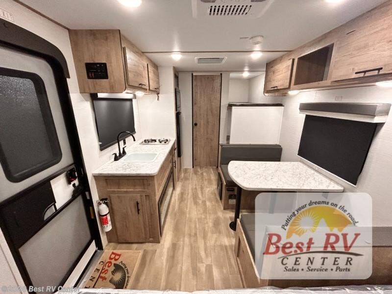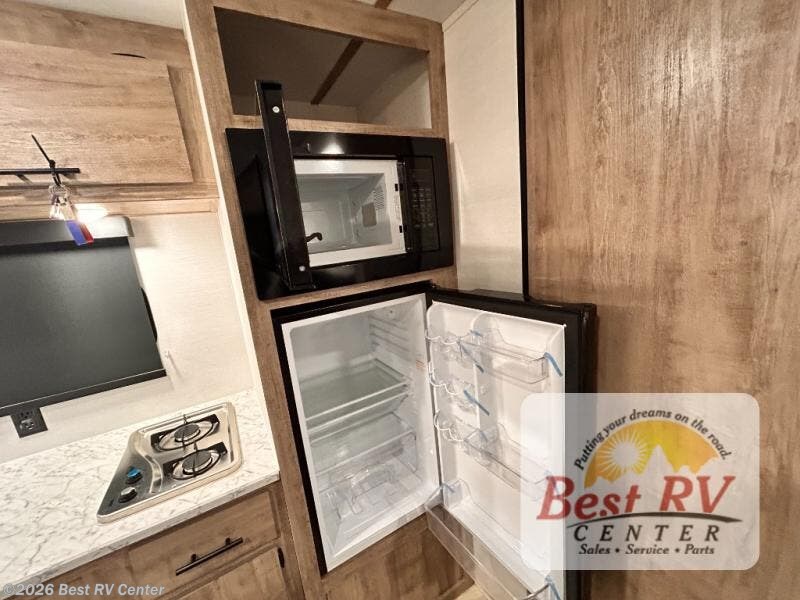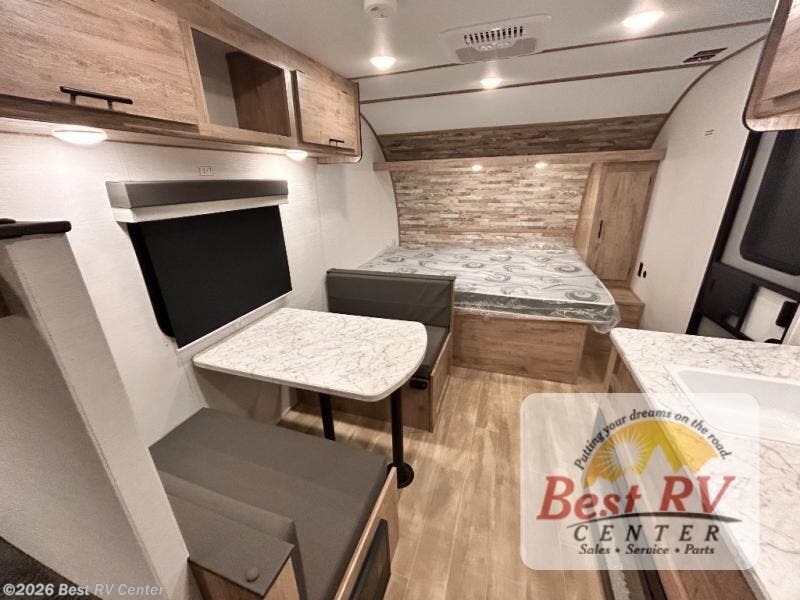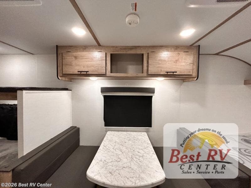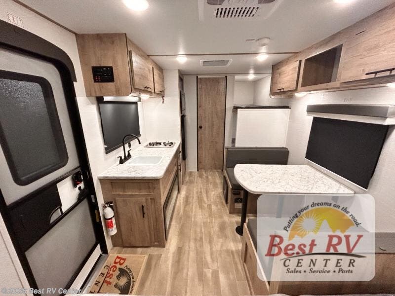 It's easier than ever to enjoy the camping lifestyle with this lightweight travel trailer. There are bunk beds for your guests or little ones, a front bed for you, plus a booth dinette that can double as dining and sleeping space. The private toilet and shower will allow you to stay clean throughout each trip, and since the sink is at the kitchen counter, someone can brush their teeth while the other showers before bed. You will love the fireplace included in this model for a more at-home feel, or you just might find yourselves outdoors under the power awning most of the day!