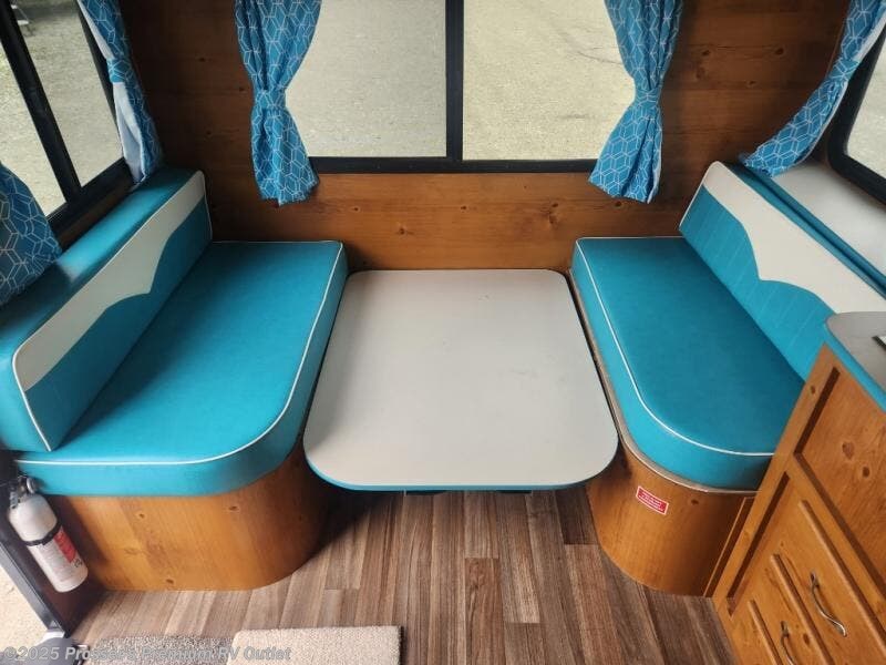 If you enjoy a more classic look for an RV, you'll love this Vintage Cruiser 19ERD. The rear booth dinette is surrounded by windows for bright, open views, and you'll find overhead storage here for dry goods or snacks. The chef of your group will have a cooktop and a microwave oven to prepare meals. The private toilet and sink is right across the hall from the 24" x 36" shower so two people can freshen up at once. How convenient! This model also features a semi-private front bedroom with a privacy curtain for your own space, plus an RV queen bed and dual shirt closets to keep your clothes tidy!