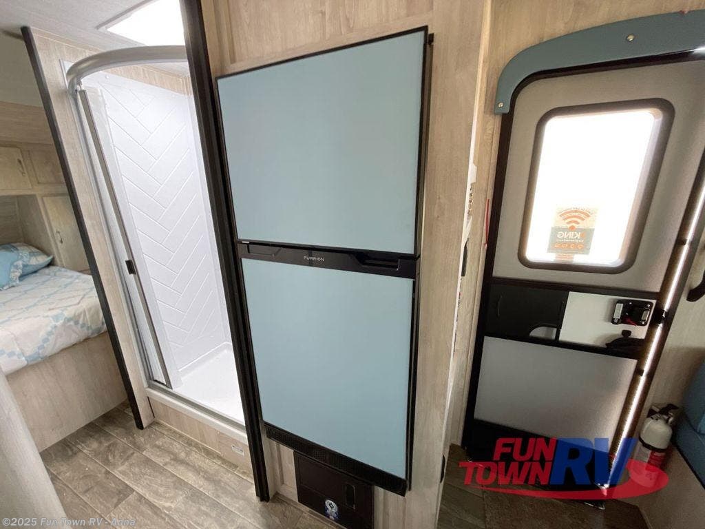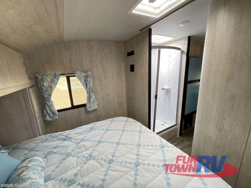 If you enjoy a more classic look for an RV, you'll love this unit. The rear booth dinette is surrounded by windows for bright, open views, and you'll find overhead storage here for dry goods or snacks. The chef of your group will have a cooktop and a microwave oven to prepare meals. The private toilet and sink are right across the hall from the 24" x 36" shower so two people can freshen up at once. This model also features a semi-private front bedroom with a privacy curtain for your own space, plus an RV queen bed and dual shirt closets to keep your clothes tidy!